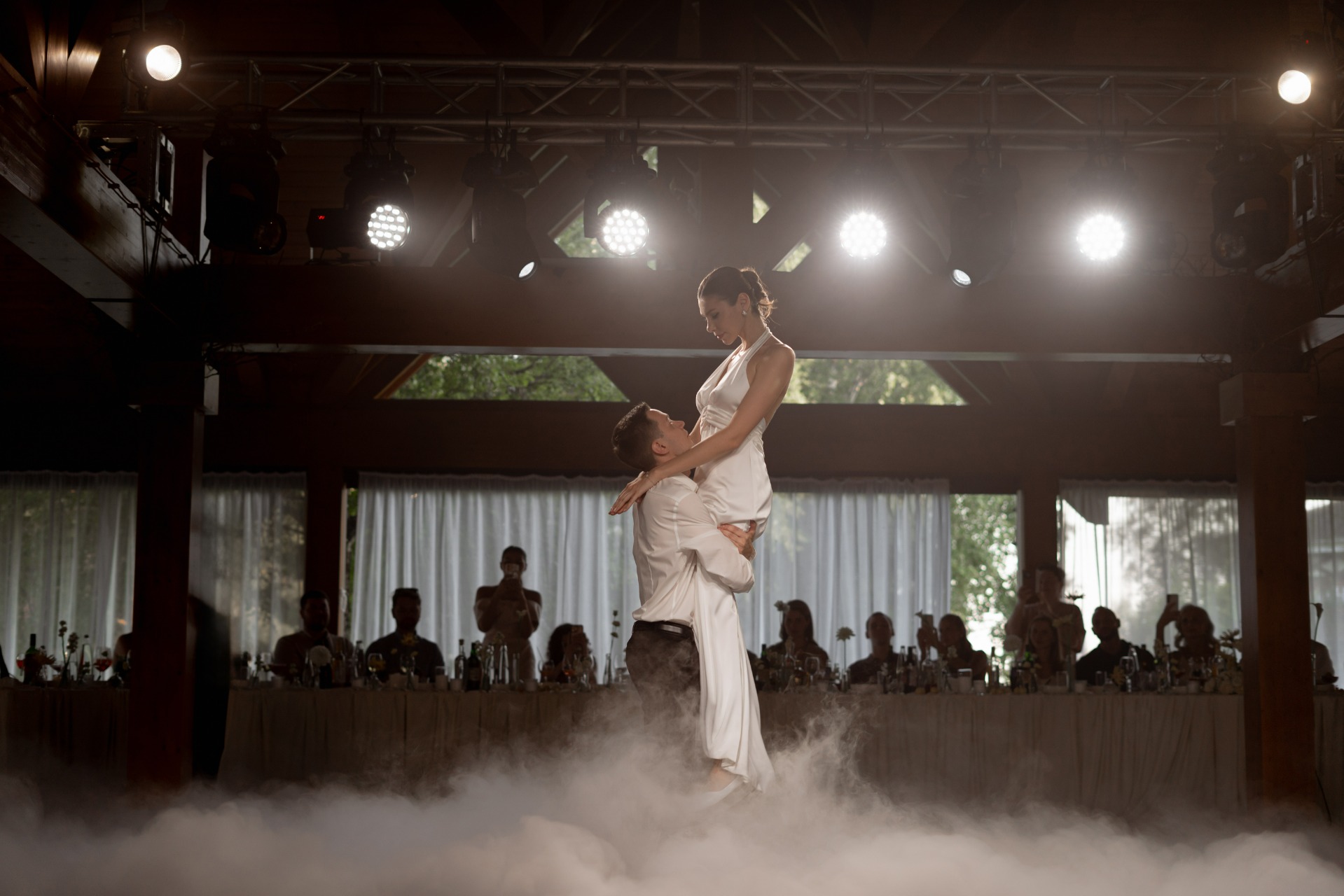 Одной из фишек нашей свадьбы стал необычный свадебный стол. Нам было важно быть частью праздника, поэтому мы приняли решение отказаться от классического президиума и рассадки. Все гости сидели с нами за единым столом, который изготавливался специально под нашу свадьбу.