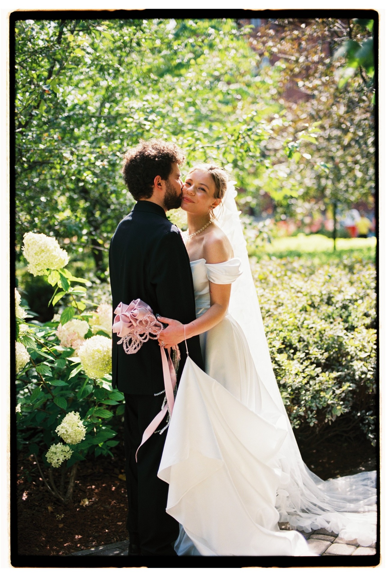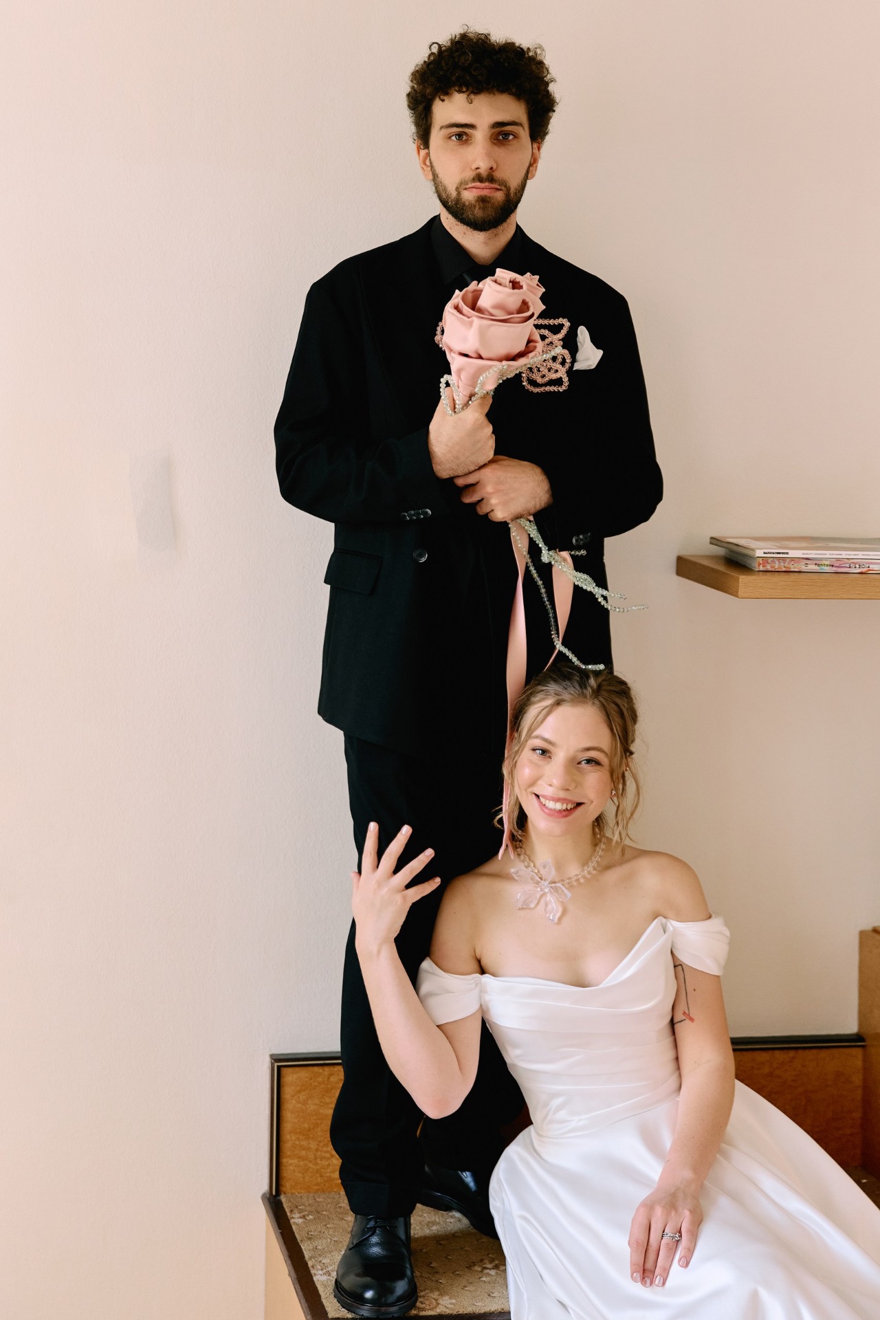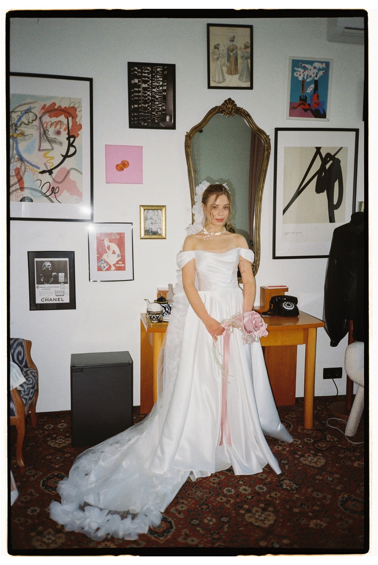 Главным акцентом моего образа стал неувядающий букет. Я увидела похожий у одной невесты в социальной сети свадебного агентства и влюбилась. Он напоминал мне букет из коллекции Simone Rocha SS’24: атлас, бусины, изящные цветы. Я написала агентству, они поделились контактом флориста, и мы с Настей и её сестрой Анной обсудили каждую деталь: форму листьев, размер бутонов, оттенок жемчуга. В итоге получился мой идеальный «вечный» букет.