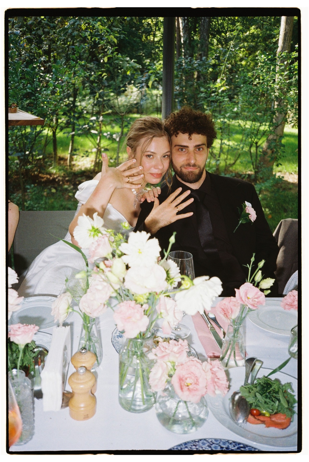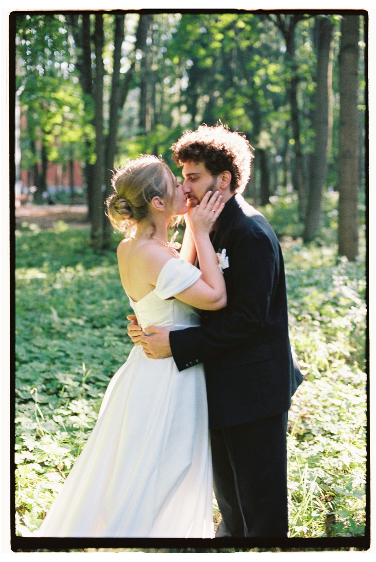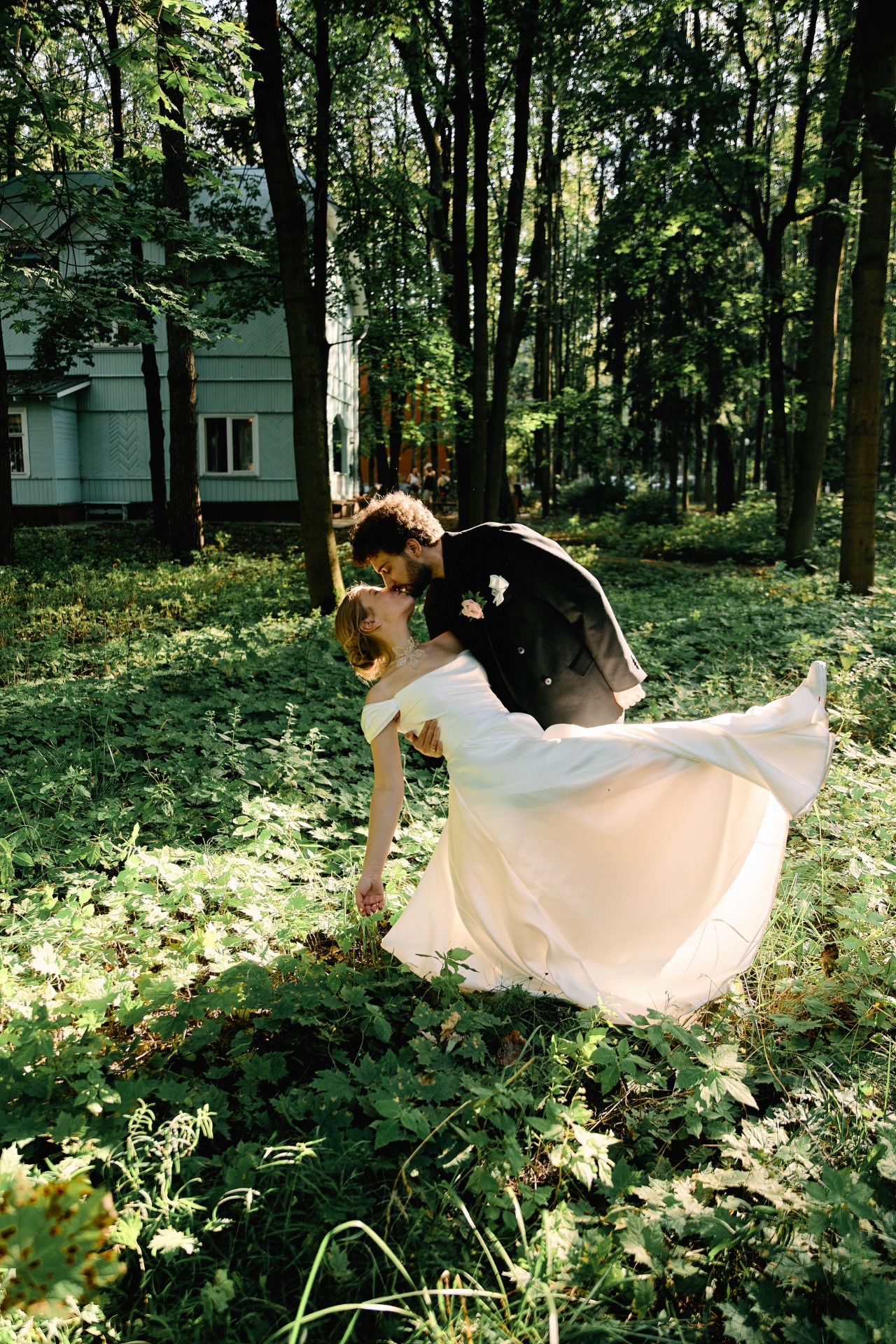 После росписи мы поехали в Переделкино, на веранду ресторана «Библиотека». Мы живём рядом и часто приезжаем туда на велосипедах. Нам хотелось отметить этот день на лесной площадке, и это место идеально вписалось в нашу концепцию.