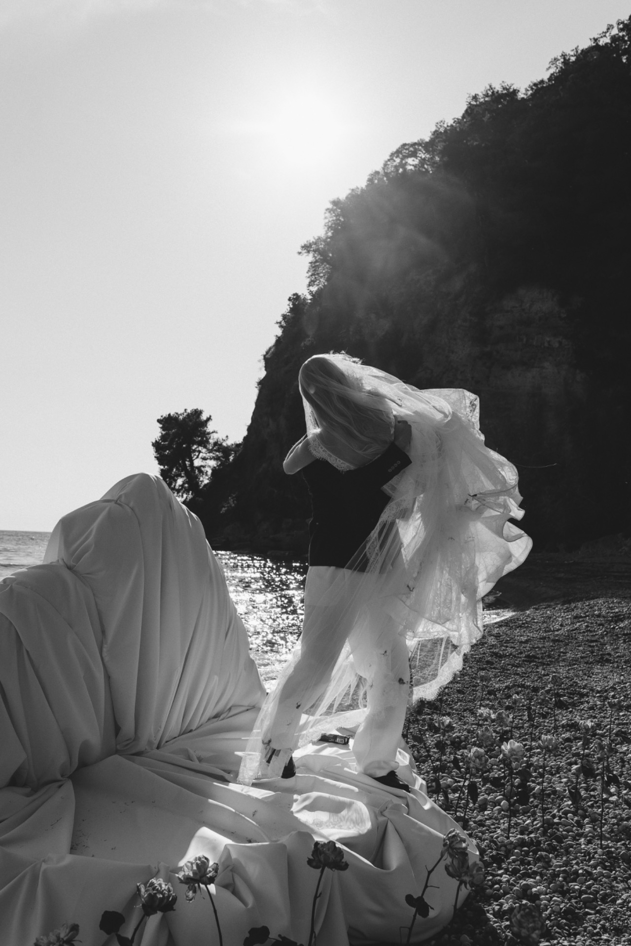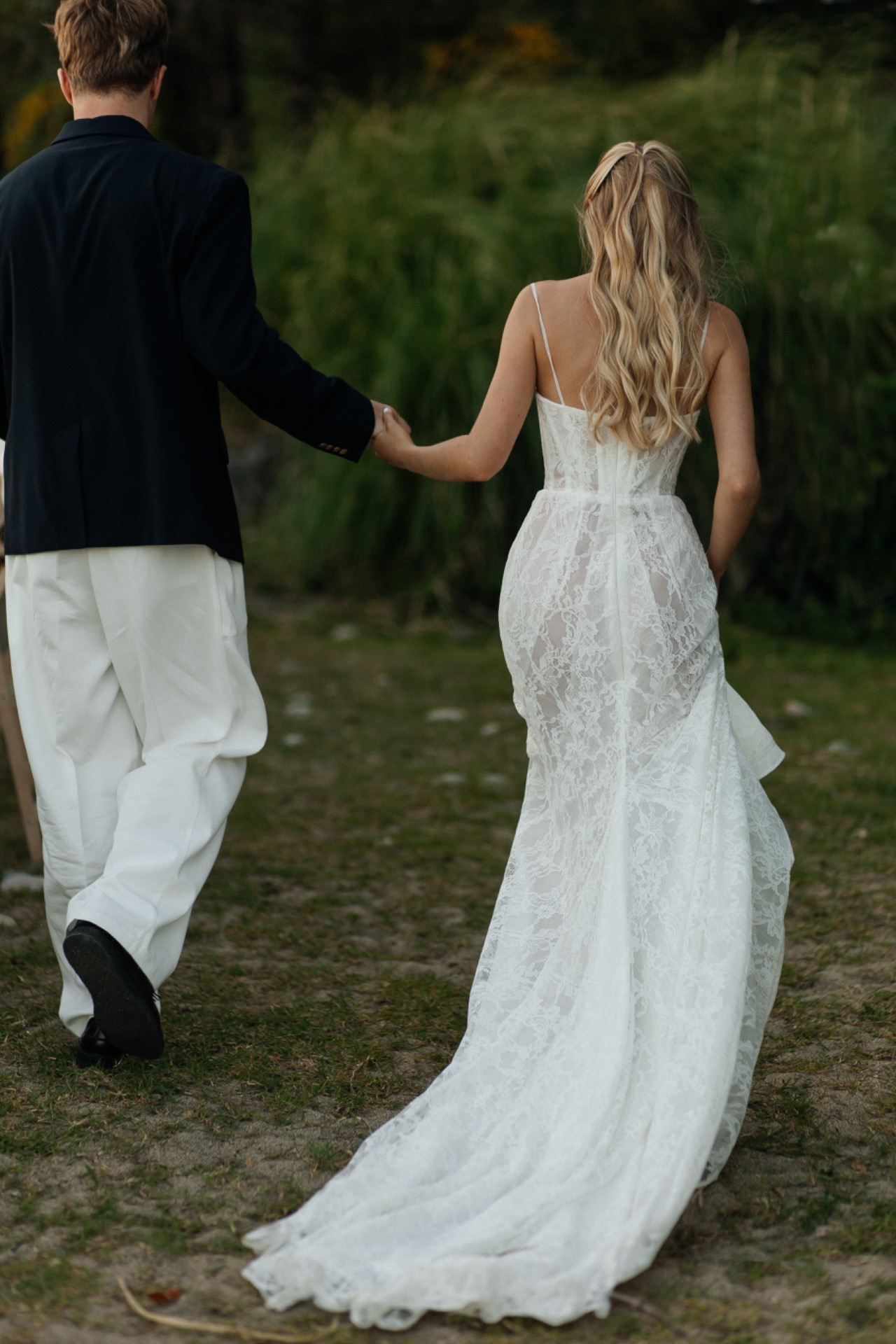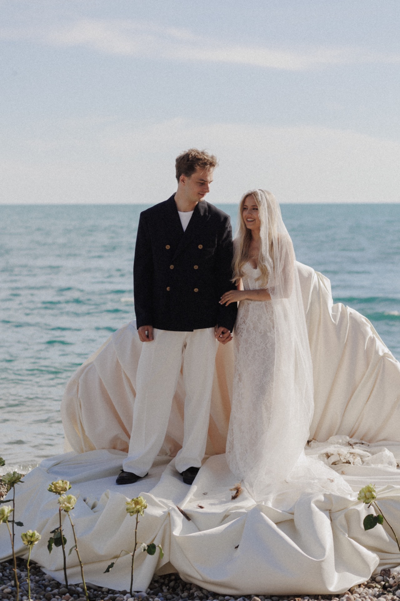 Основное платье было кружевным, от дизайнера Натальи Романовой, за которым мы ездили в другой город. Полупрозрачная ткань идеально вписалась в лёгкую морскую эстетику. Второе платье было от талантливых ребят из ателье L A • C E .