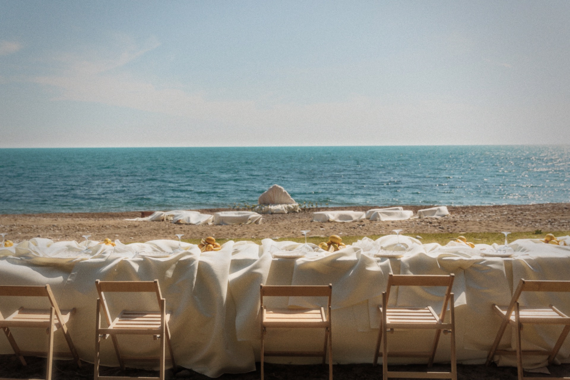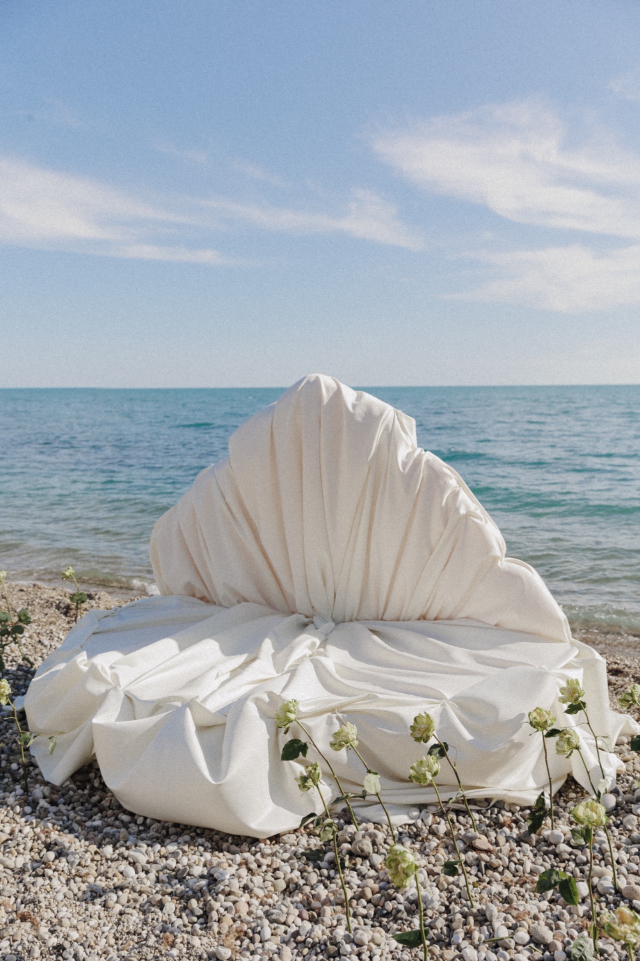 Концепцию SOLO NOI («Только мы») придумали организаторы: «Только мы и больше ничего не нужно. Любовь стала не просто чувством, а естественным состоянием». В визуальном коде мы хотели передать красоту вне правил: идеальное несовершенство, стиль без выверенной симметрии, атмосфера в центре всего. Итальянская лёгкость, южный колорит, бежево-оранжево-жёлтый дресс-код. Зону церемонии мы выбрали самую сложную: подиум в форме ракушки, вдохновлённый картиной Боттичелли «Рождение Венеры». Референсов не было, эскиз ребята отрисовывали вручную.