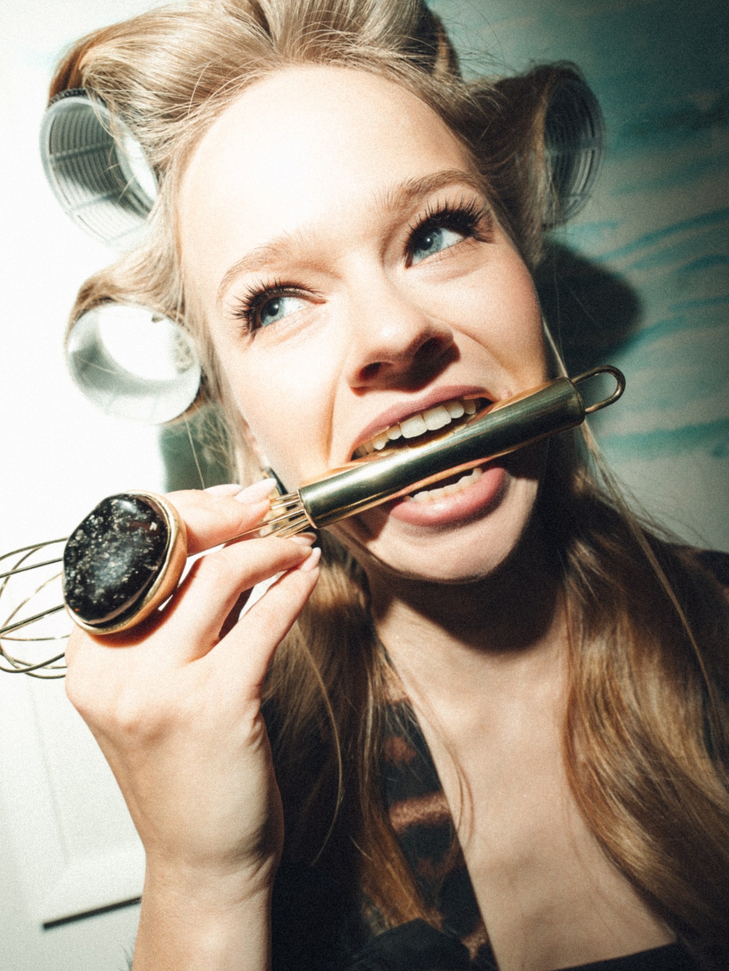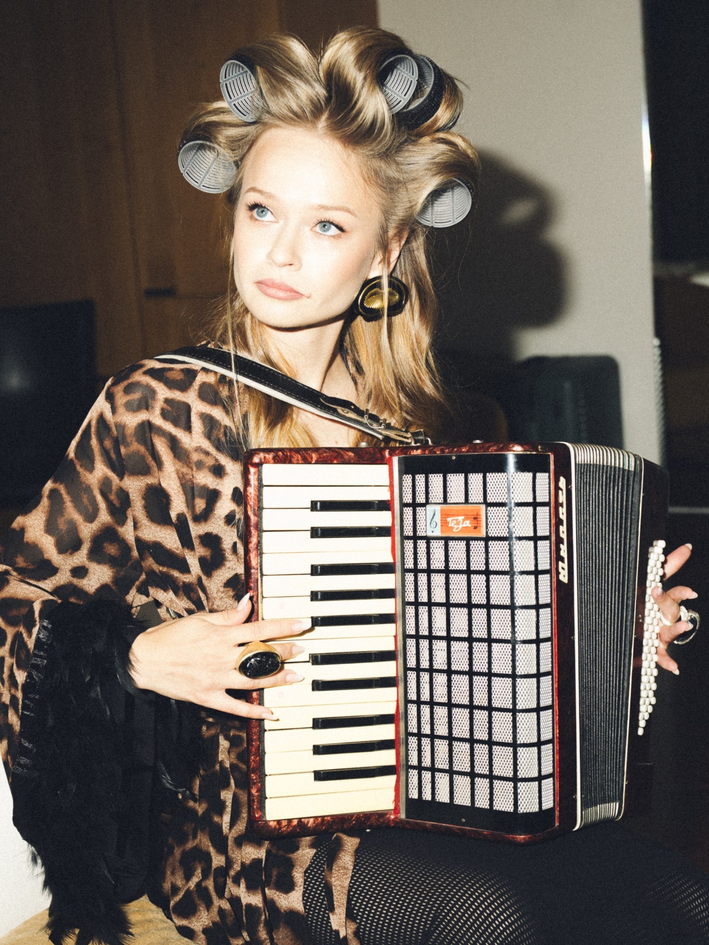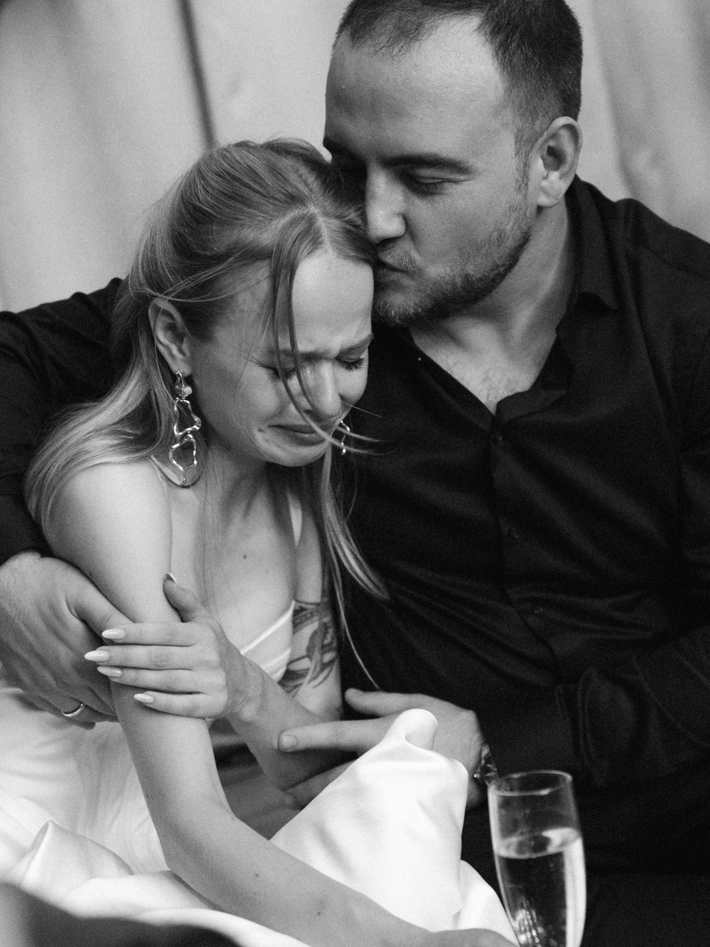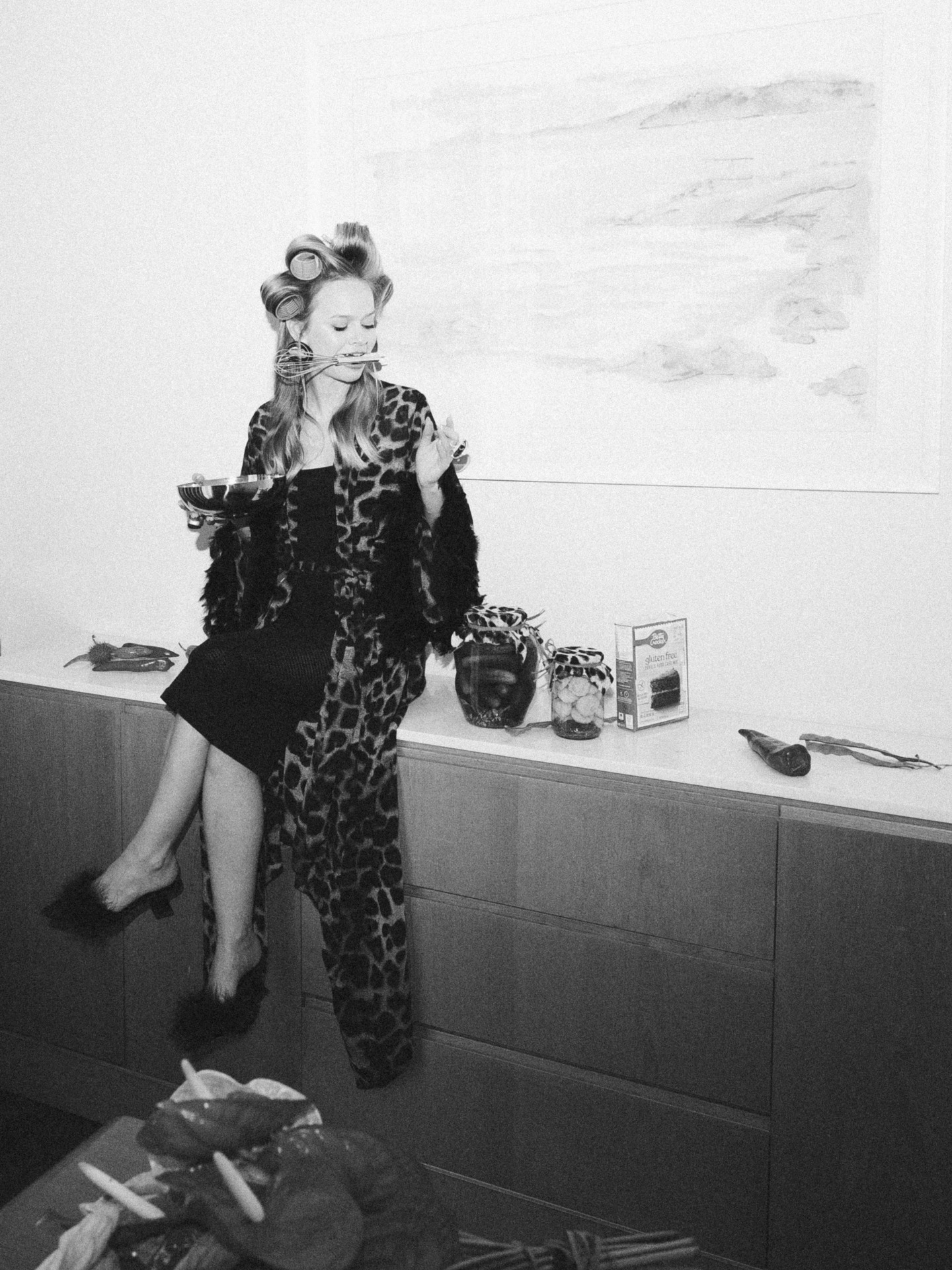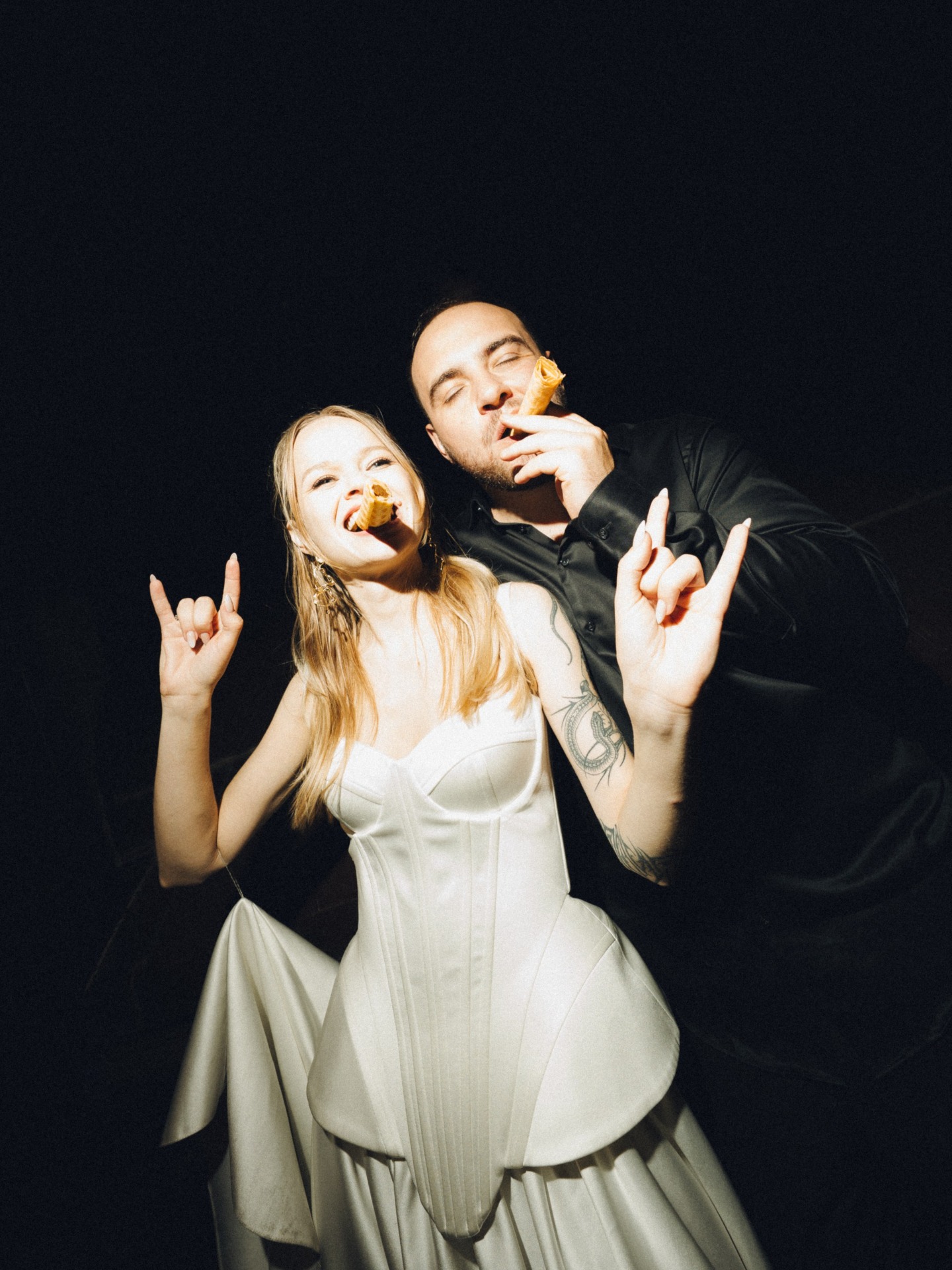 У нас были очень необычные образы на утренней фотосессии. Мы выбрали для себя съёмку в стиле роскошной люксовой бытовухи. Я была одета в леопардовый халат в пол и тапочки с перьями и при этом находилась в антураже «домашних дел»: например, месила тесто для пирога в бигудях. А Никита кайфовал рядом в пиджаке и трусах с подтяжками.