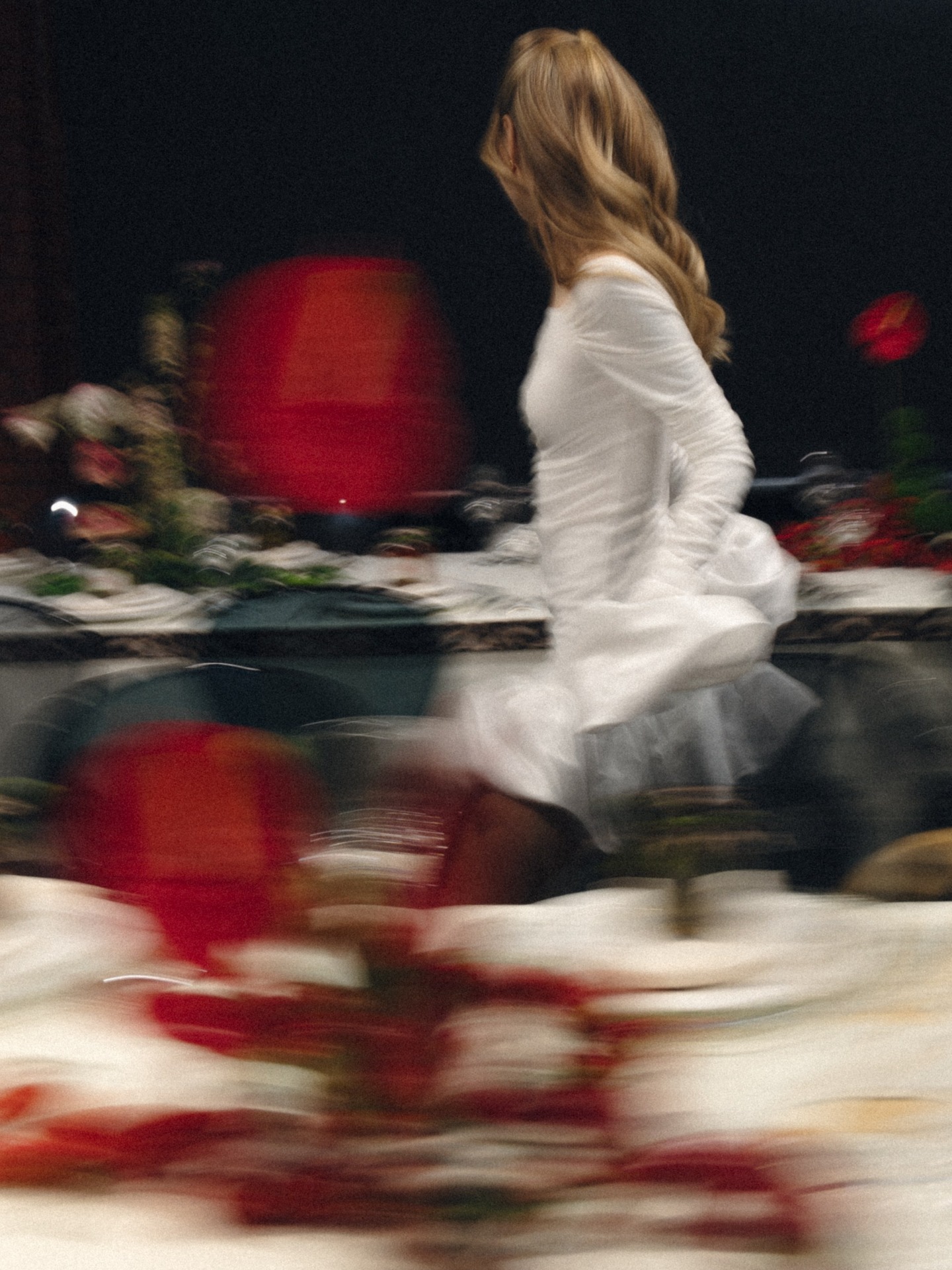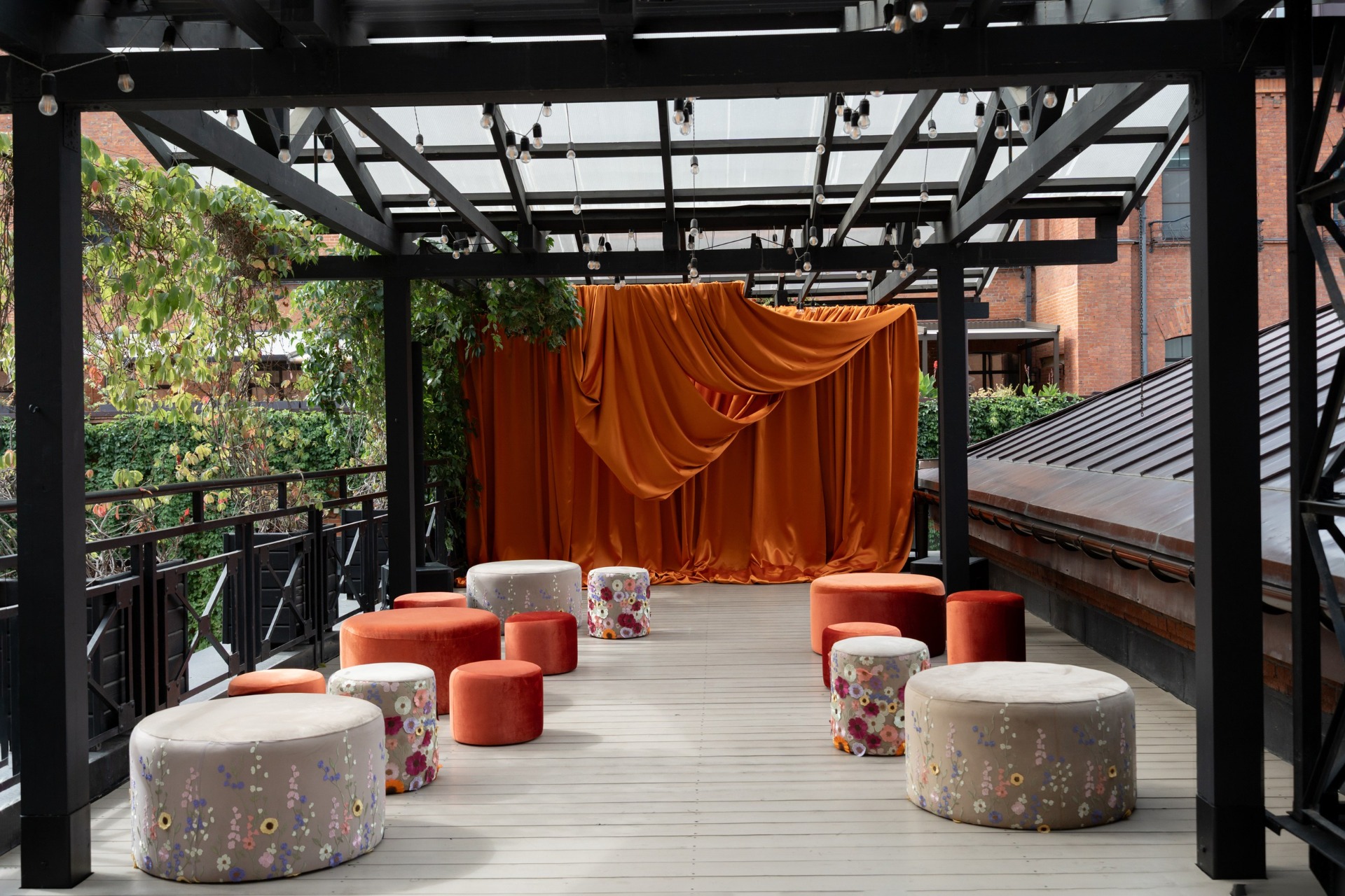 Зона церемонии представляла собой яркую, сочную оранжевую драпировку с пуфами, покрытыми цветами. Она стала отсылкой к цветочным полям Нидерландов.