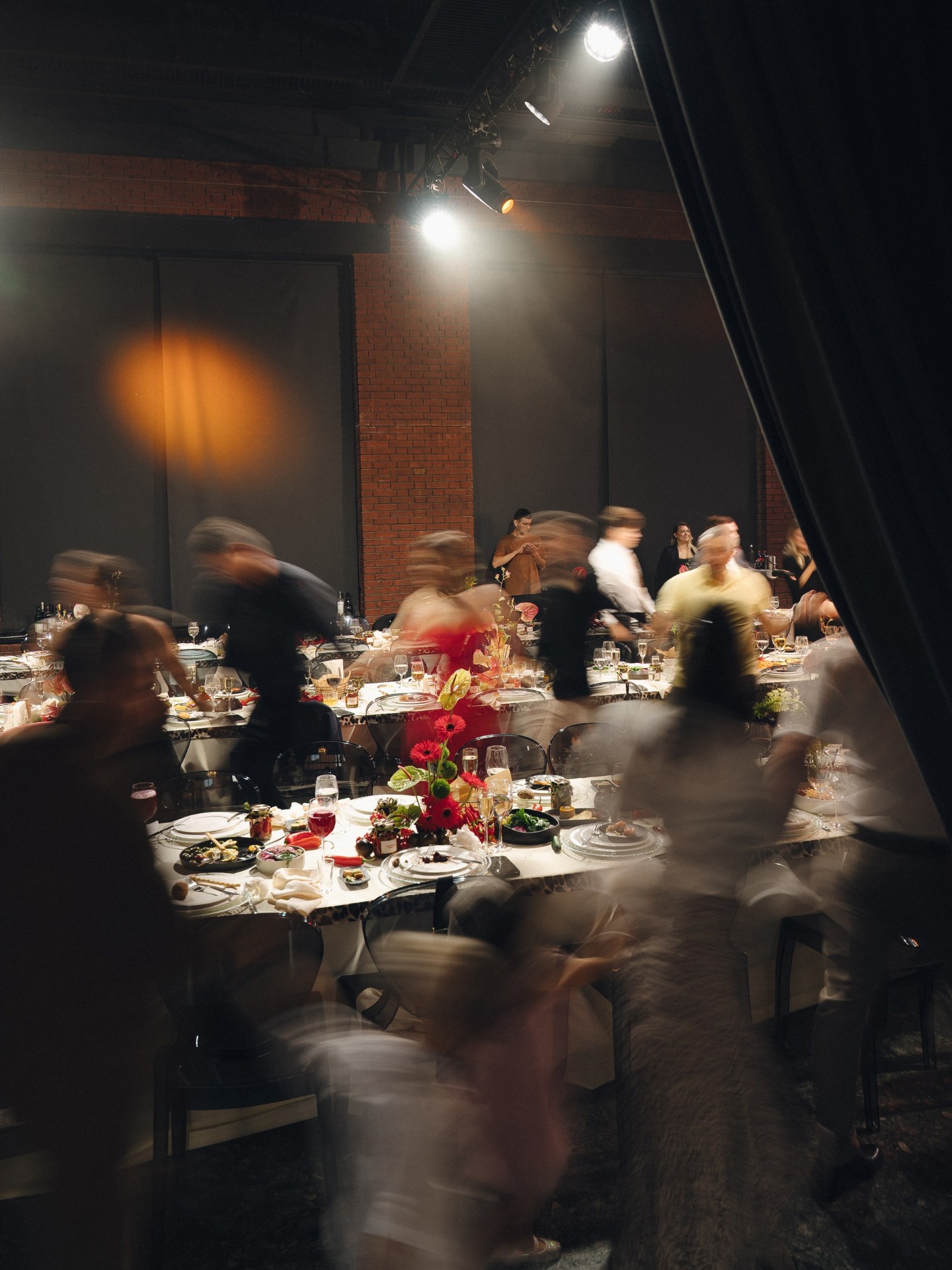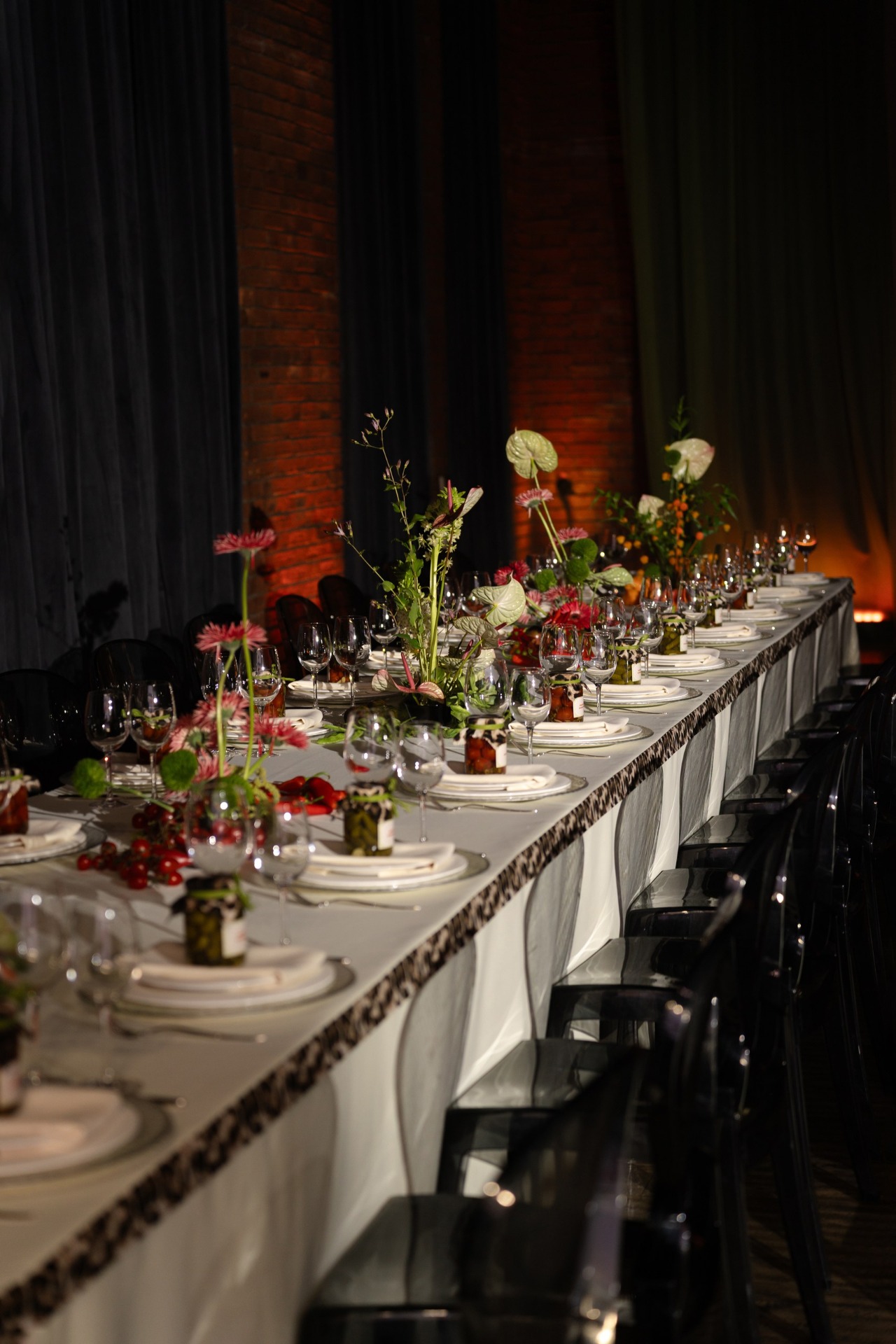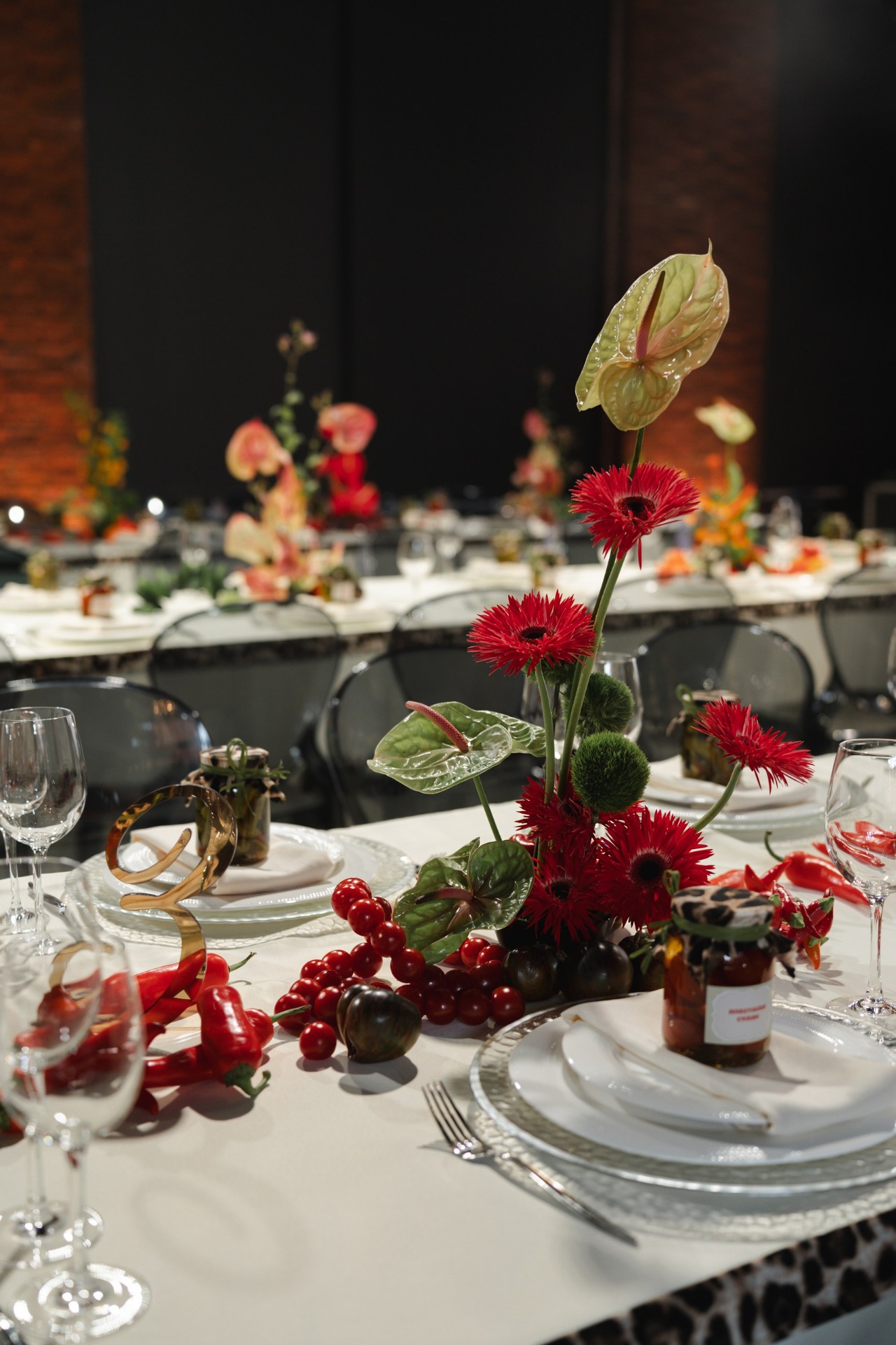 В зале нас встречала феерия и тот самый яркий и смелый микс — скатерти с леопардовым кантом, карточки рассадки в виде банок с соленьями с леопардовой шапочкой на крышке и яркие композиции с использованием перцев чили!
