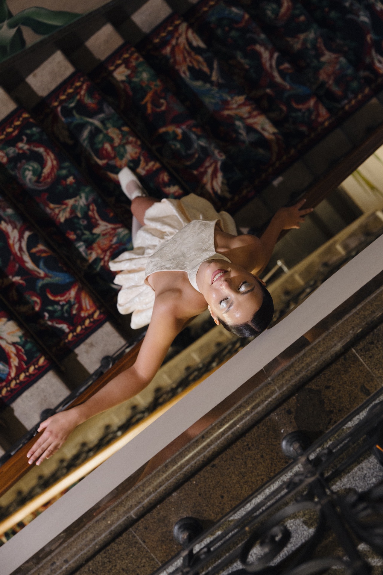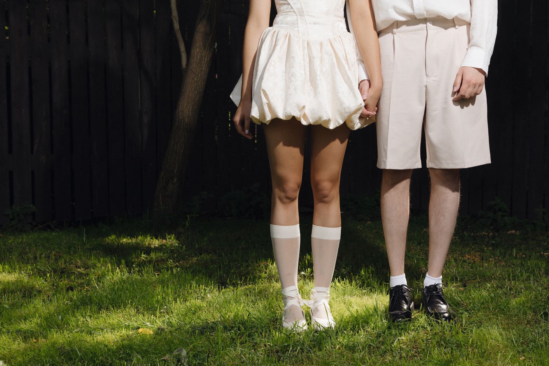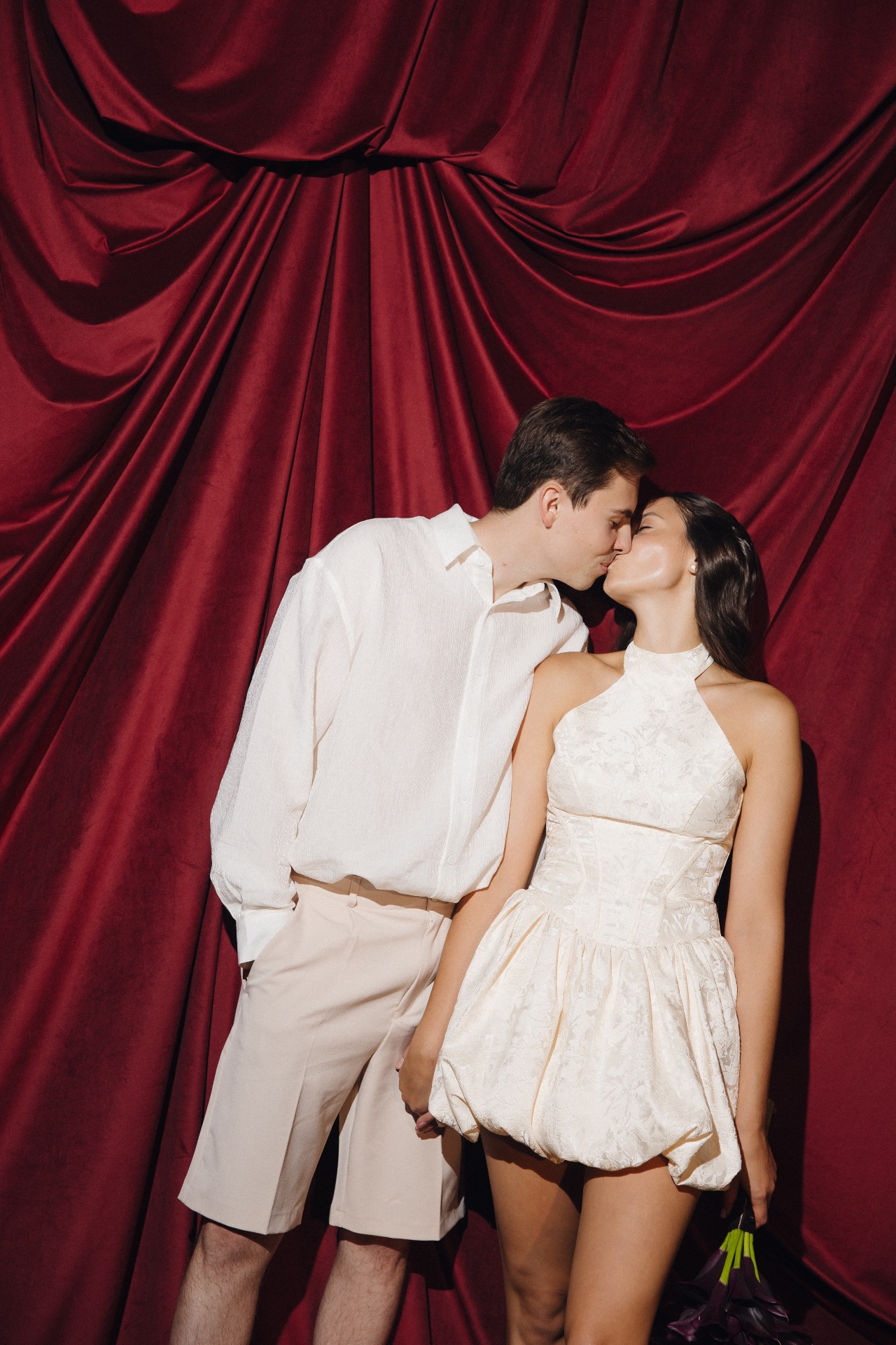 Для фотосессии я выбрала платье в стиле рококо и балетки-пуанты. Макияж был в естественных тонах, а причёска — с лёгкими локонами. А для Никиты мы подобрали бежевые бермуды и рубашку с люрексом.
