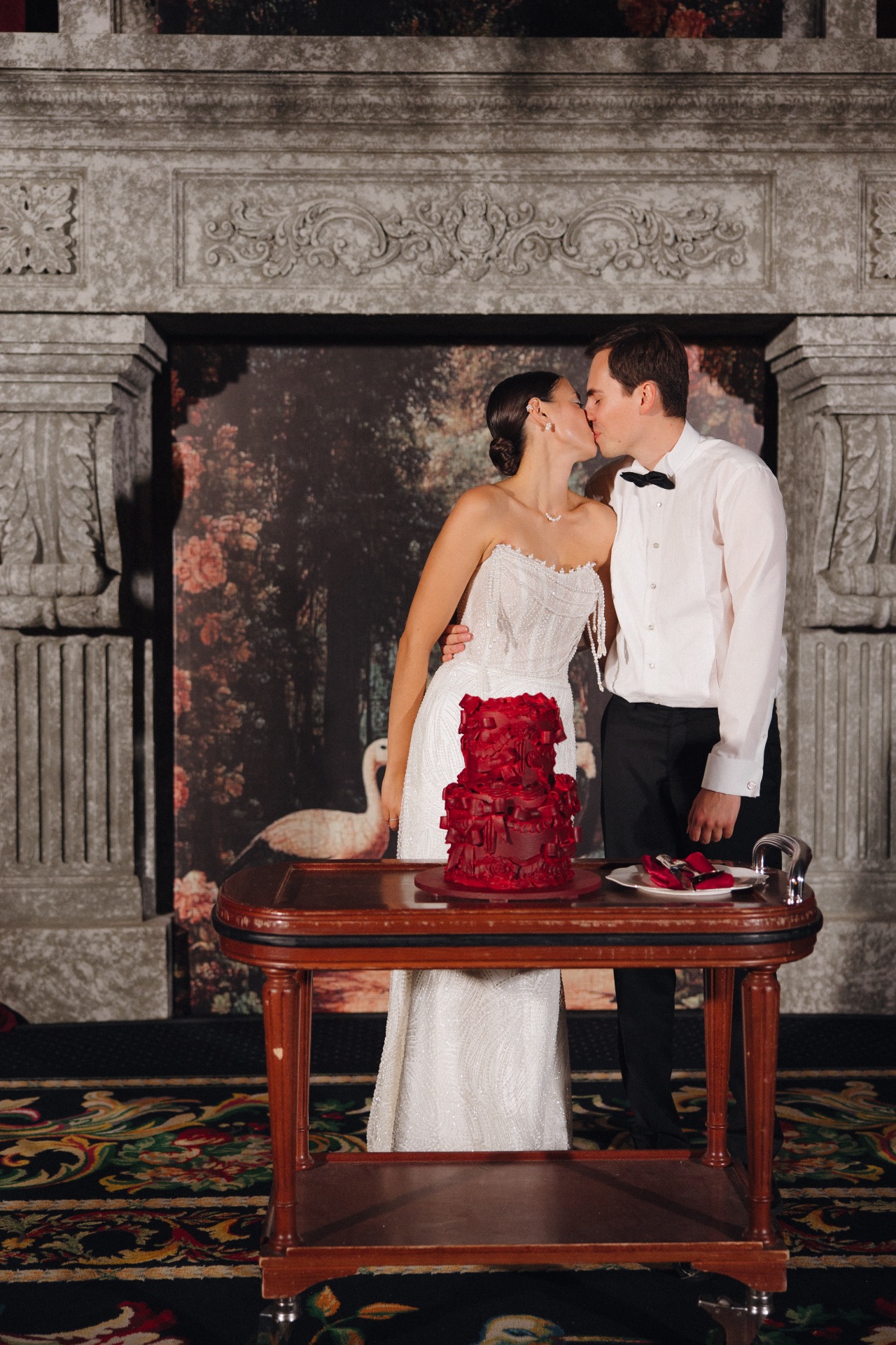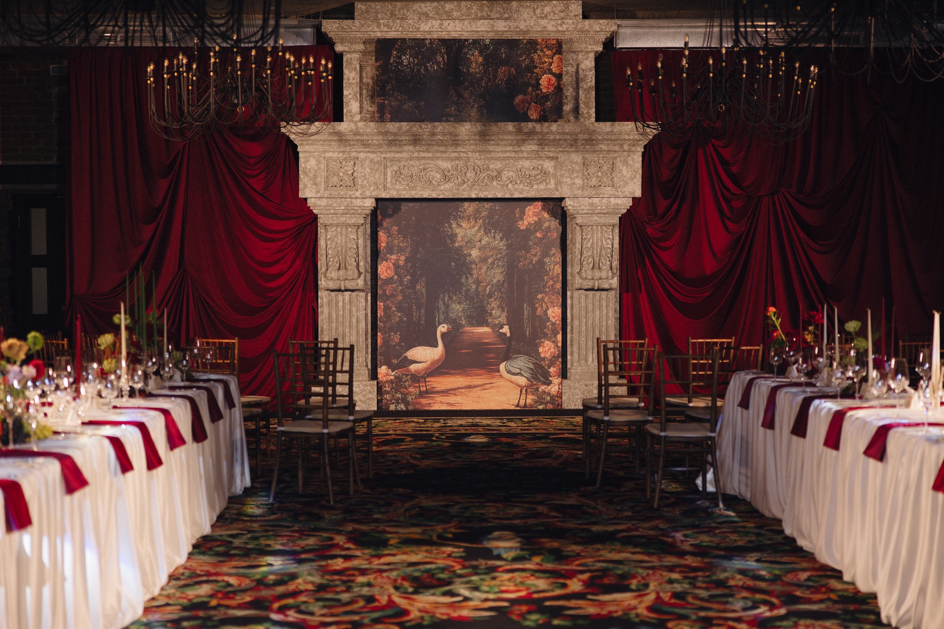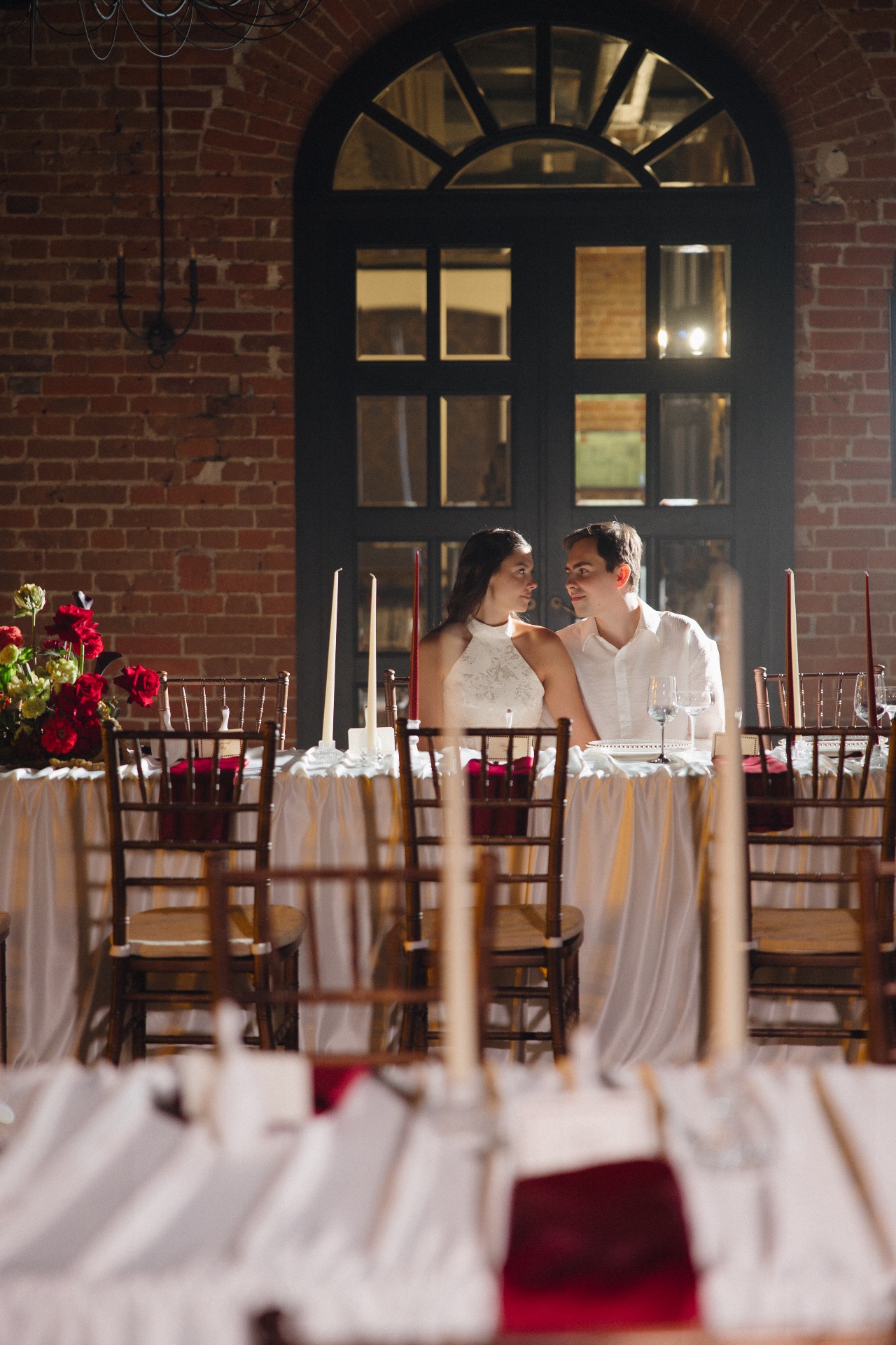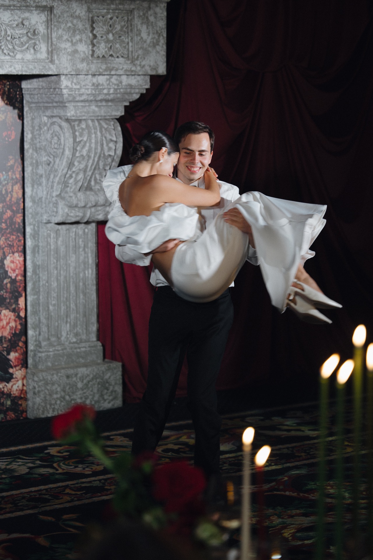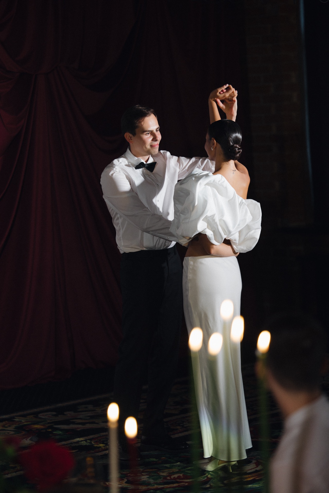 Основным визуальным акцентом свадьбы стал бордовый цвет на кремовом фоне для создания яркой театральной атмосферы. Зона выездной церемонии была оформлена у серого камина с красным занавесом, а зона ужина — с белыми скатертями и бордовыми салфетками, создающими уют при свечах.