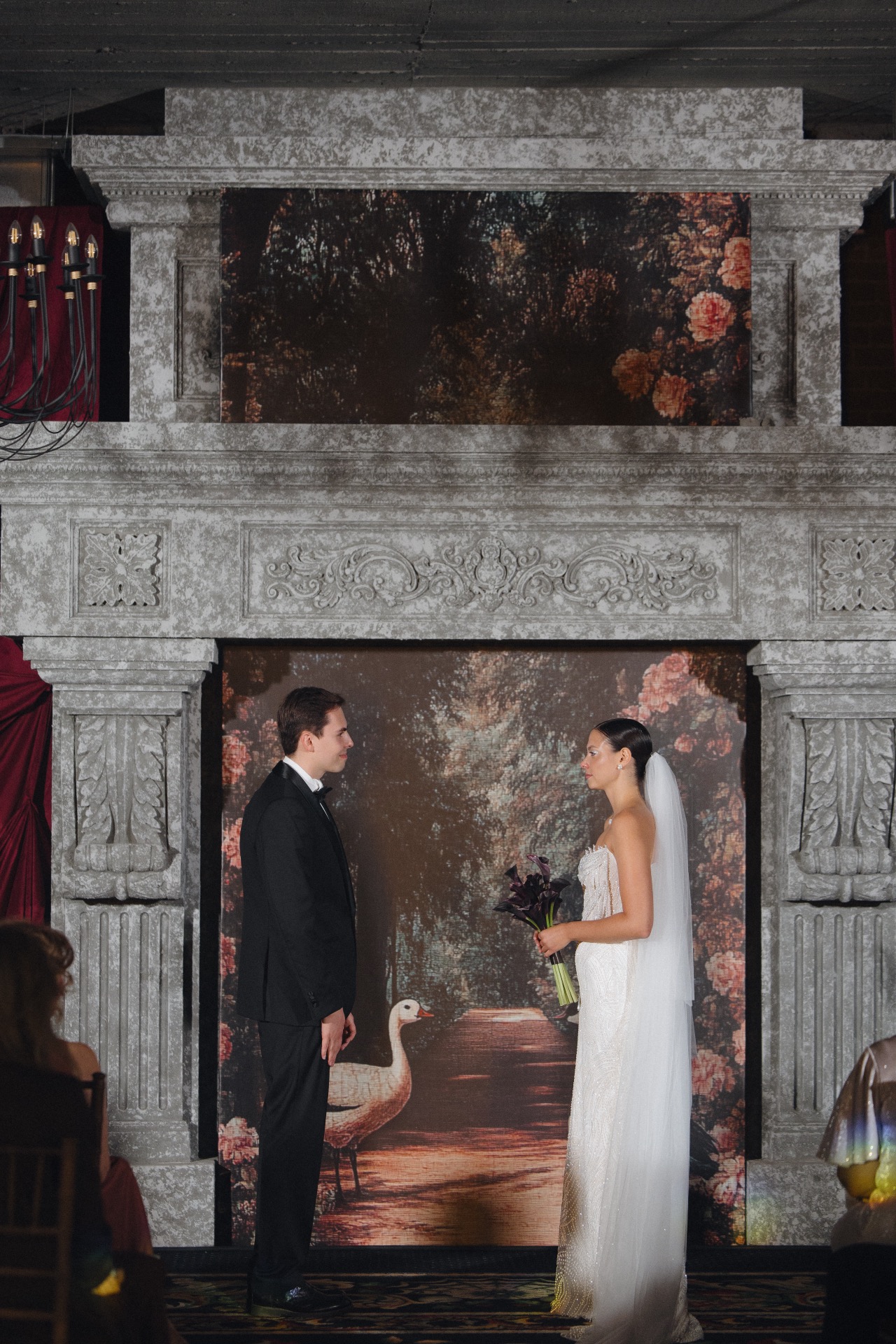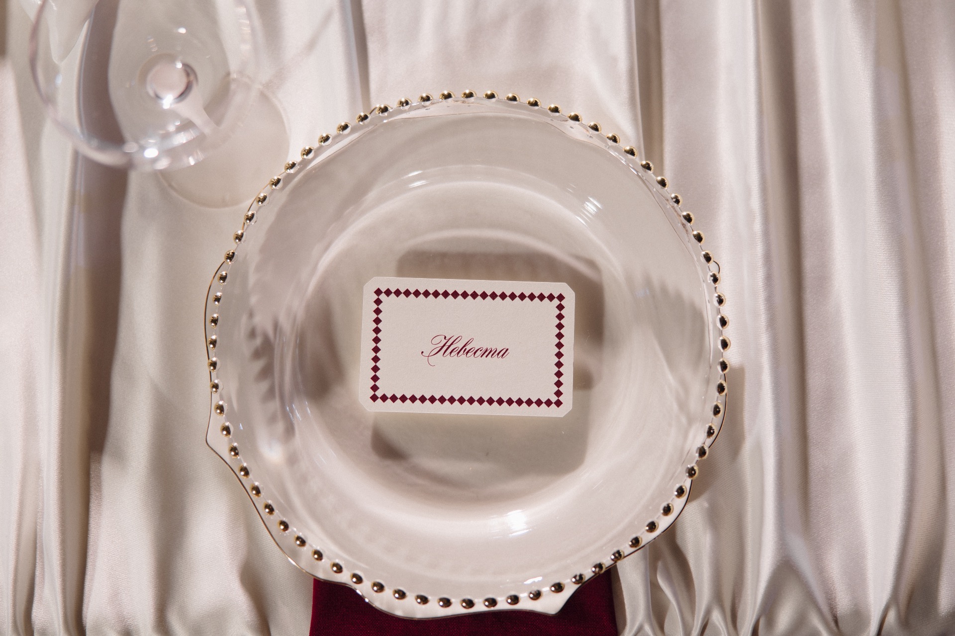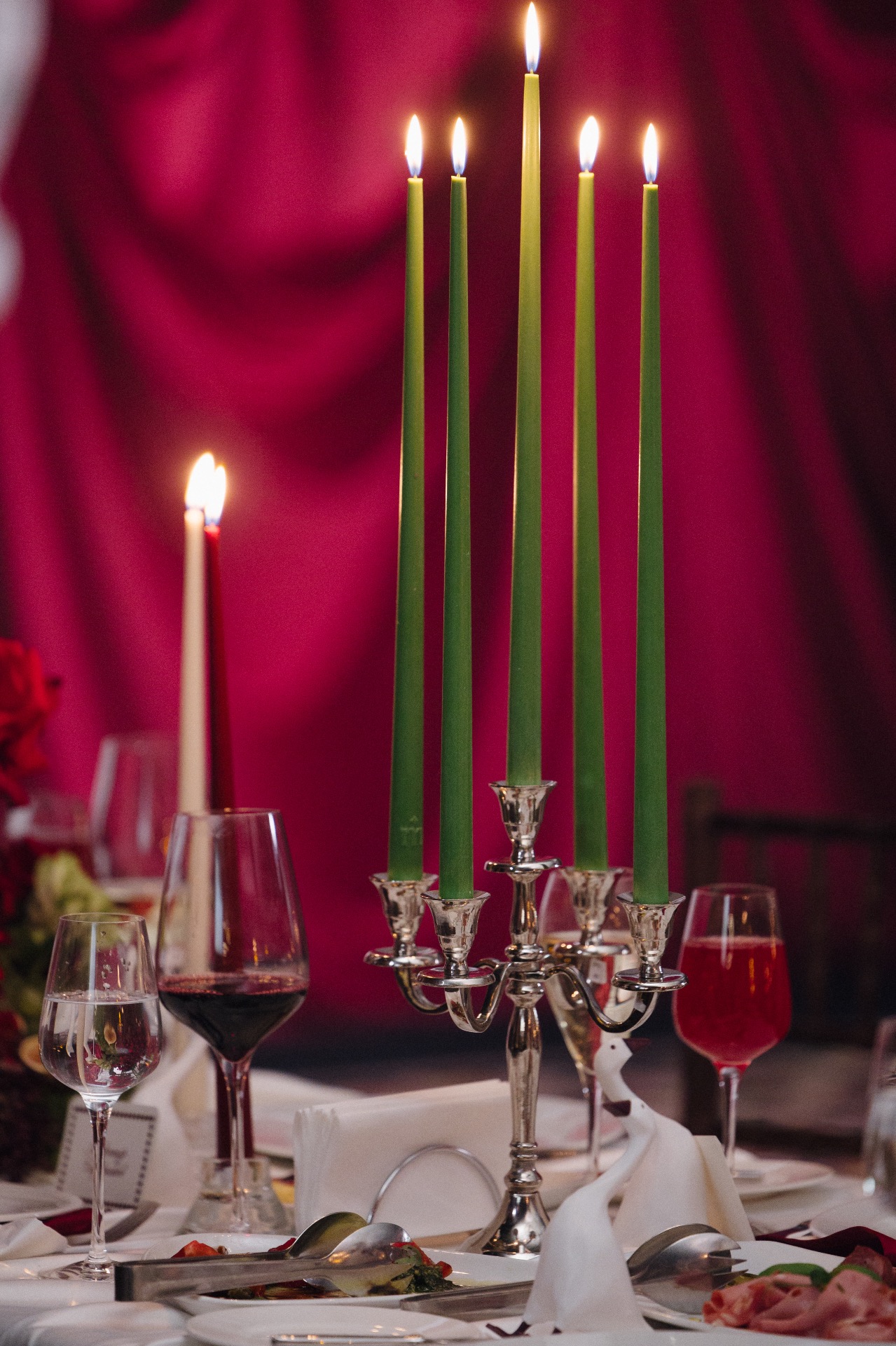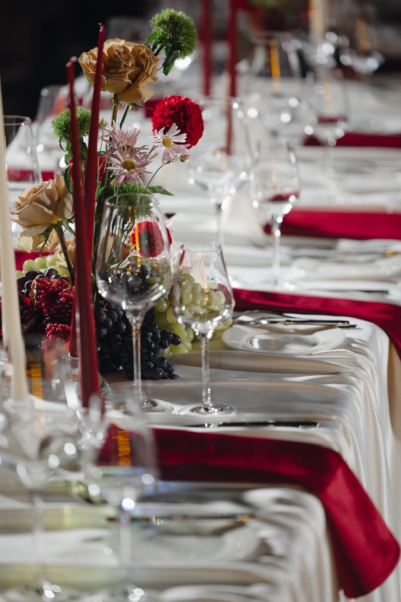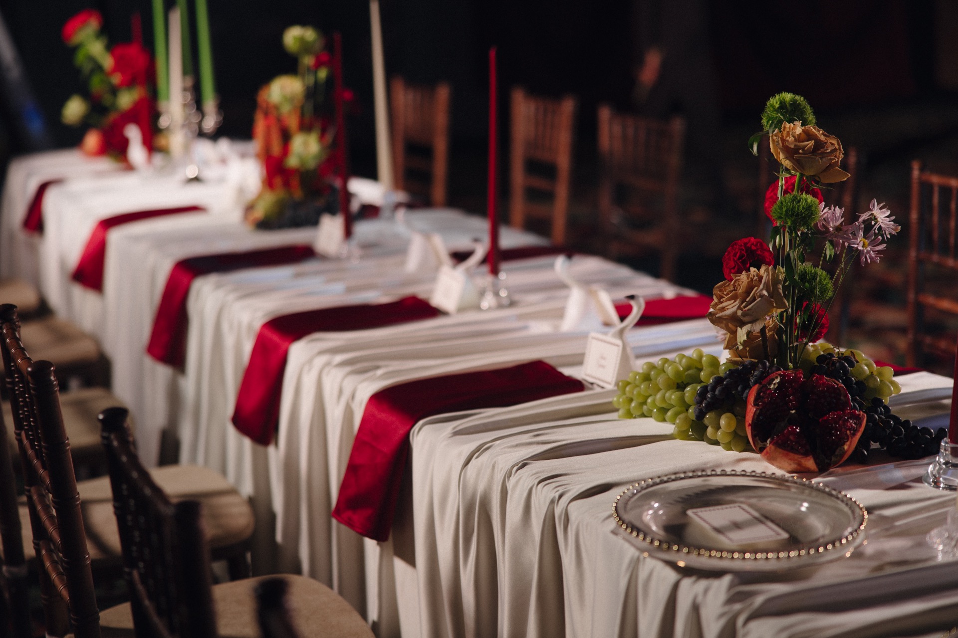 Основным визуальным акцентом свадьбы стал бордовый цвет на кремовом фоне для создания яркой театральной атмосферы. Зона выездной церемонии была оформлена у серого камина с красным занавесом, а зона ужина — с белыми скатертями и бордовыми салфетками, создающими уют при свечах.