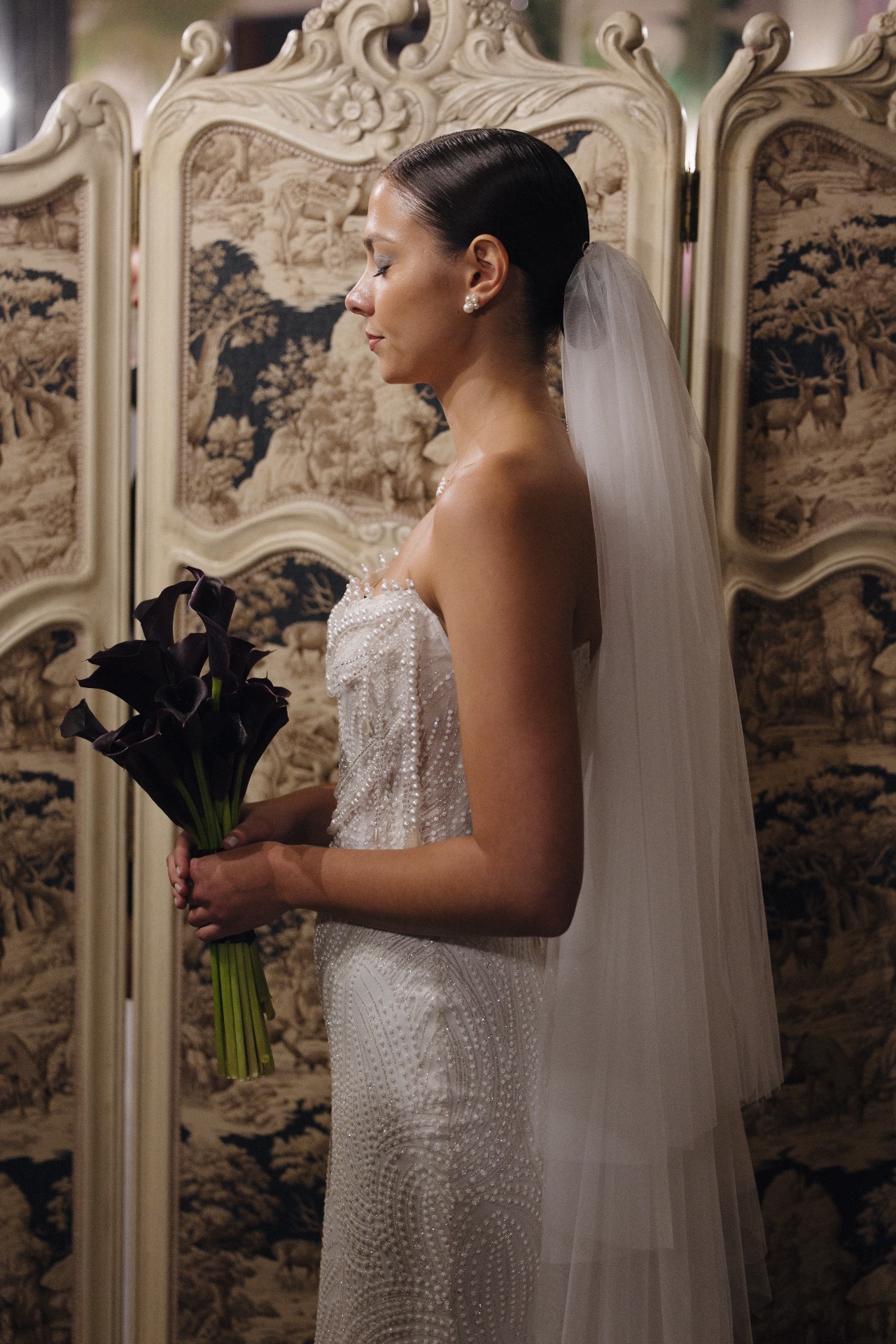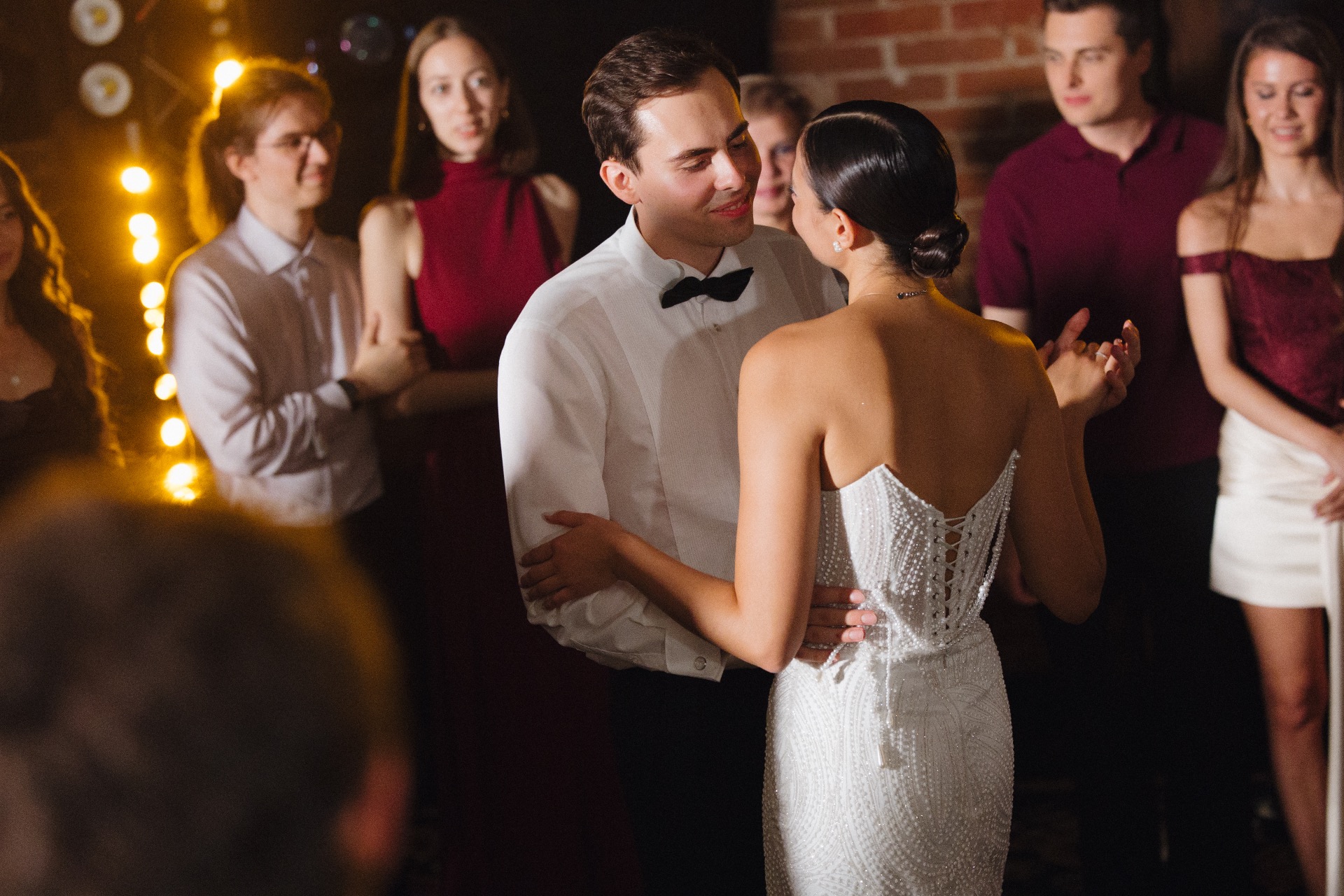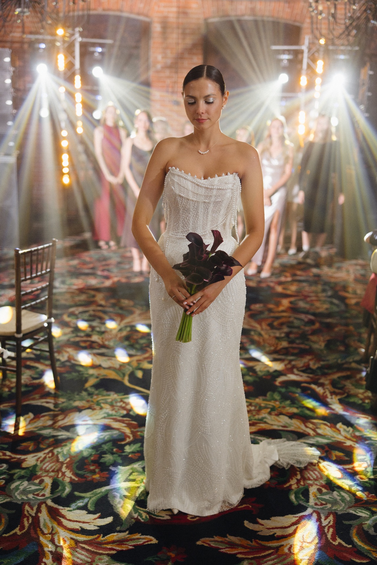 В итоге я купила простые, не очень броские украшения, подходящие под жемчужинки на платье в ANTI-BRIDE Place. В макияже я решила сделать акцент на глаза: серебряный глиттер, чёрный каял в межресничке. А в качестве причёски я выбрала собранную шишку, выдержавшую любой конкурс, танец и другие свадебные активности.