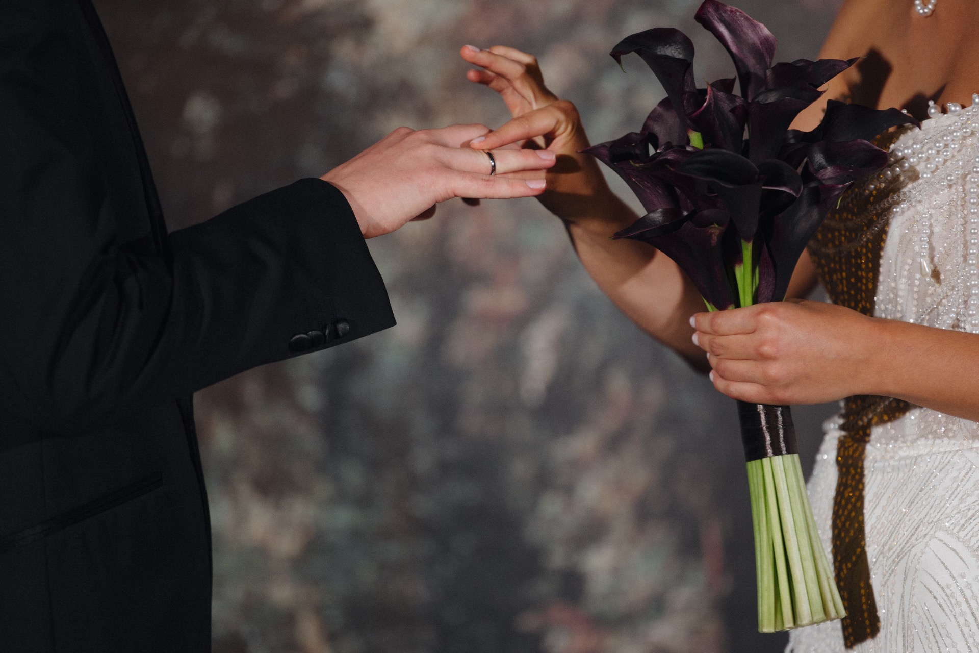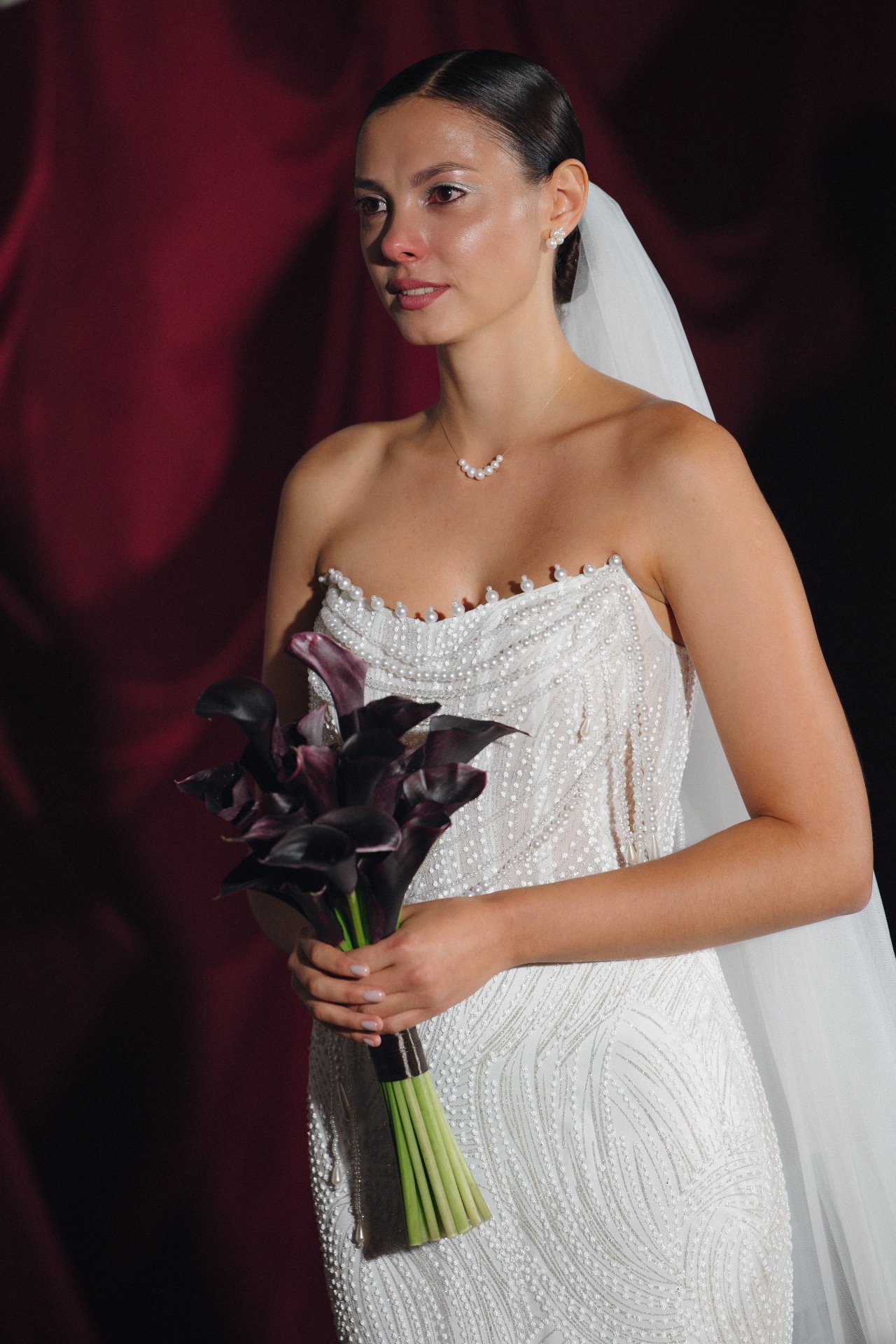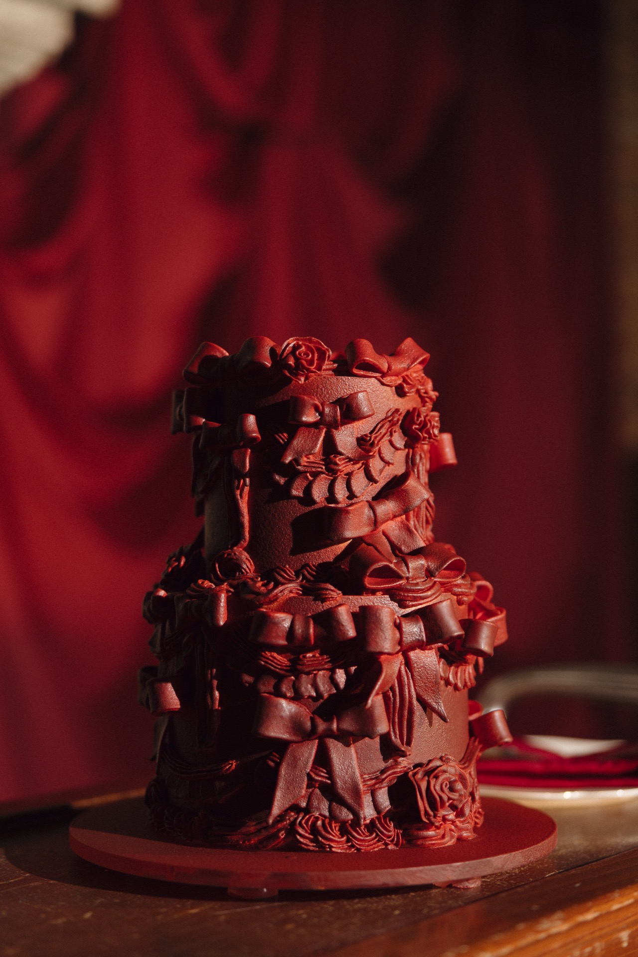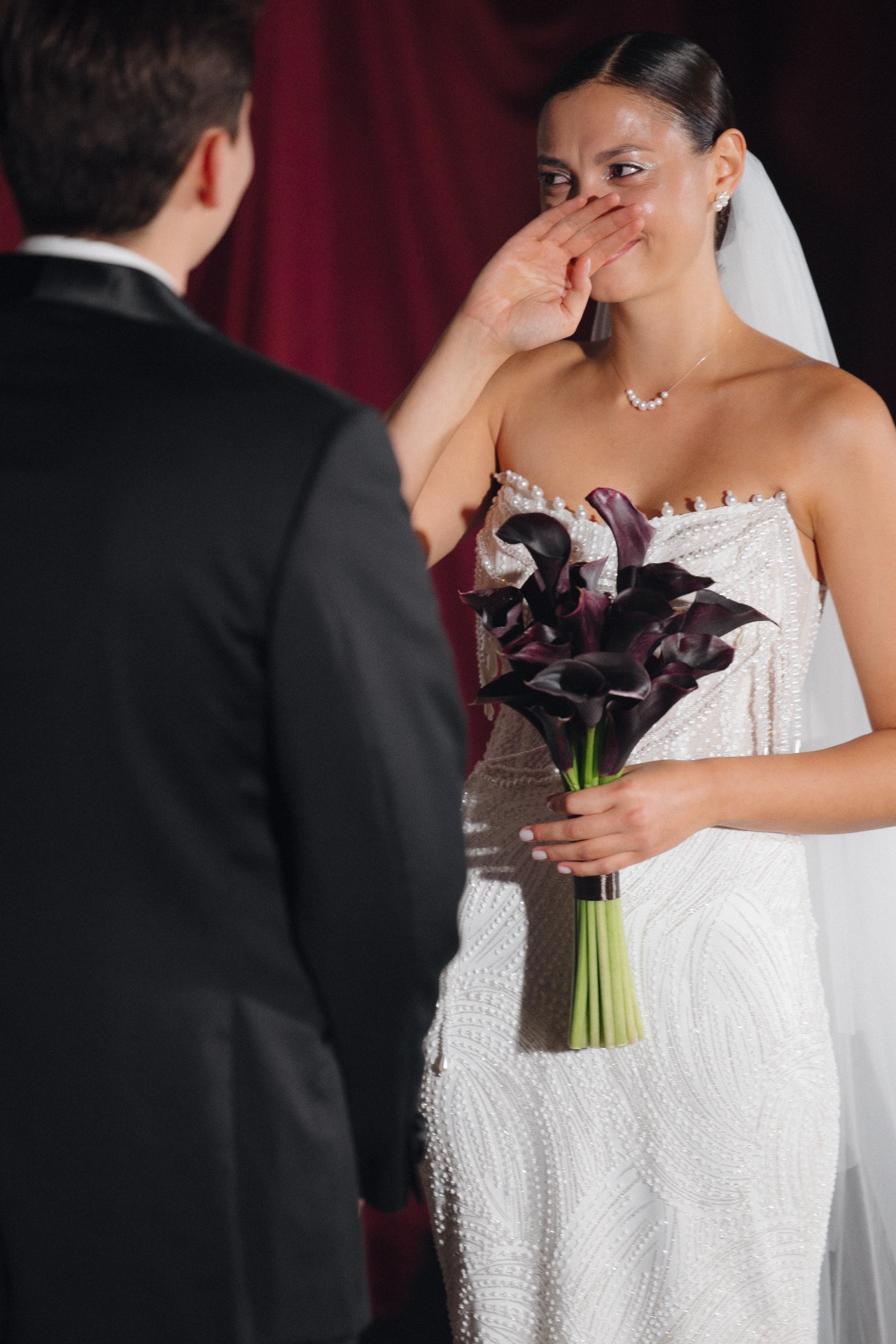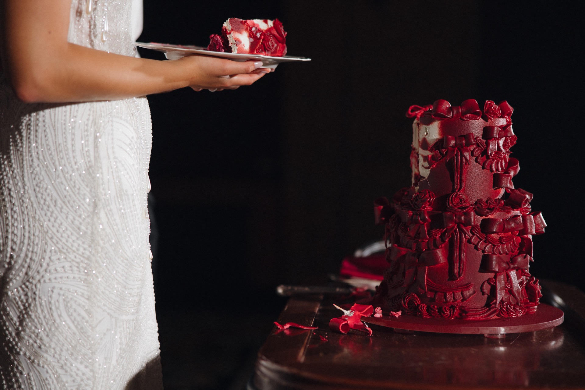 Мой букет был минималистичным с бордовыми каллами, а в качестве торта мы выбрали «Красный бархат» с вишней и шоколадными элементами.