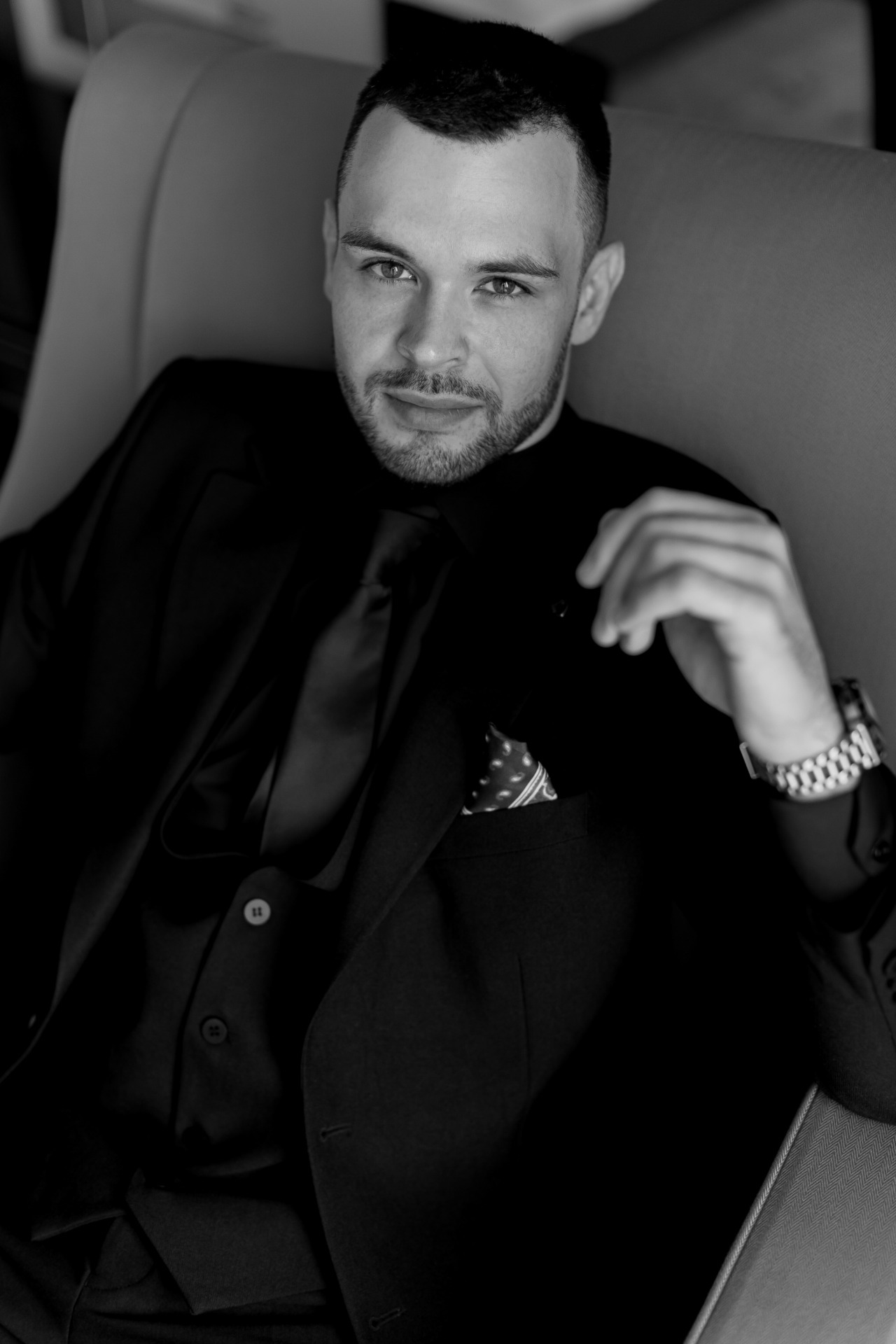 Жених был в классическом чёрном костюме. На церемонию он надел белую рубашку, но затем переоделся в чёрную, и был особенно хорош в тотал-блэк образе.