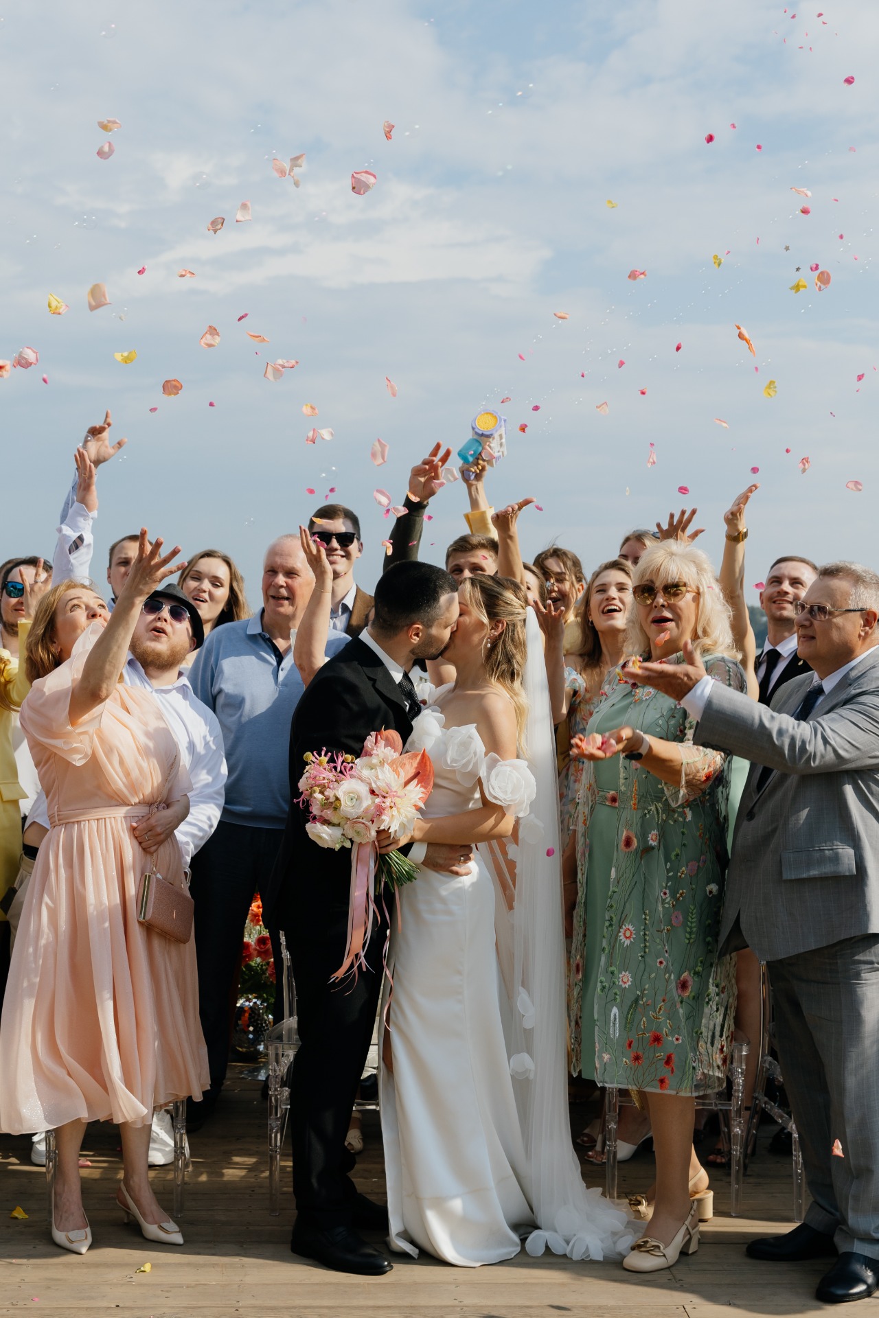 На следующий день состоялась наша свадьба на загородной площадке The Sun. Мы не хотели терять ни минуты общения с нашими близкими, поэтому весь welcome-этап провели вместе с гостями, пили любимые коктейли выездного бара, много смеялись, обнимались и радовались моменту.