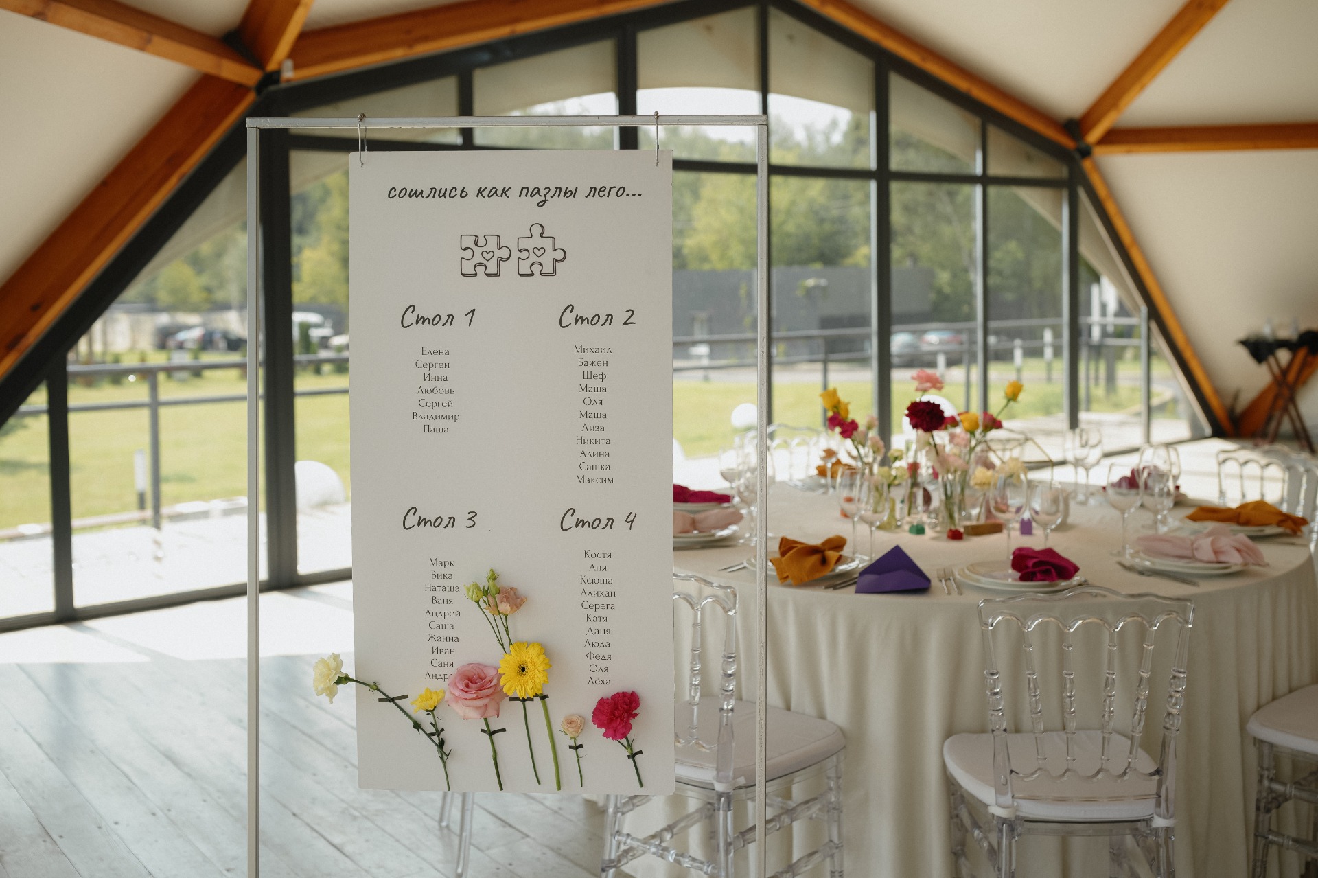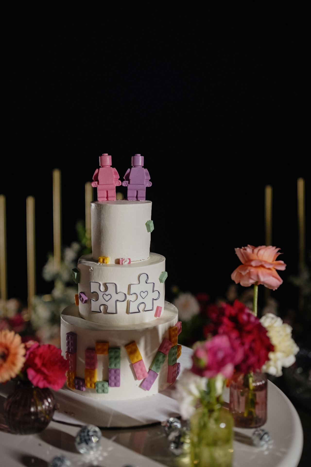 Концепция свадьбы строилась на наших характерах, увлечениях и контрастах. Мы с Сашей очень разные — во вкусах, интересах, досуге, даже во внешности. Но у нас одинаковые ценности. Если говорить об увлечениях: Саша — большой поклонник LEGO. И на одном из созвонов с нашим ведущим, Артёмом Ионовым, он сказал фразу, которая очень точно описывает наши отношения: «Сошлись, как пазлики LEGO». Так в оформлении свадьбы появились детали конструктора: в декоре столов, на торте и даже в моём образе.