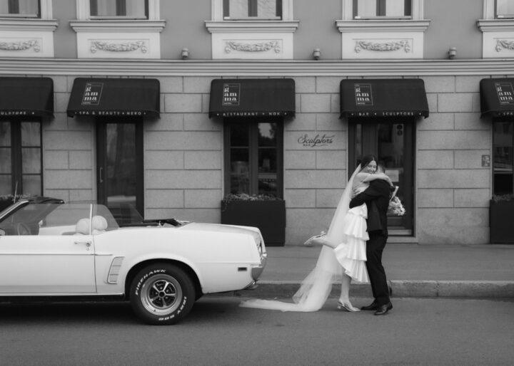 На торжество жениху выбрали черный смокинг. Платье делали под заказ, лаконичное, по фигуре, с акцентной деталью в виде воланов. Фату хотелось невероятно длинную, и я ее нашла! При выборе авто остановили свой выбор на ретро-модели. А регистрация проходила во Дворце бракосочетания №1.