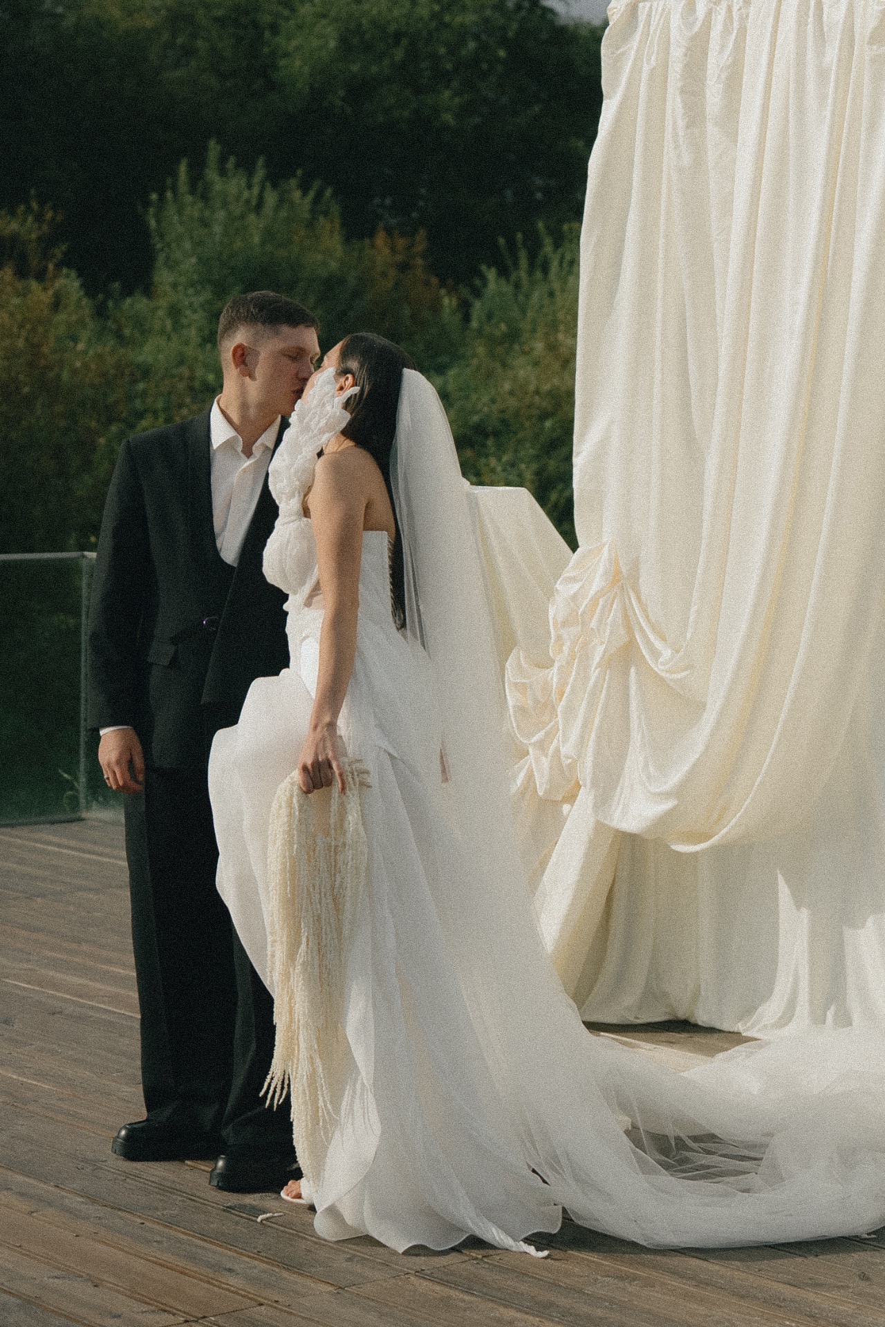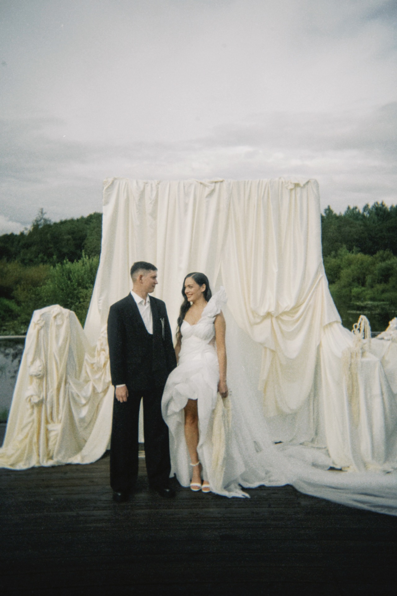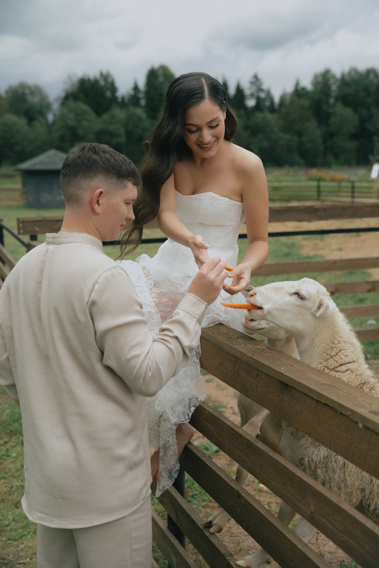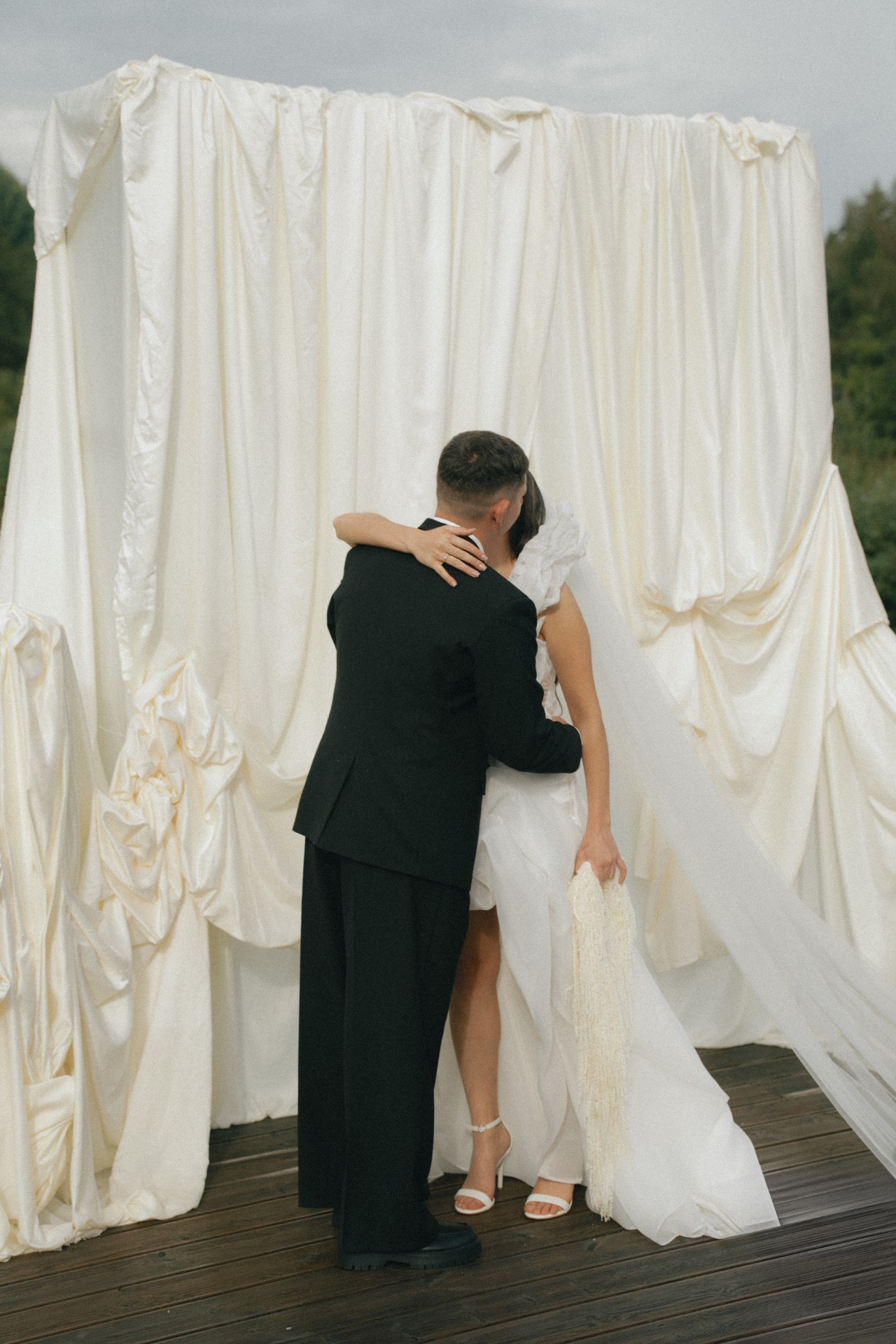 Мы решили разделить утренние сборы и банкет. Утром мы были предоставлены только друг другу: романтичная прогулка по полю, знакомство с животными и уединённый пикник. А вечером перед нами и гостями предстали величие новых форм, драпировок, текстур и света. Всё это стало воплощением союза двух противоположностей: простого и открытого — с творческой и глубокой натурой.