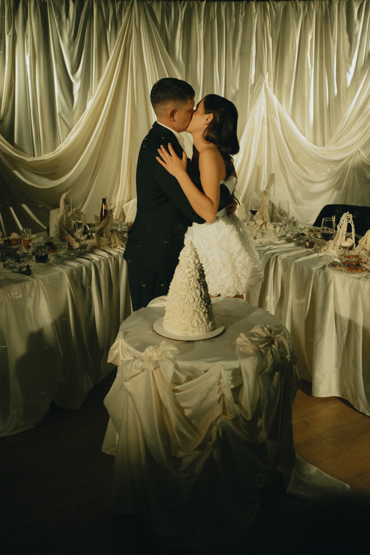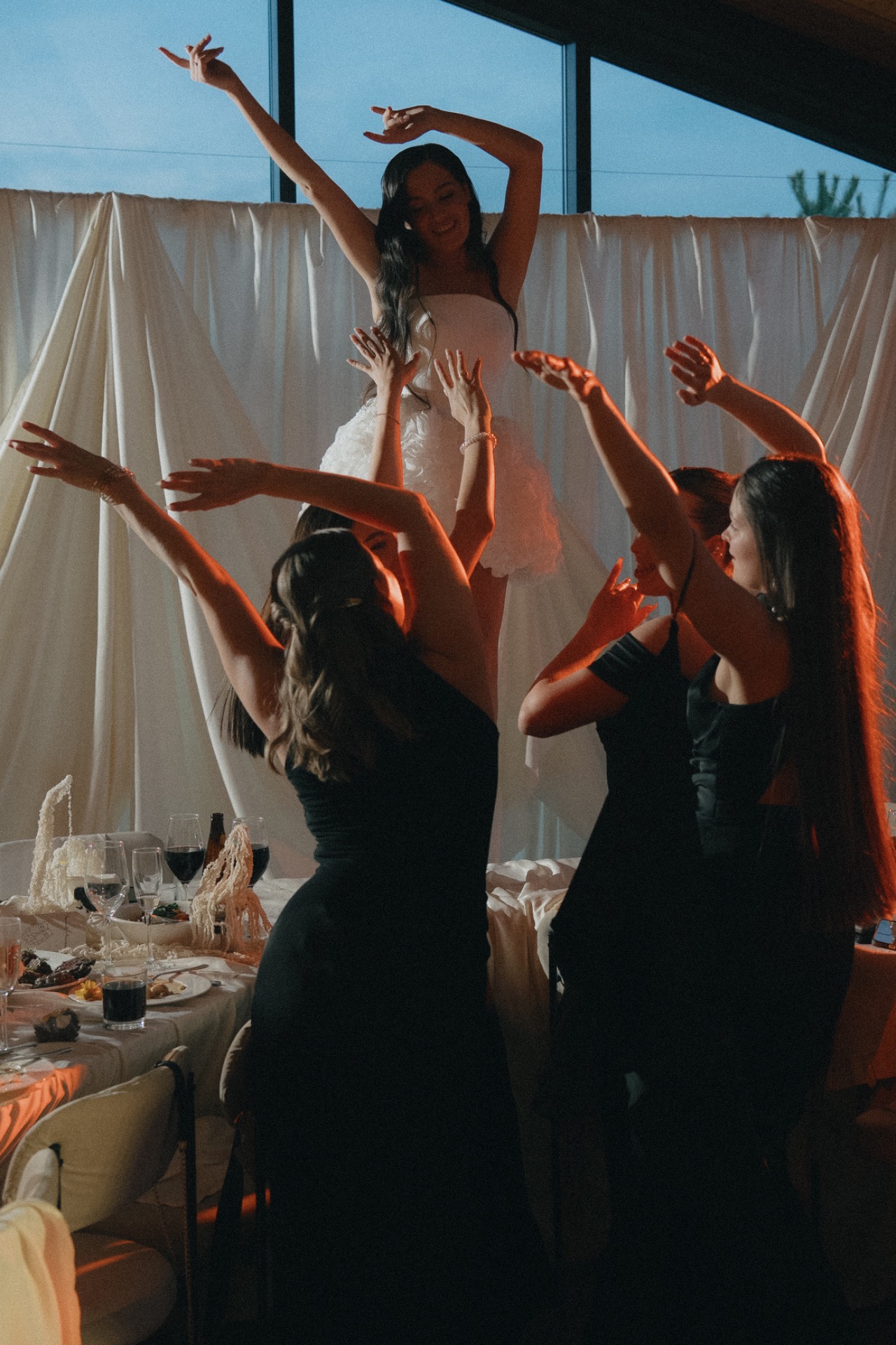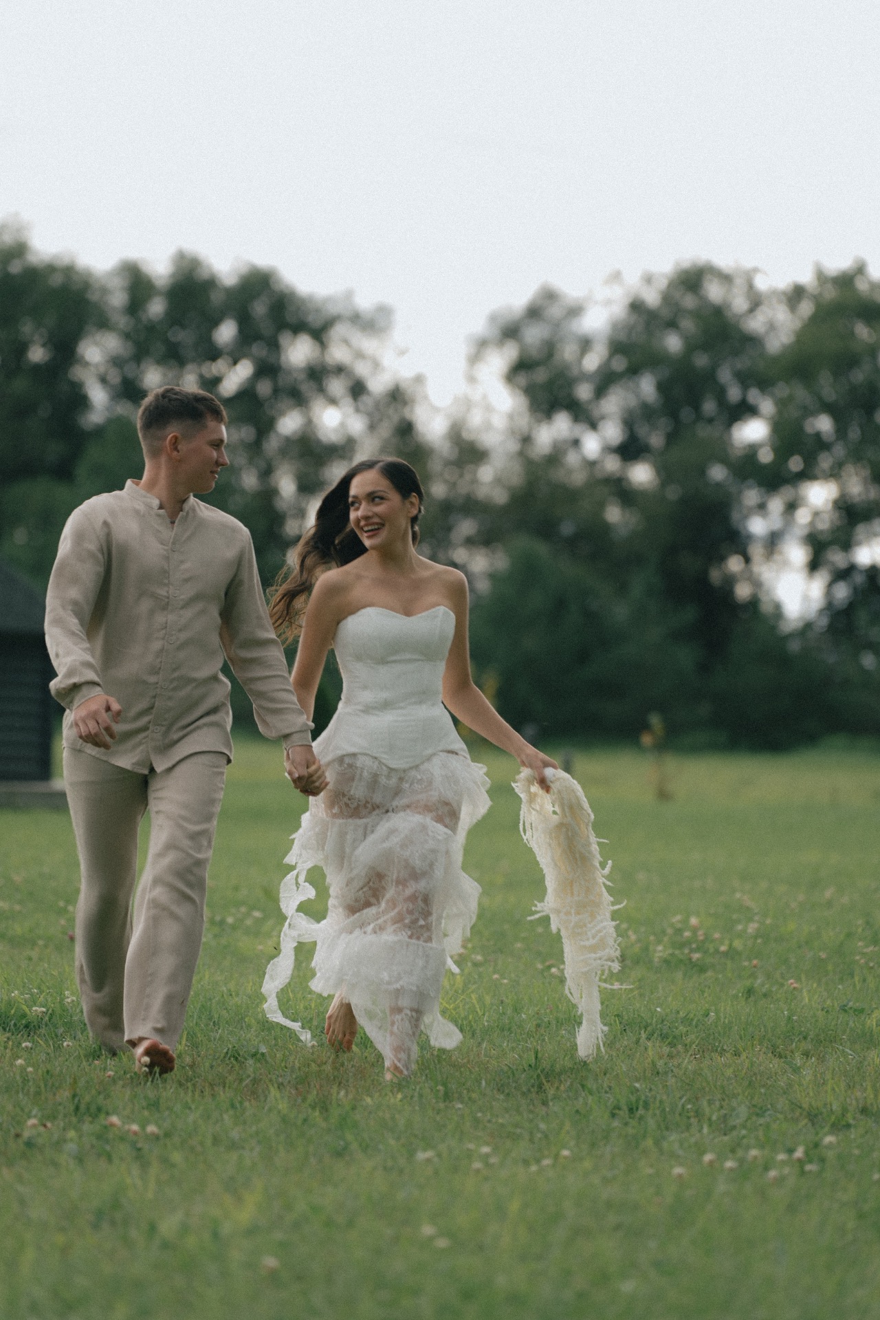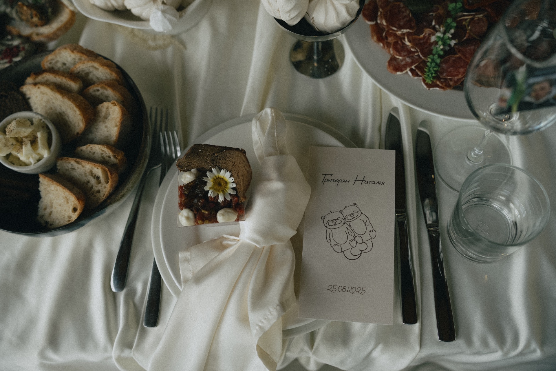 Мы решили разделить утренние сборы и банкет. Утром мы были предоставлены только друг другу: романтичная прогулка по полю, знакомство с животными и уединённый пикник. А вечером перед нами и гостями предстали величие новых форм, драпировок, текстур и света. Всё это стало воплощением союза двух противоположностей: простого и открытого — с творческой и глубокой натурой.