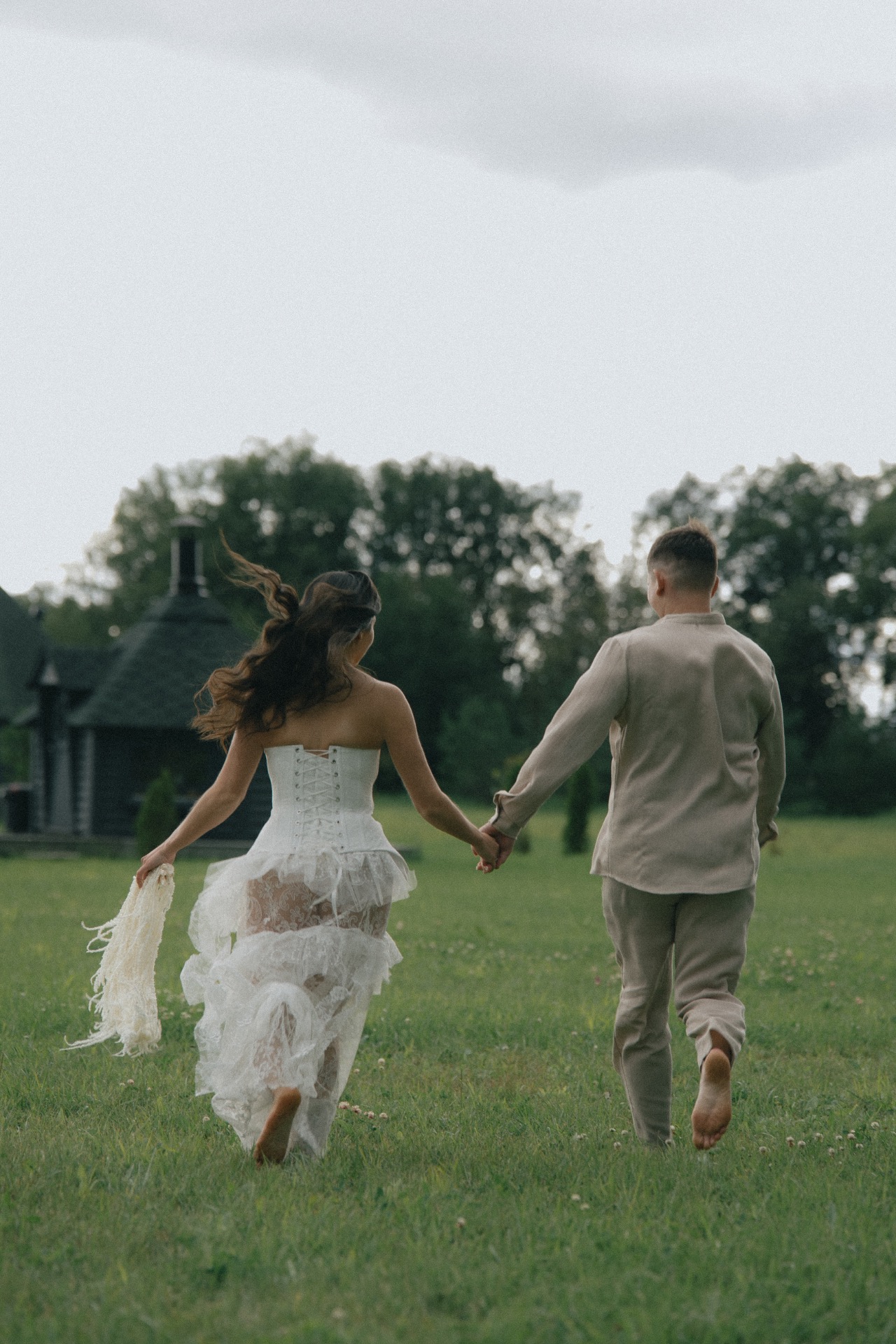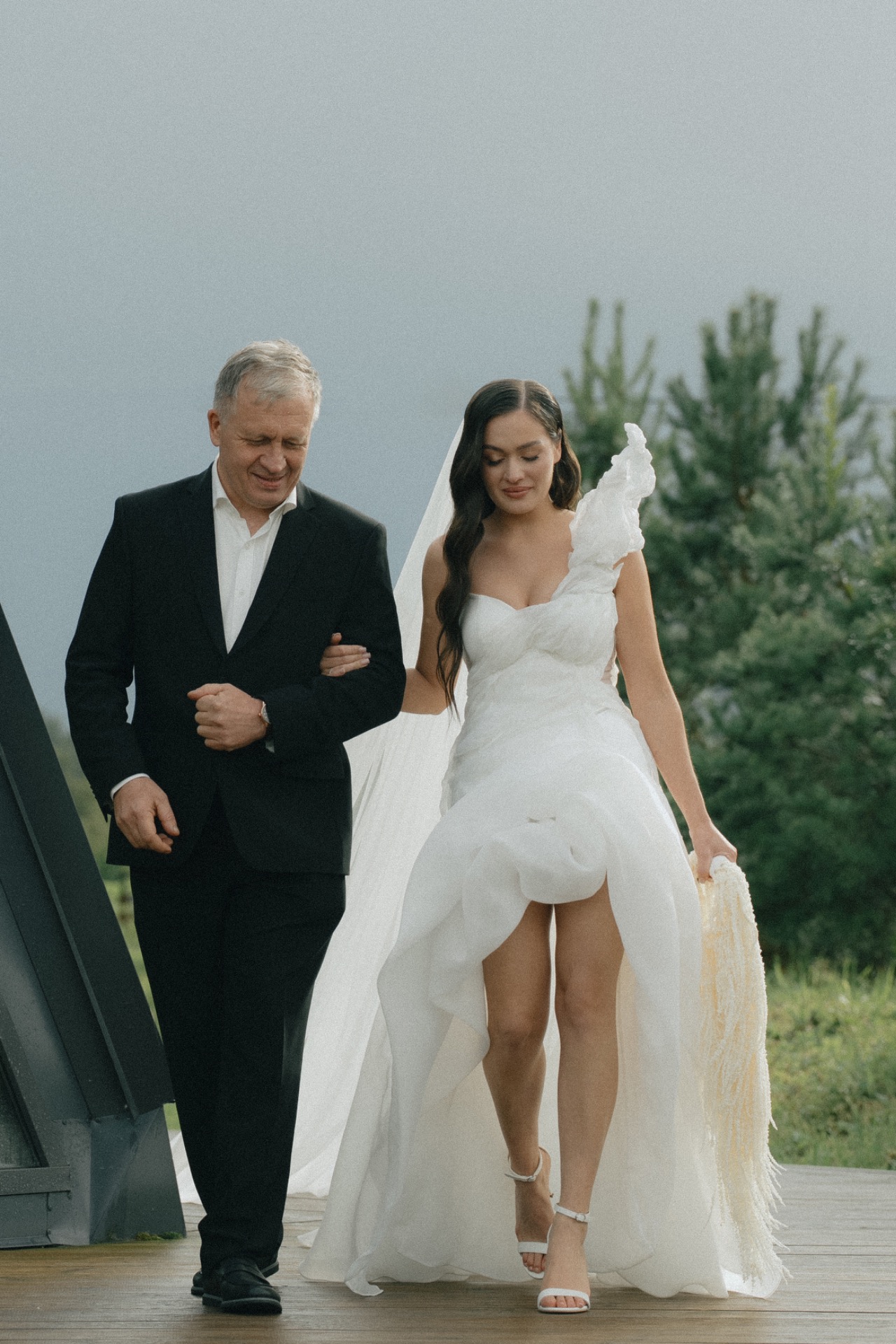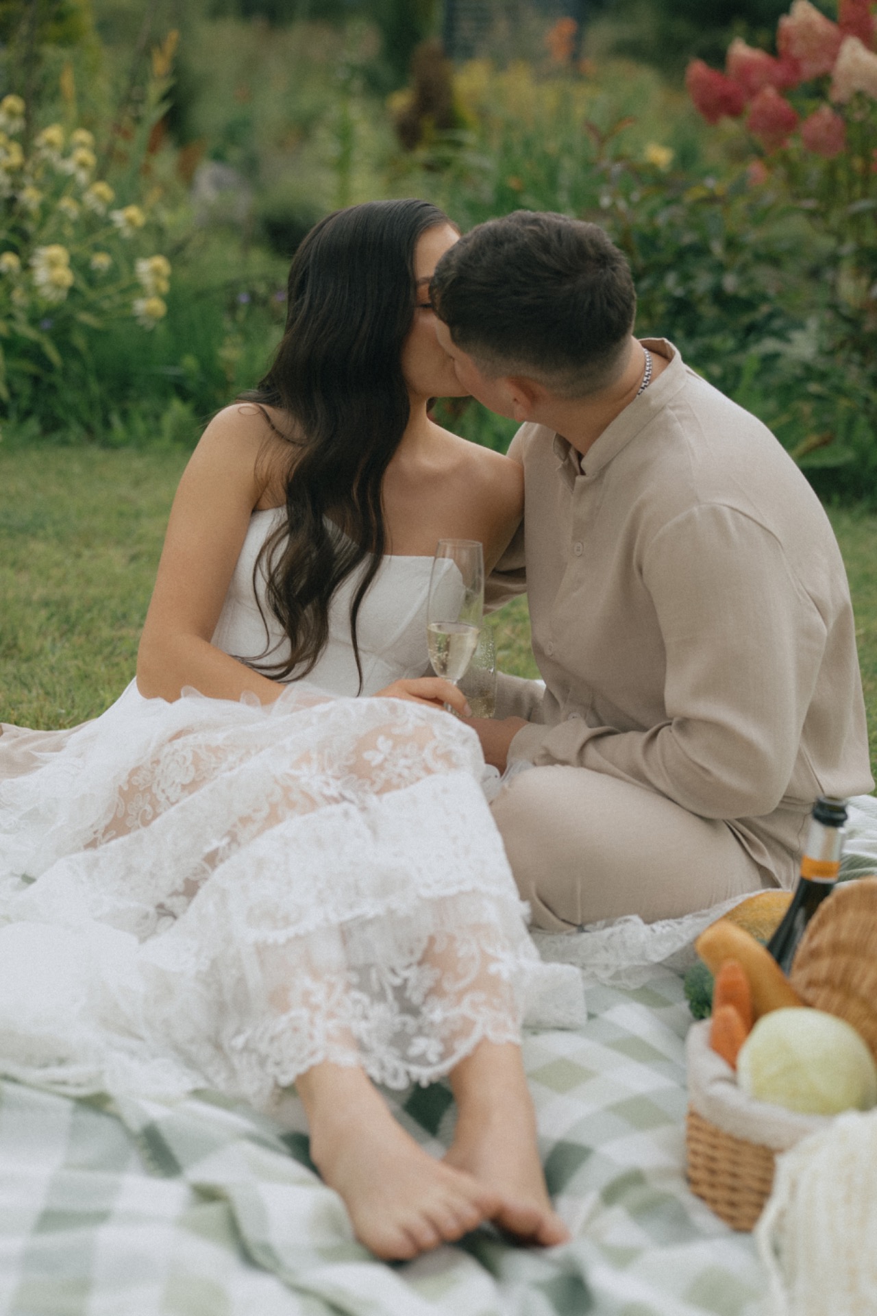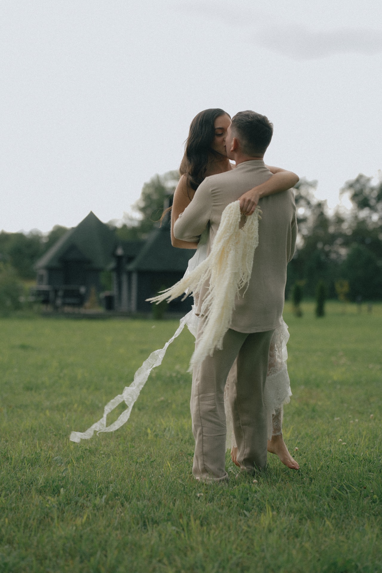 Мы решили разделить утренние сборы и банкет. Утром мы были предоставлены только друг другу: романтичная прогулка по полю, знакомство с животными и уединённый пикник. А вечером перед нами и гостями предстали величие новых форм, драпировок, текстур и света. Всё это стало воплощением союза двух противоположностей: простого и открытого — с творческой и глубокой натурой.
