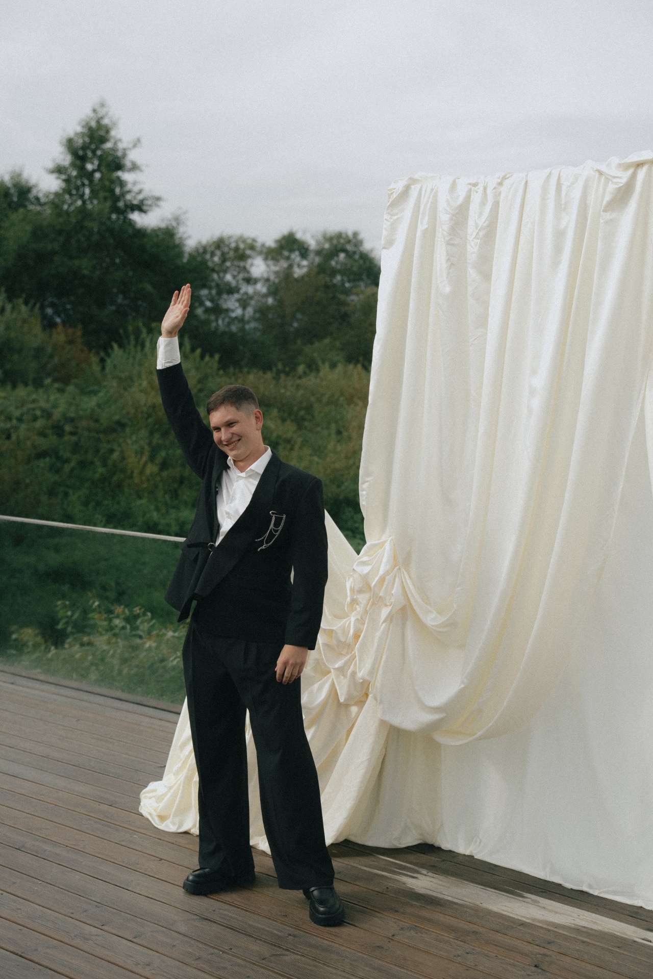Дизайнер, который шил моё основное платье, создал костюм и для Андрея: сложносочинённый, но подчёркивающий его стать и строгость.