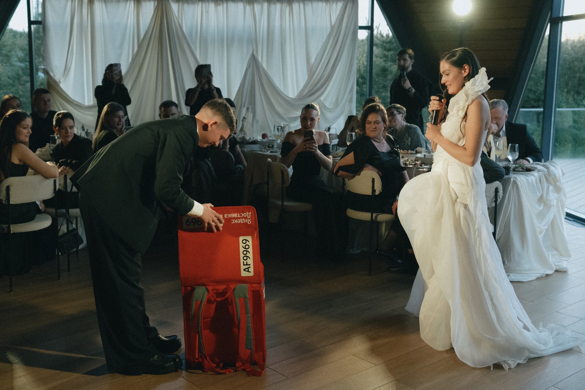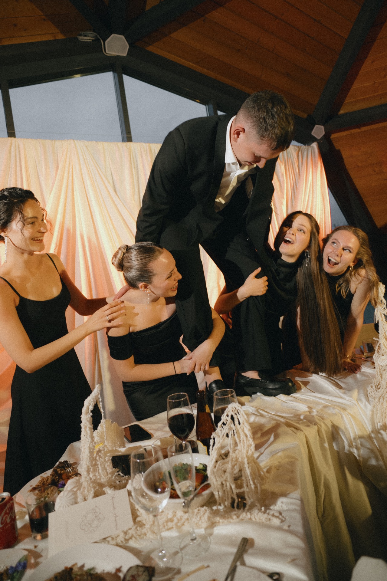 Камерная свадьба — это про семью, как случилось и у нас. Трогательный вечер набирал обороты, а гости переставали стесняться: бирпонг, танцы на столе и «украденная» из фотозоны резиновая лодка в озере стали тому подтверждением.