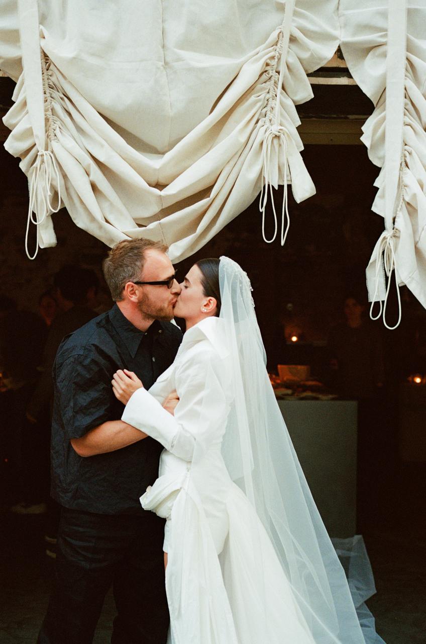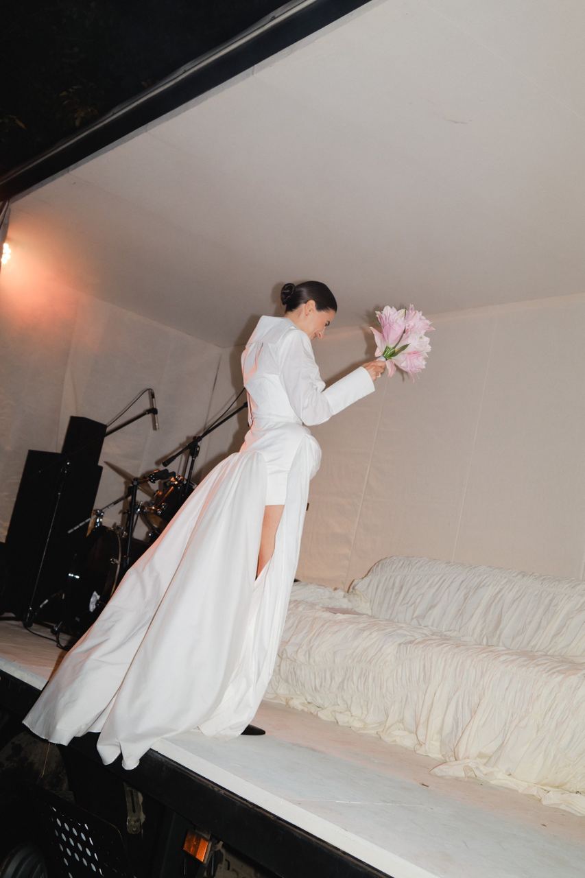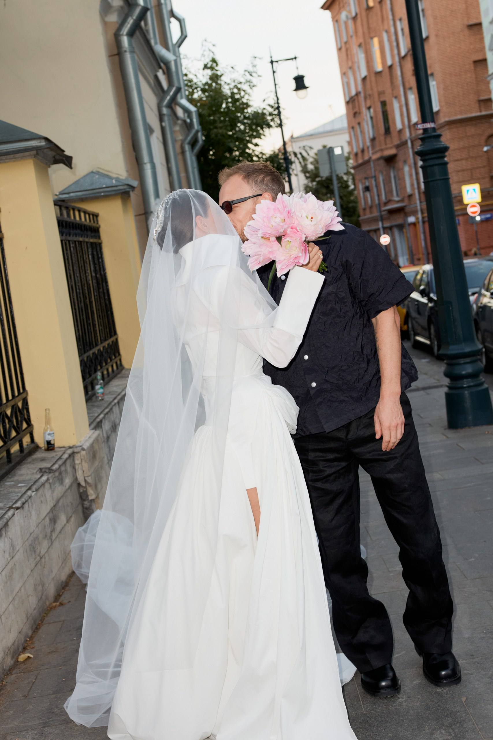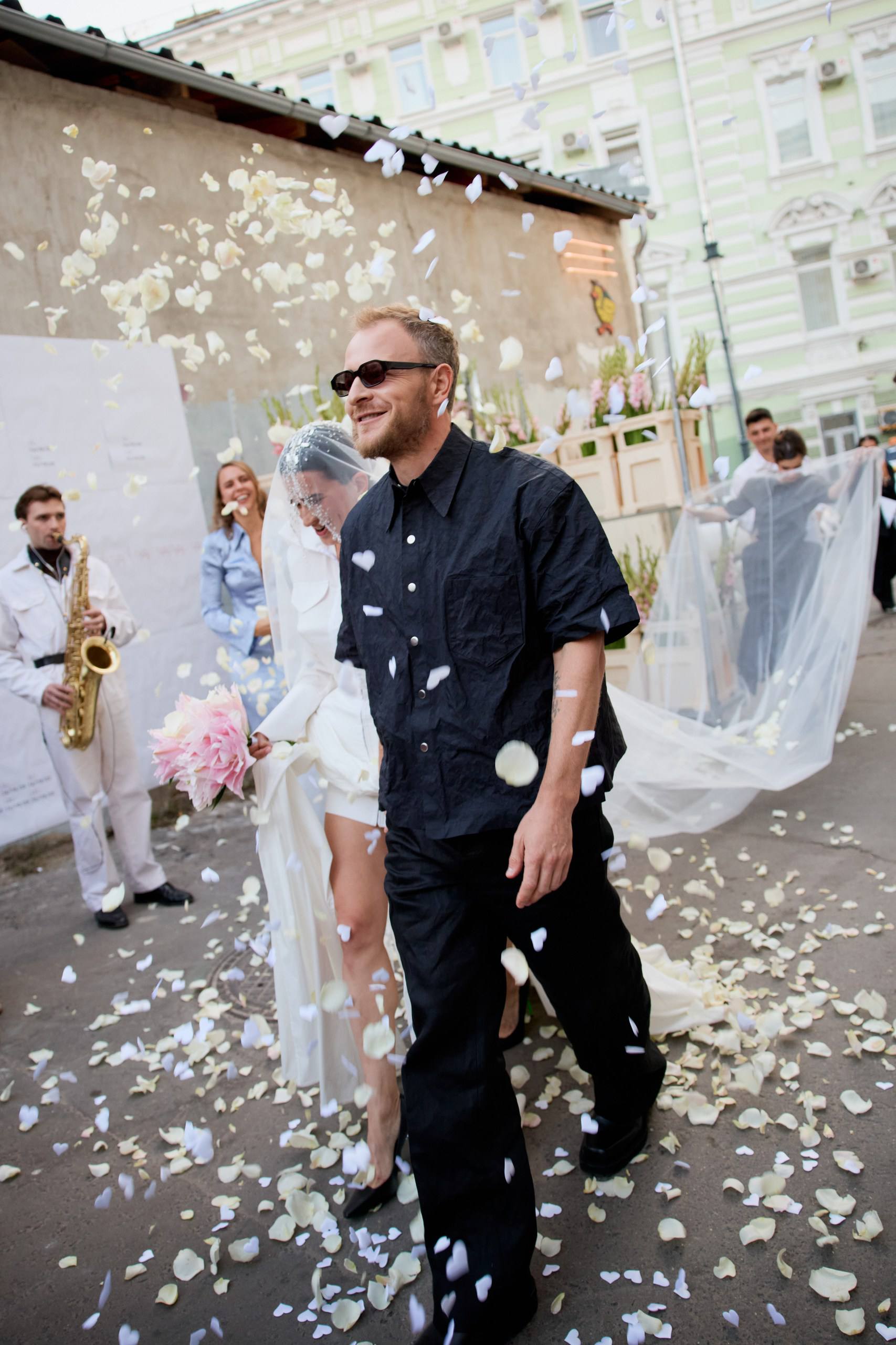 Настя, основатель тг-канала «Без фильтров», рассказала, что у невесты было 2 образа. Основным стало платье-рубашка от дизайнера Ильи Мигмуна — с драпировками, шлейфом, акцентным воротником, внутренним коническим бра в духе Мадонны и пышной фатой. Вторым образом стало корсетное платье в пол с внутренним боди и множеством металлических пластин от молодого кубино-испанского дизайнера Хавьера Коллазо.