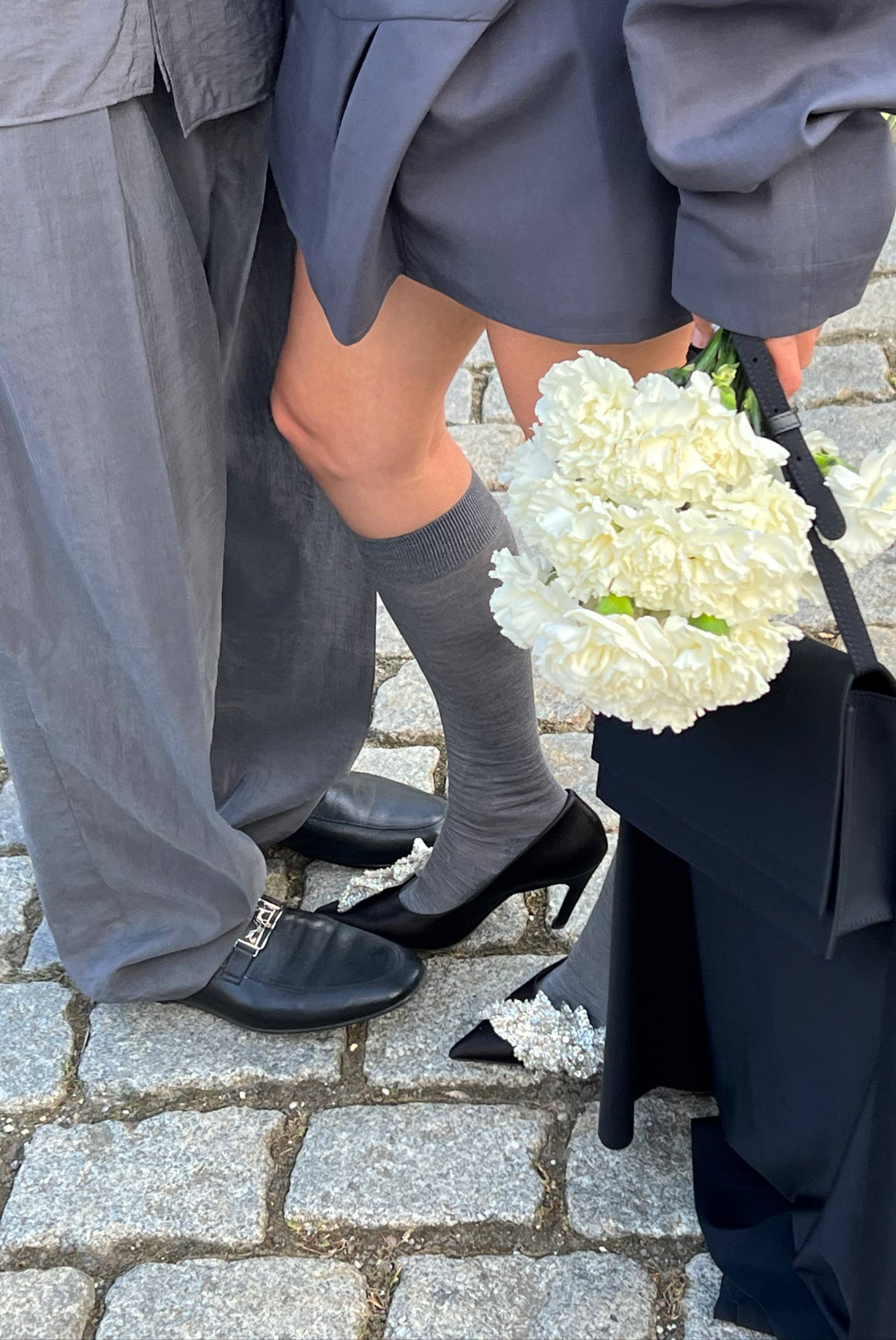 Идеальным дополнением стали винтажные лодочки Balenciaga для неё и лоферы Hermes — для него.