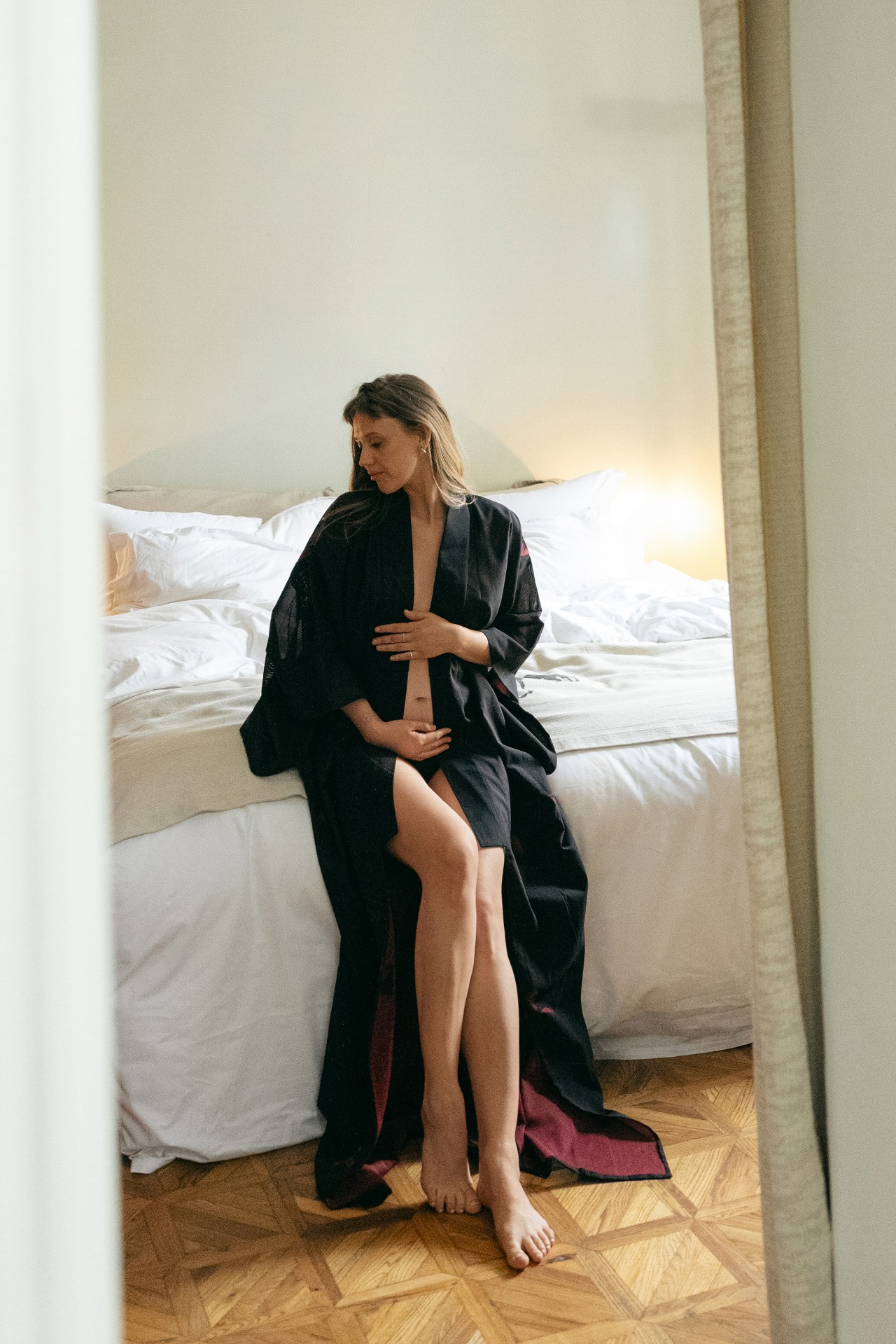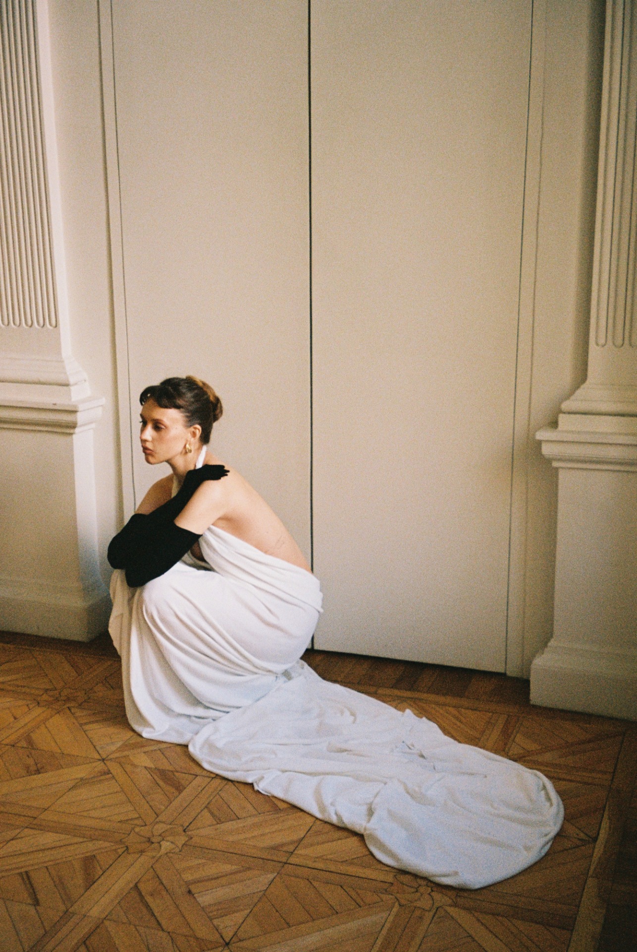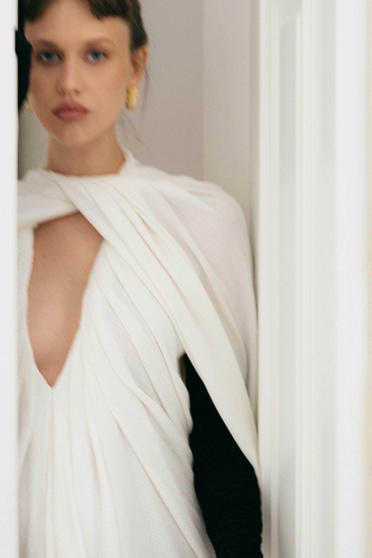 До того, как я узнала о беременности, мне хотелось корсетное платье, подчёркивающее силуэт, с высоким воротником и акцентом на линии бёдер. Однако, позже главным для меня стало ощущение комфорта. Я придумала своё платье всего за несколько недель до свадьбы, выбрав мягкую и фактурную ткань. Я экспериментировала с разными вариантами, пока не нашла идеальный для себя силуэт. Платье было создано вручную, от кутюр.