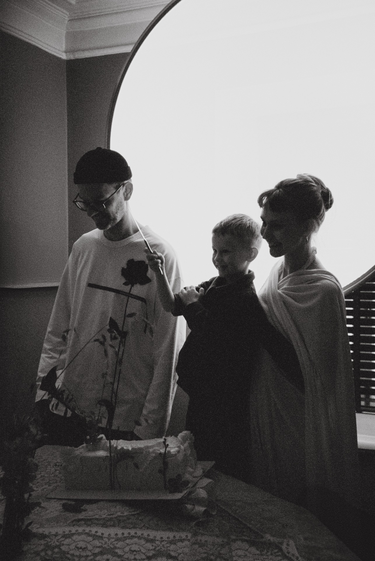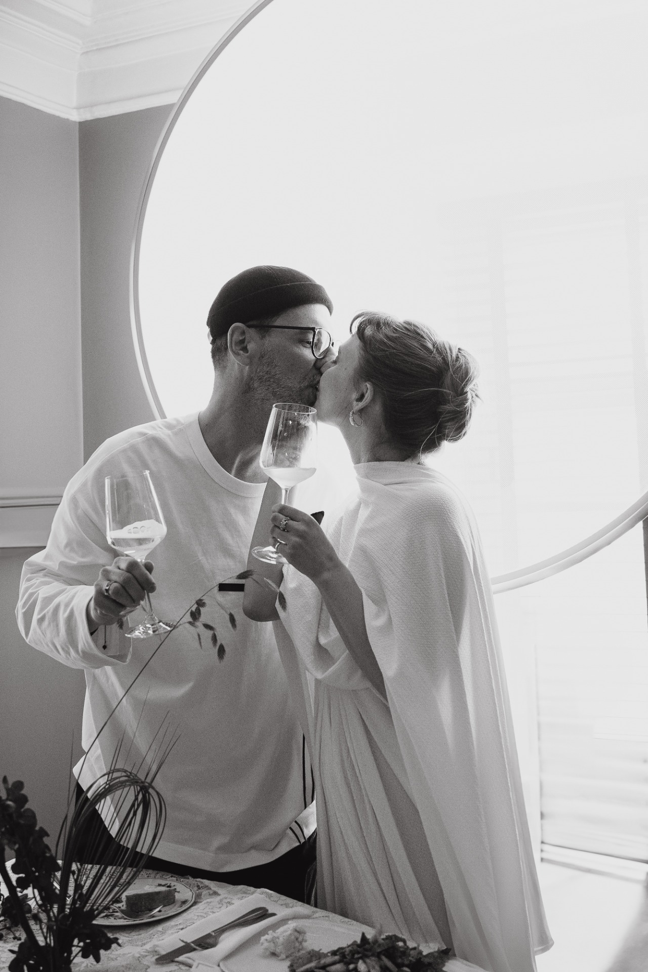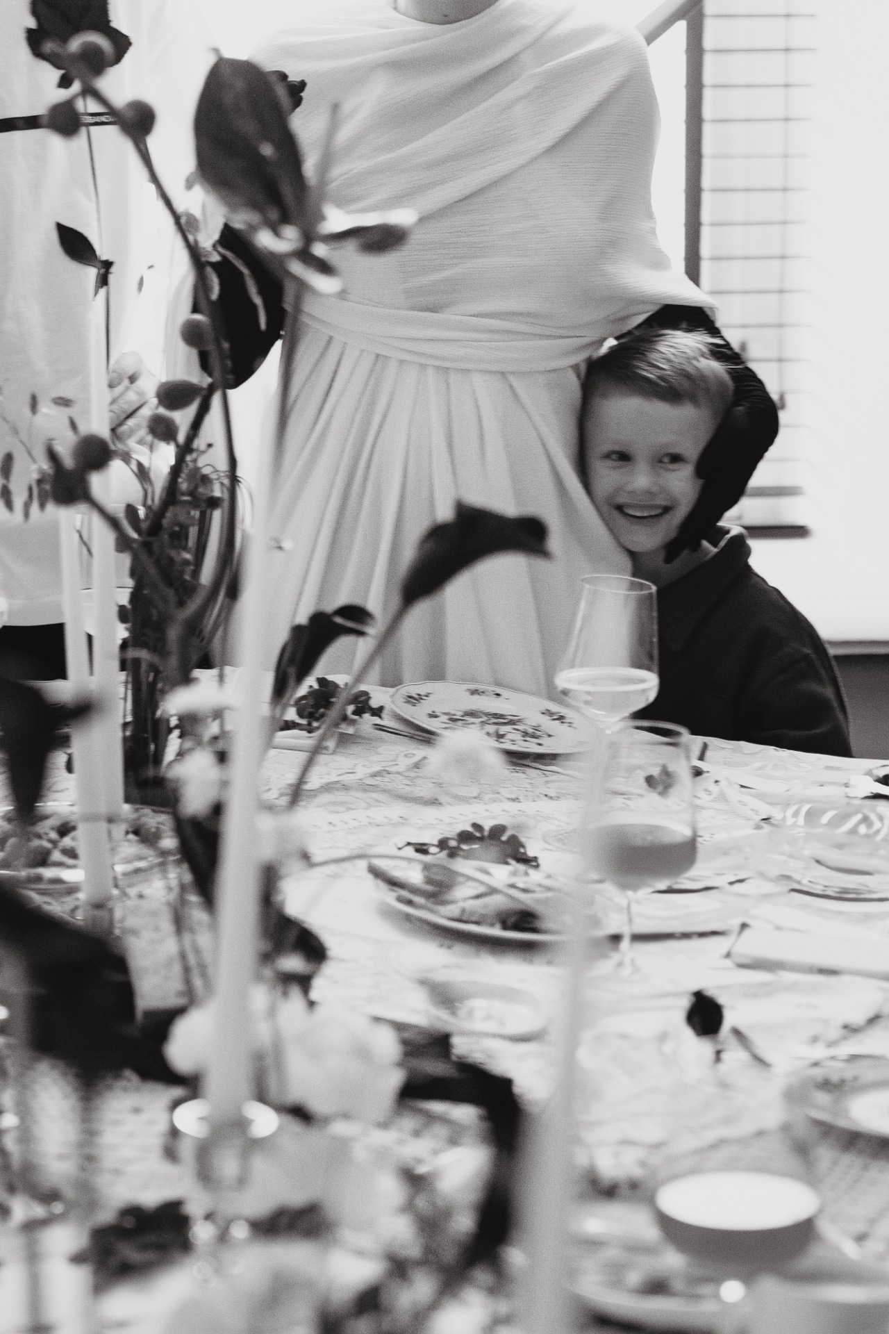 На свадьбе были только родители и близкие друзья, что сделало праздник особенно тёплым и личным. Мы попросили гостей одеться в чёрное, чтобы подчеркнуть цельность образа и атмосферу вечера.