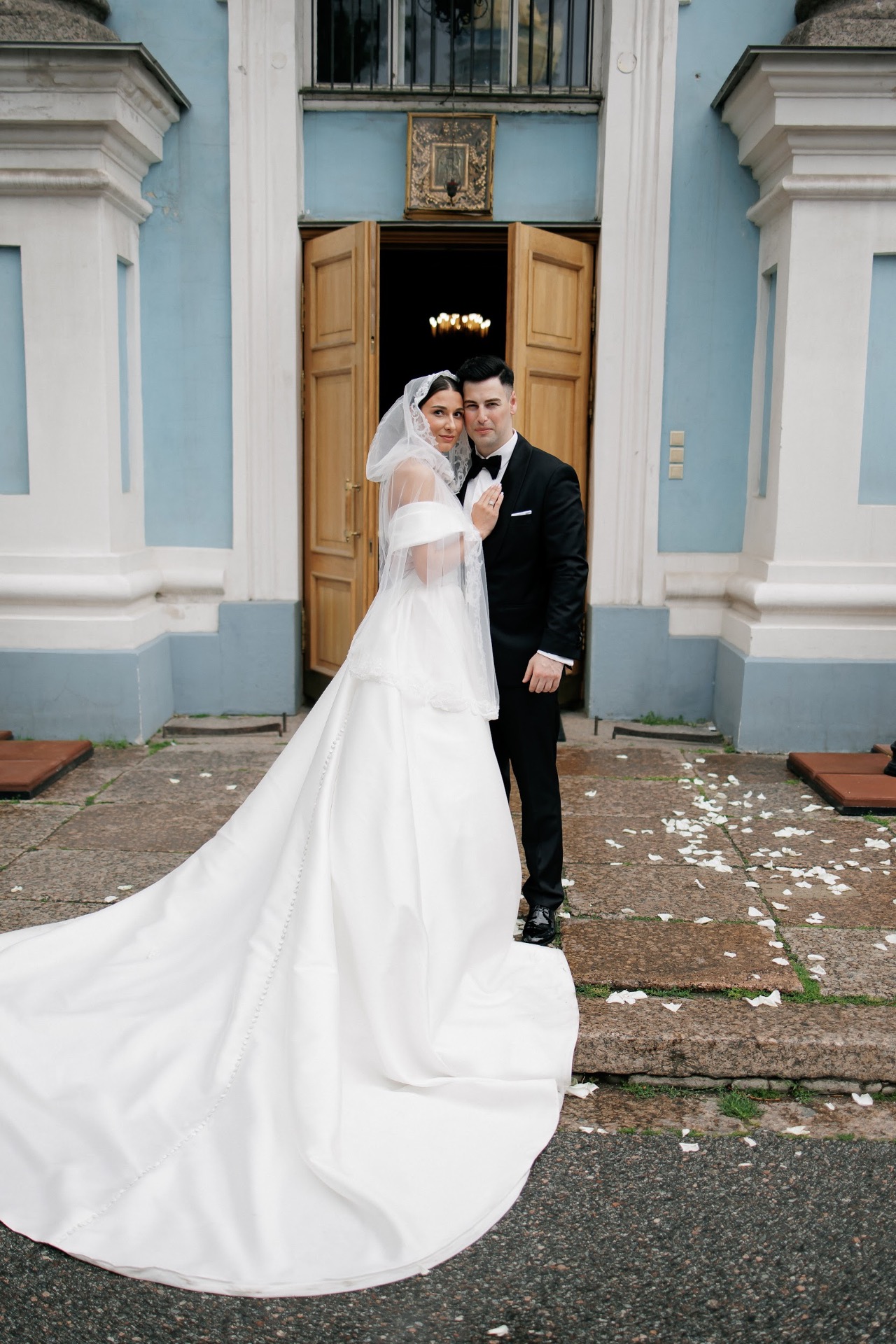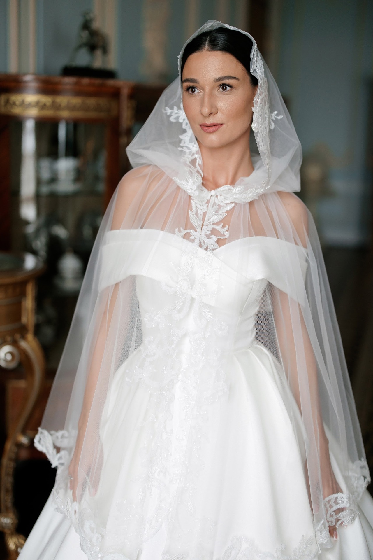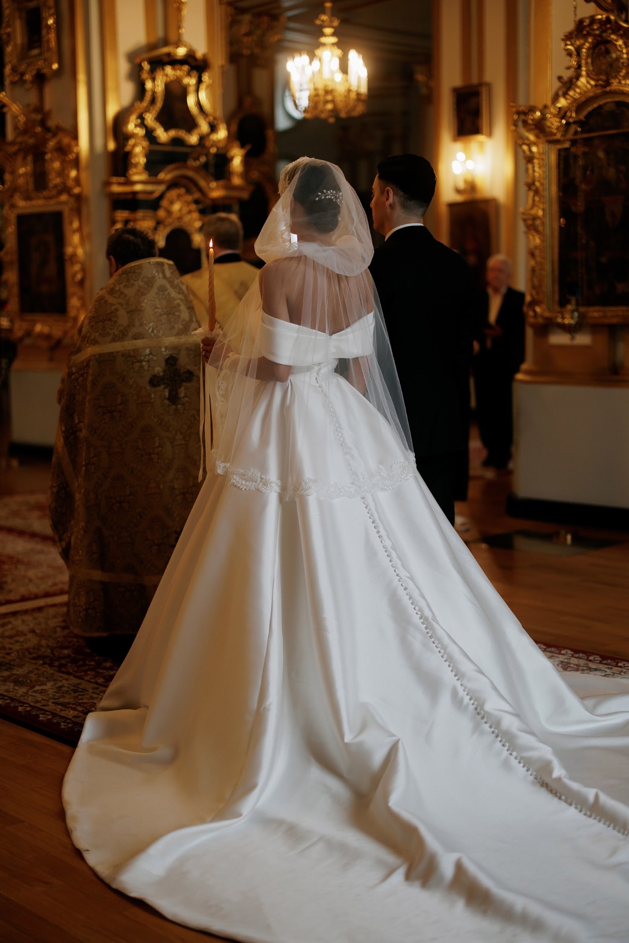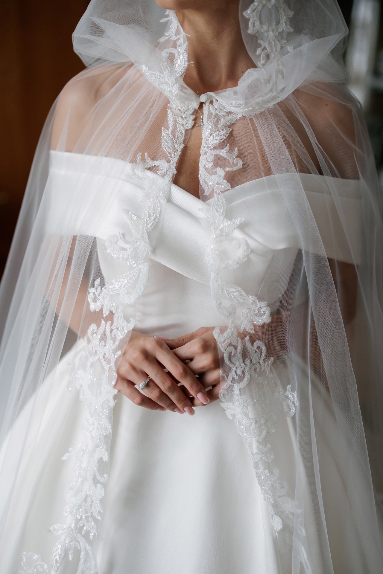 Для венчания к атласному платью мы предусмотрели лёгкий кейп, чтобы закрыть плечи и соблюсти все традиции.