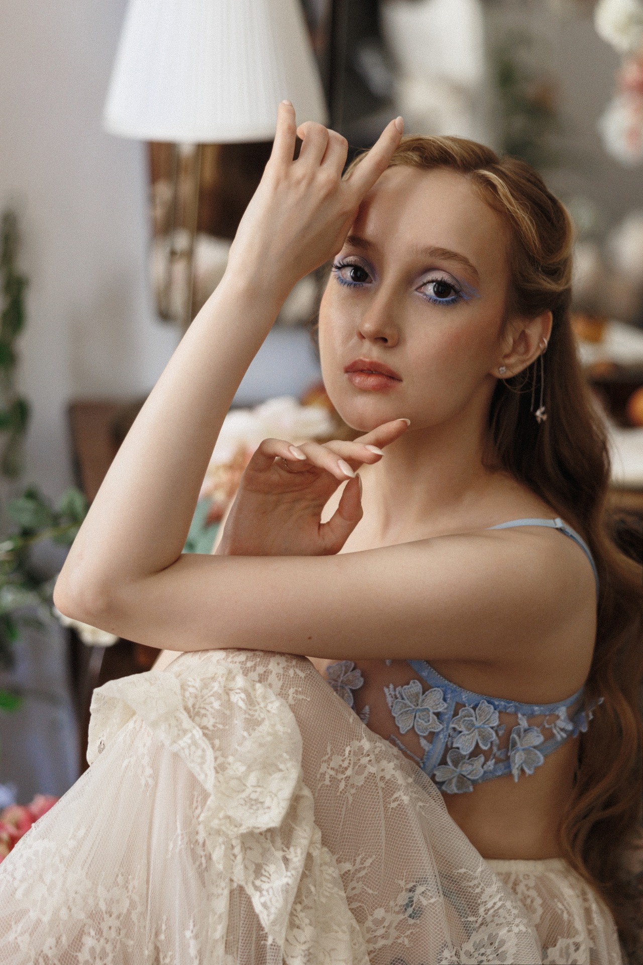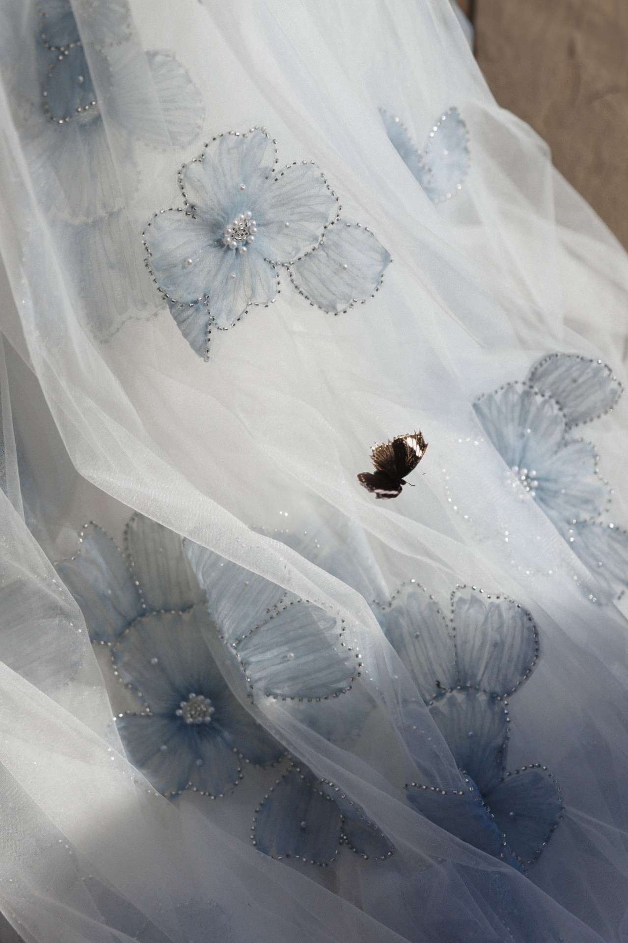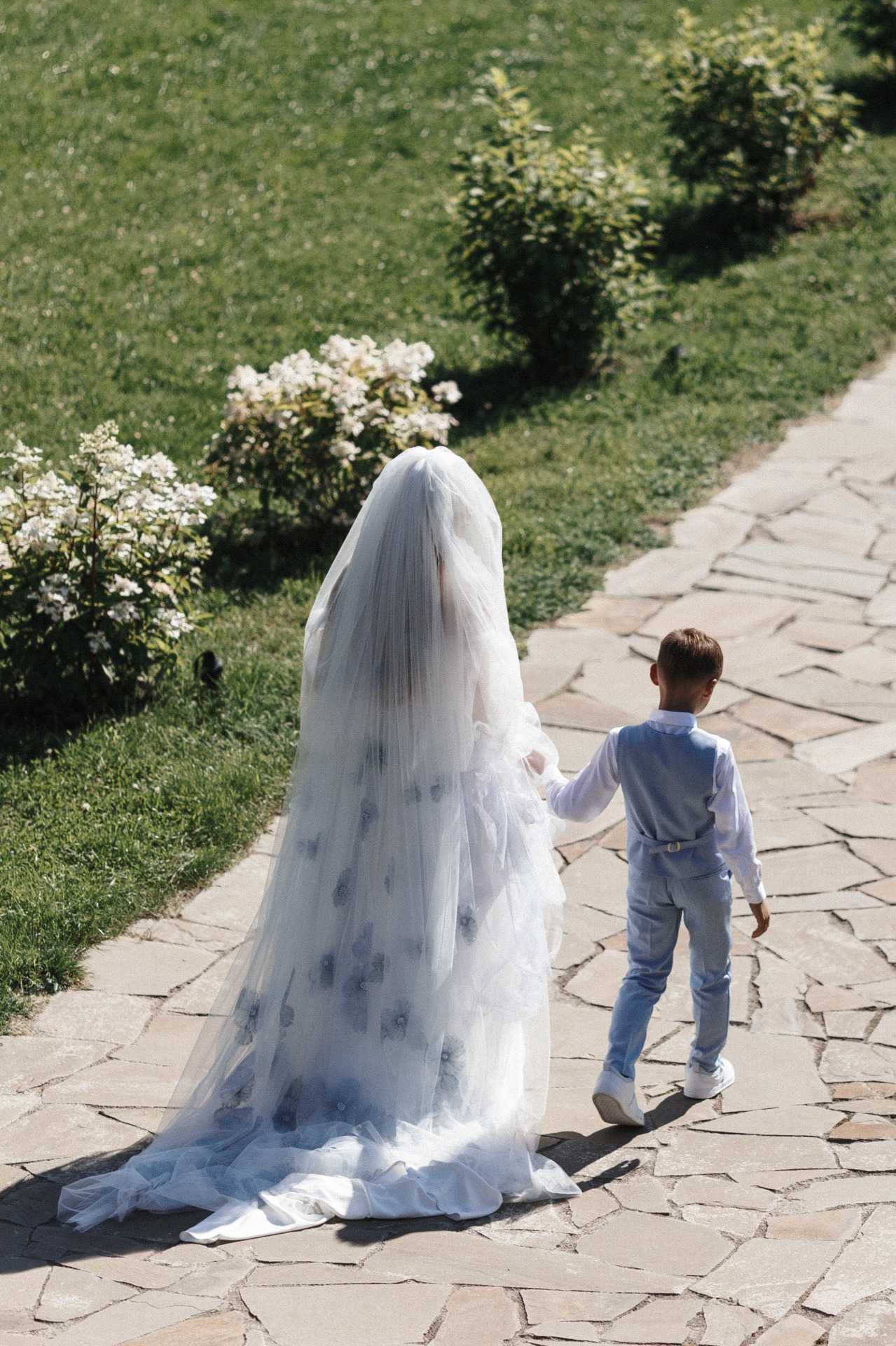 Идея образа невесты существовала лишь в моей голове, поэтому за реализацией я пришла со своими скетчами. Здесь вдохновением выступила Эмили Тима Бертона. Платье с лавандовыми и голубыми деталями. И трёхметровая фата, её моя мастерица расшивала цветами вручную.