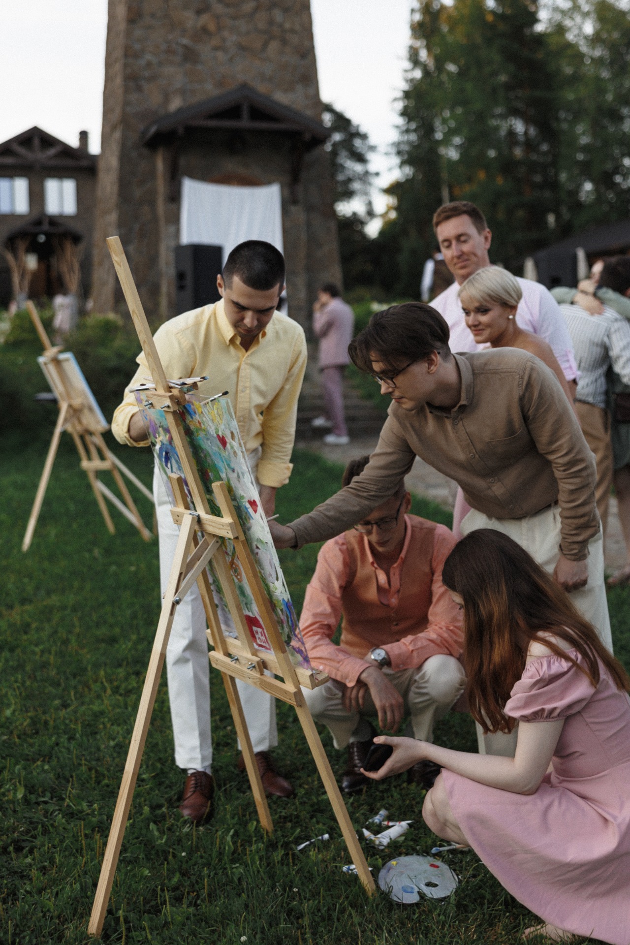 Я же 6 месяцев писала картины для декора, чтобы в конце вечера каждый гость забрал с собой частичку этого дня. Важно отметить, что я не художница, и в последний раз держала кисти в руках лет за 10 до торжества. Но нам было важно сделать что-то своими руками, и я решила рискнуть.