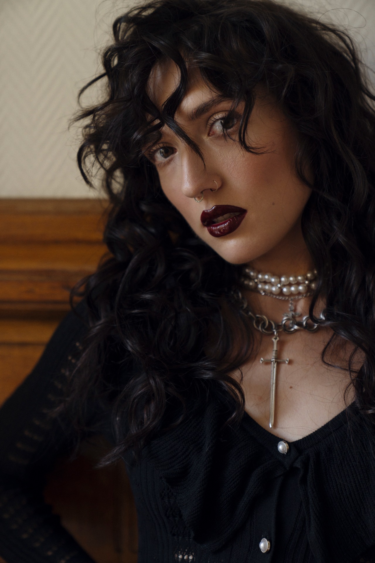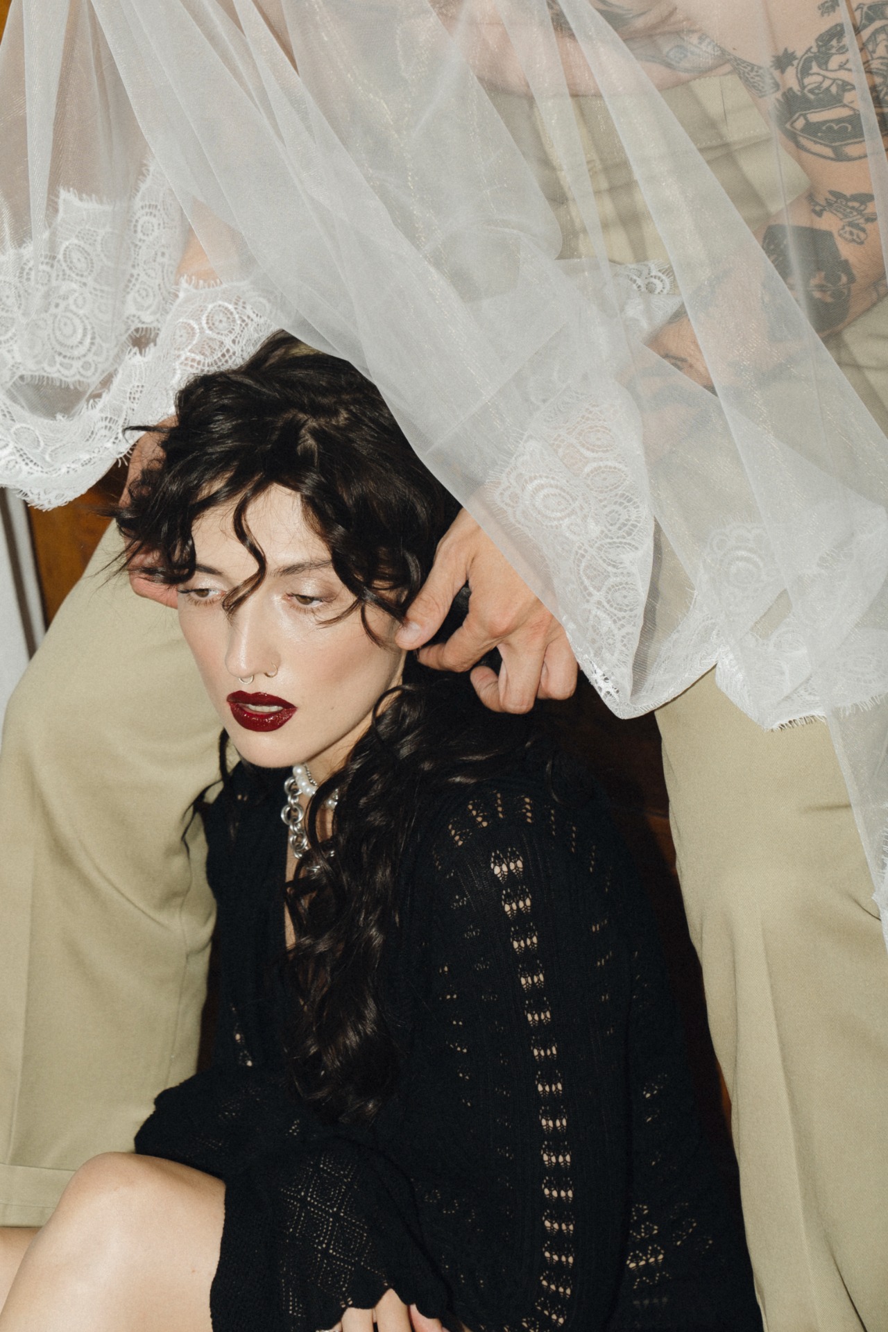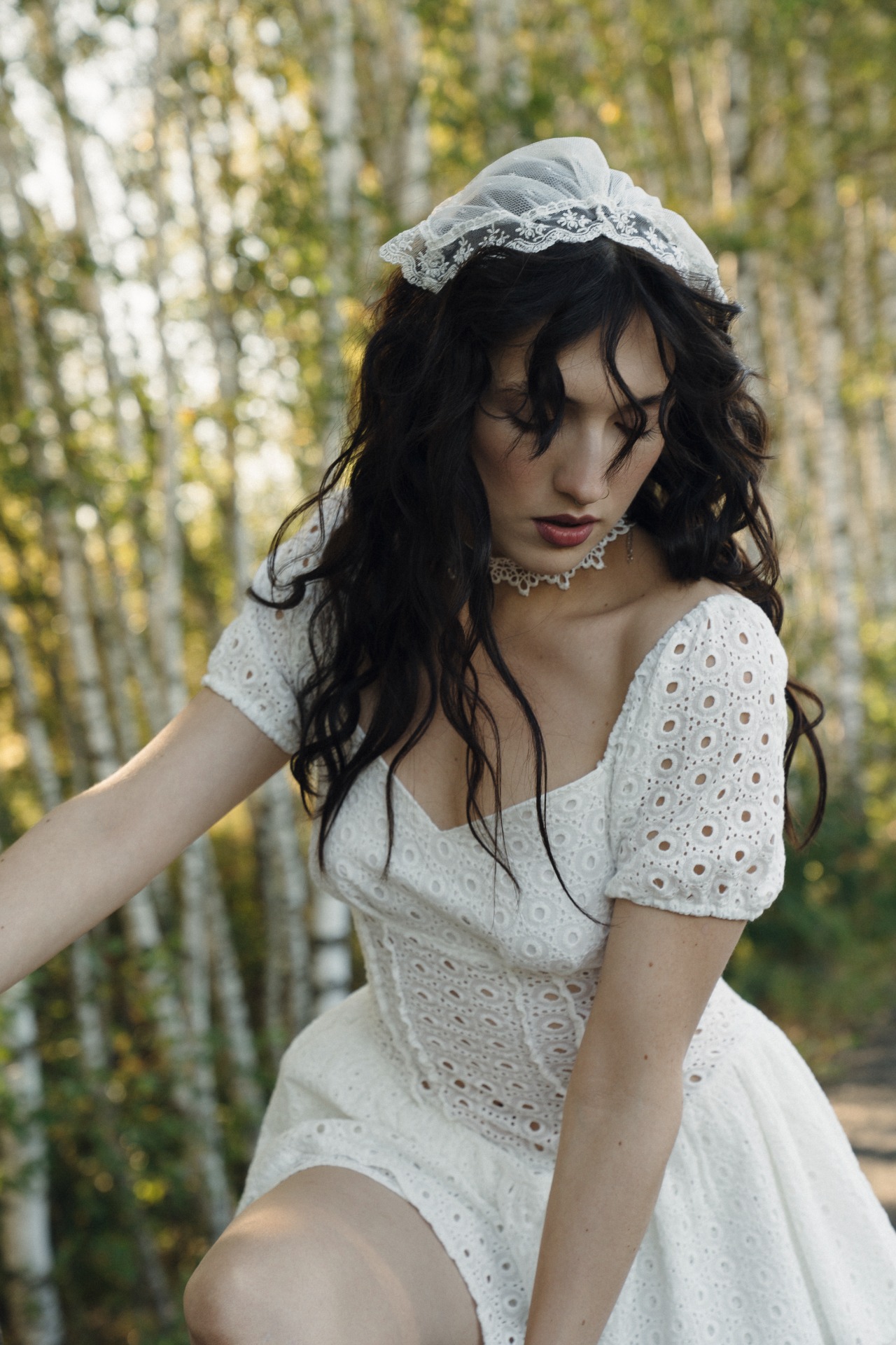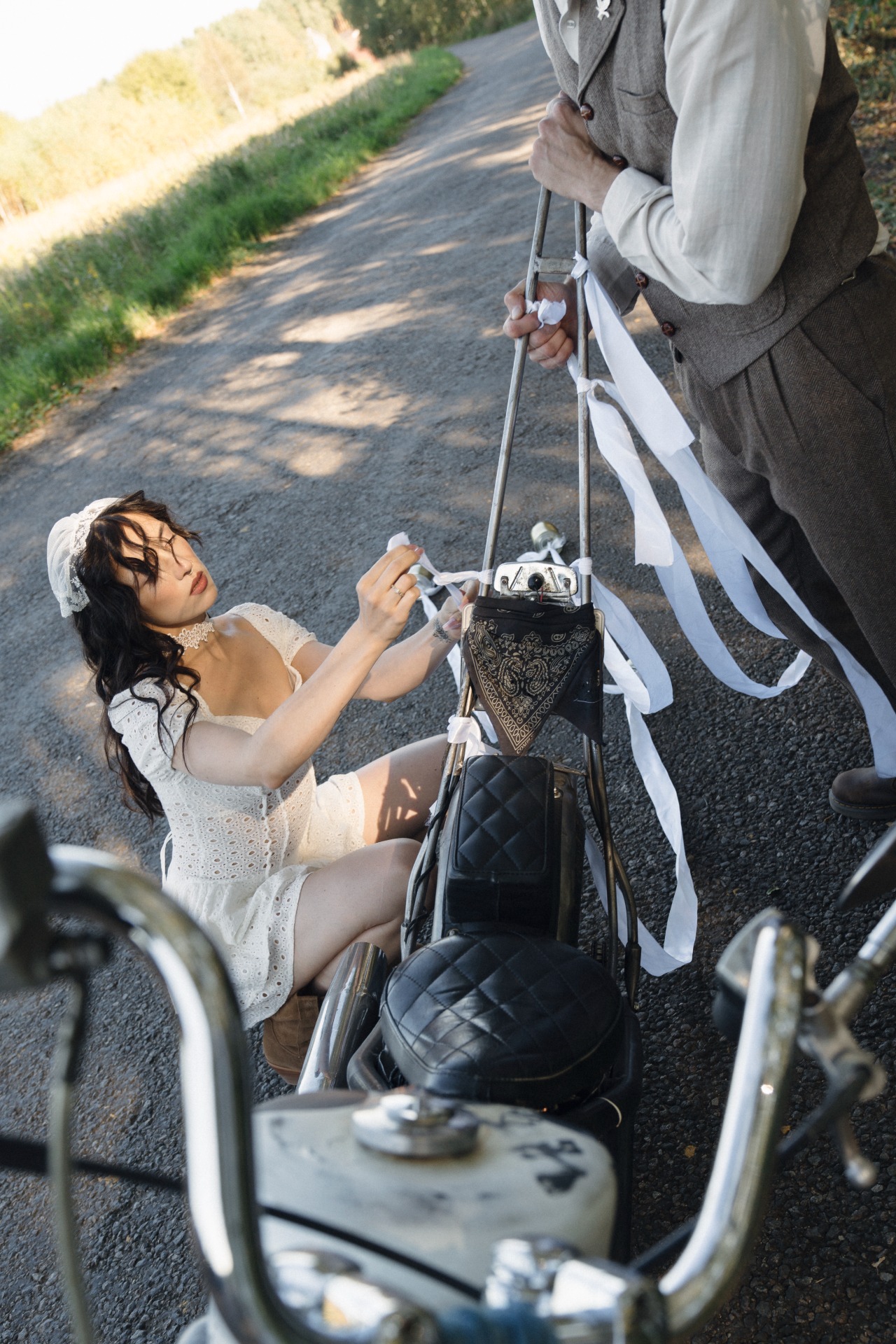 Для поездки на мотоцикле я купила платье-шорты из ткани с шитьём и попросила дизайнера подготовить косынку. Хотелось винтажных образов, поэтому на утро брала фату испанку, несколько лёгких молочных платьев и одно чёрное, что подарил мне Саня. Выбирали по факту на месте, я доверилась команде в решении делать утро в чёрном варианте, уходя от стереотипов.