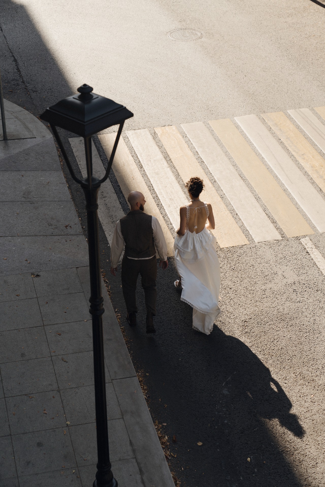 В день официальной росписи по плану были: утренние фото, прогулка, ЗАГС, были только мы и команда. После всех намеченных локаций для кадров мы остановились в Marco Polo. Зашли туда в свадебных костюмах и поняли, как наши образы вписались в тематику отеля. Было ощущение, будто в этом большом мире только мы.