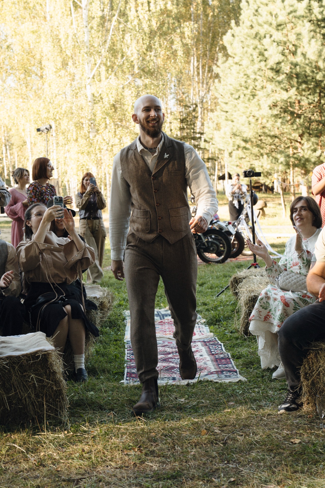 Образ жениха Саня подбирал себе из имеющихся вещей в гардеробе: мерчёвых маек, брюк и аксессуаров. Нам нравится стиль друг друга, поэтому мы быстро сошлись во мнениях. На торжество выбрали коричневый твидовый костюм. Дополнили образ шляпой, хлопковой рубашкой и челси Dr.Martens.