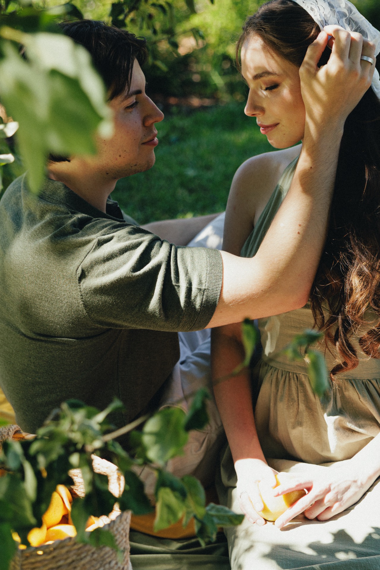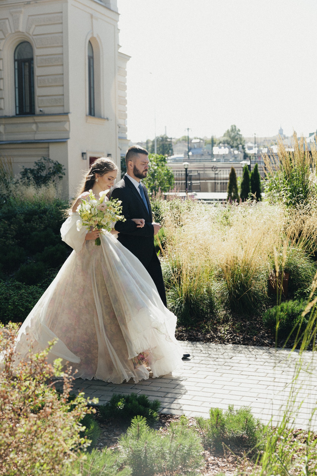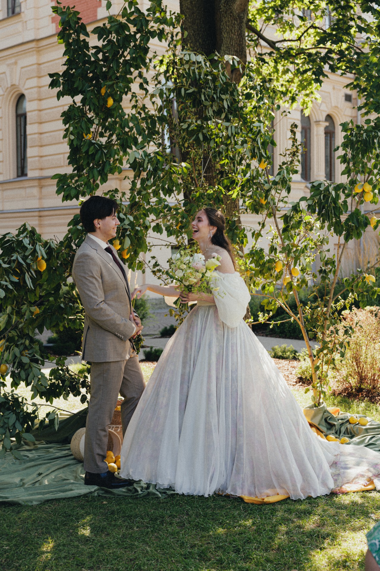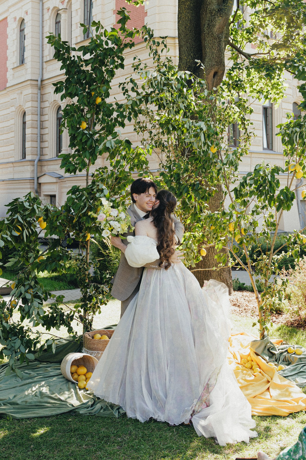 Платье Ани — это любовь с первого взгляда. Она приметила его ещё до активной подготовки. А когда мы определились с площадкой и концепцией, то постарались «вплести» образ в общую историю свадьбы. И получилось невероятно: пышное платье с цветочной вуалью буквально расцвело на фоне лимонного дерева во время церемонии.