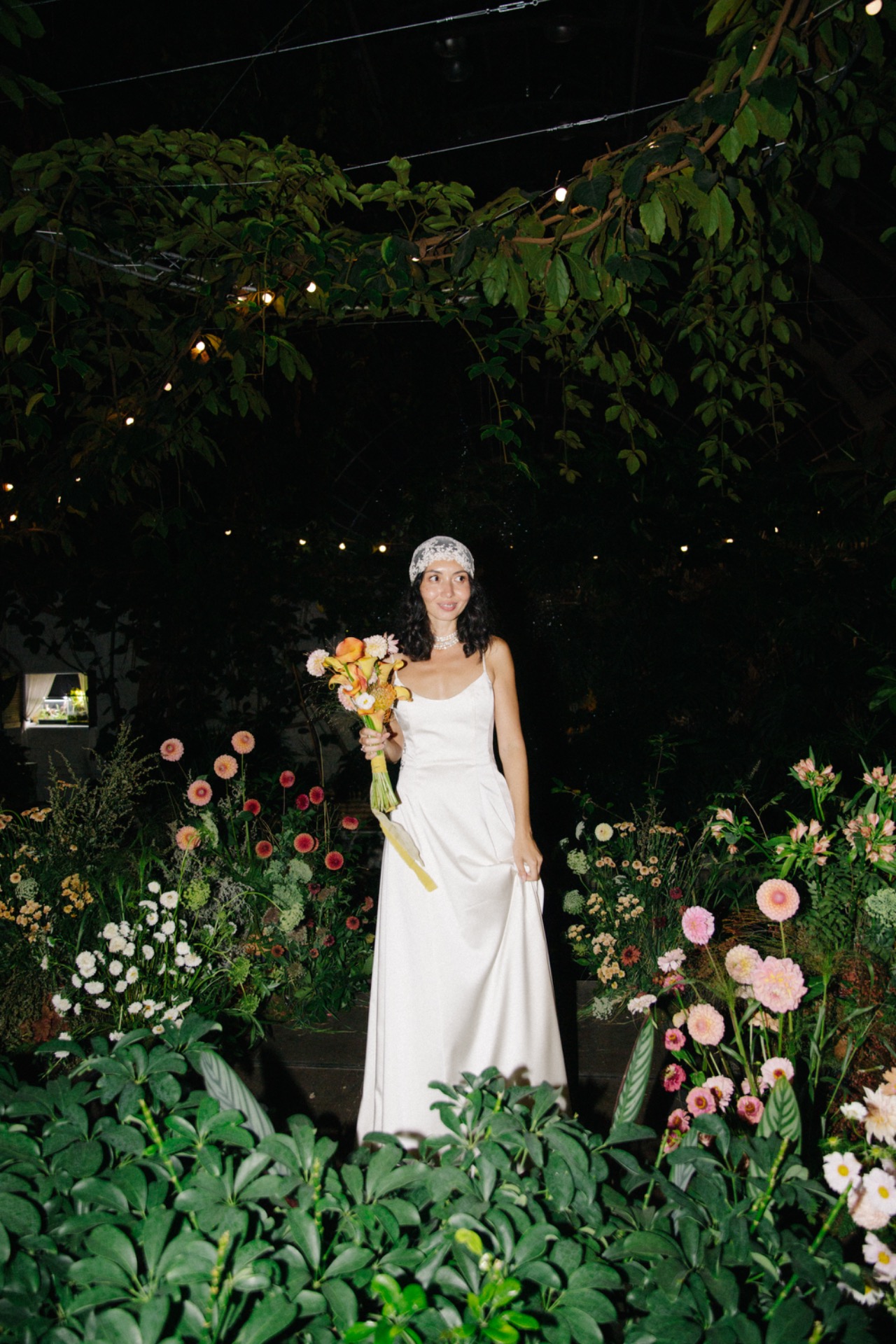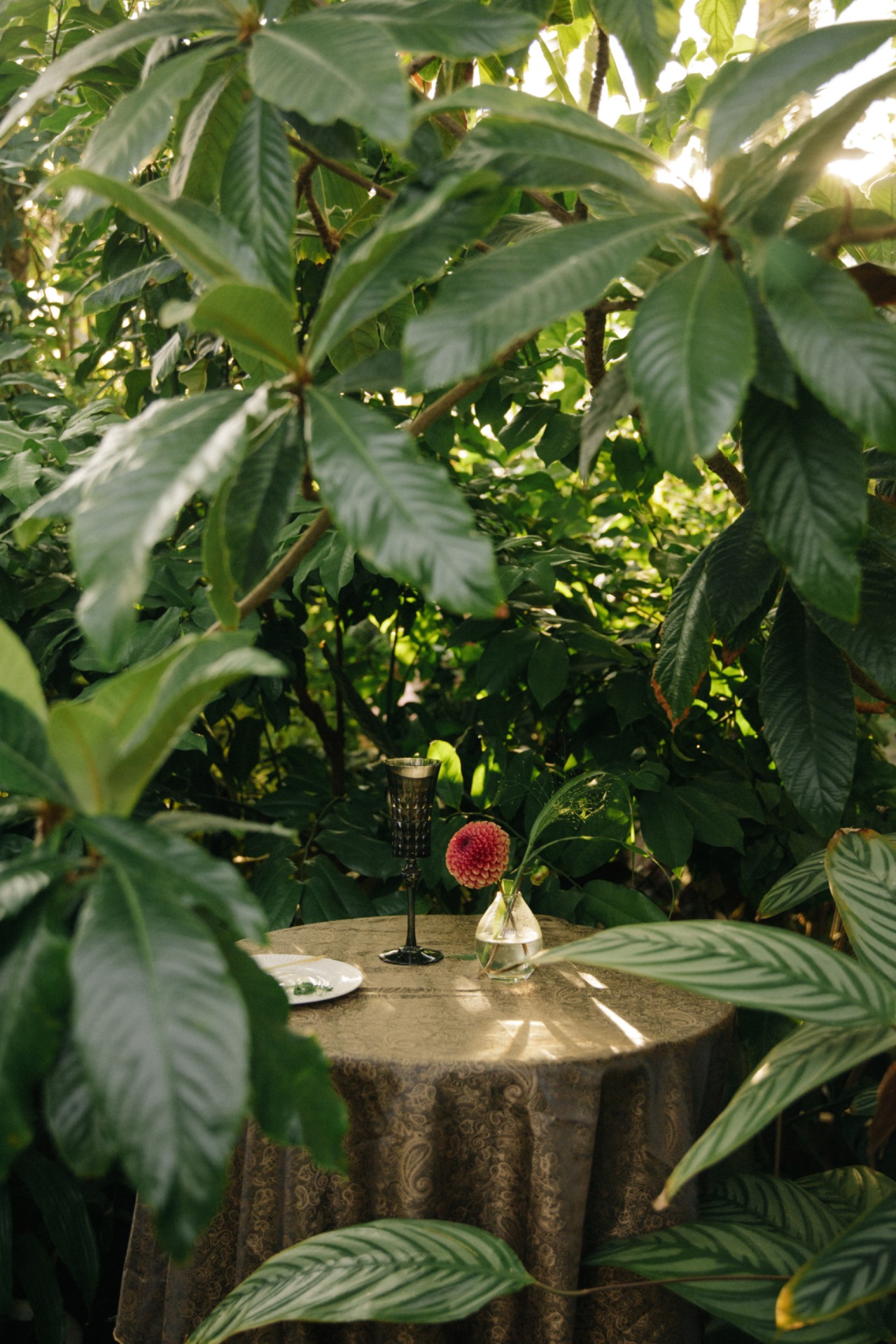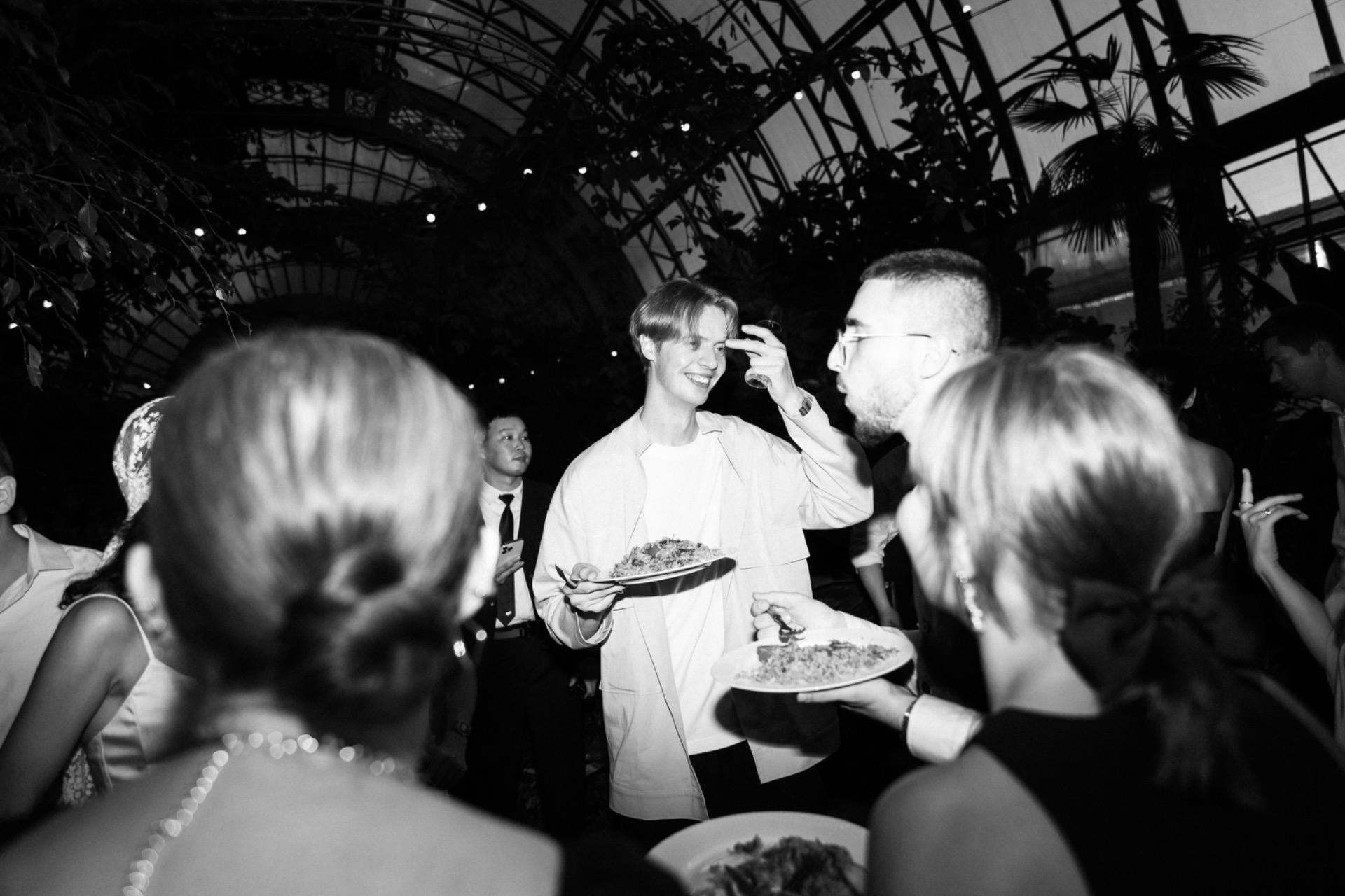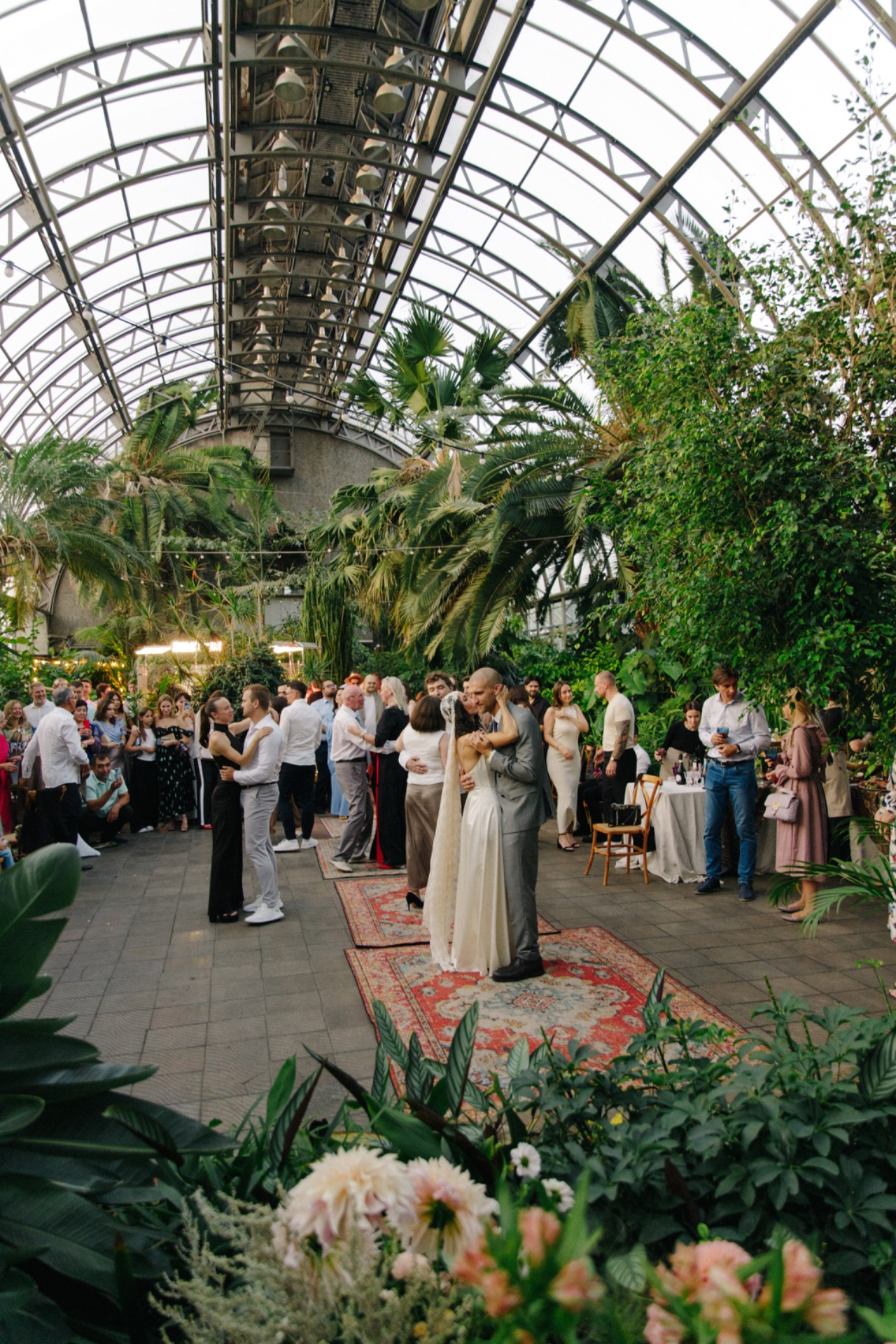 Мы не ограничивали друзей дресс-кодом, основную палитру задавала сама оранжерея, а декораторы дополнили её цветами, мебелью и принтами.