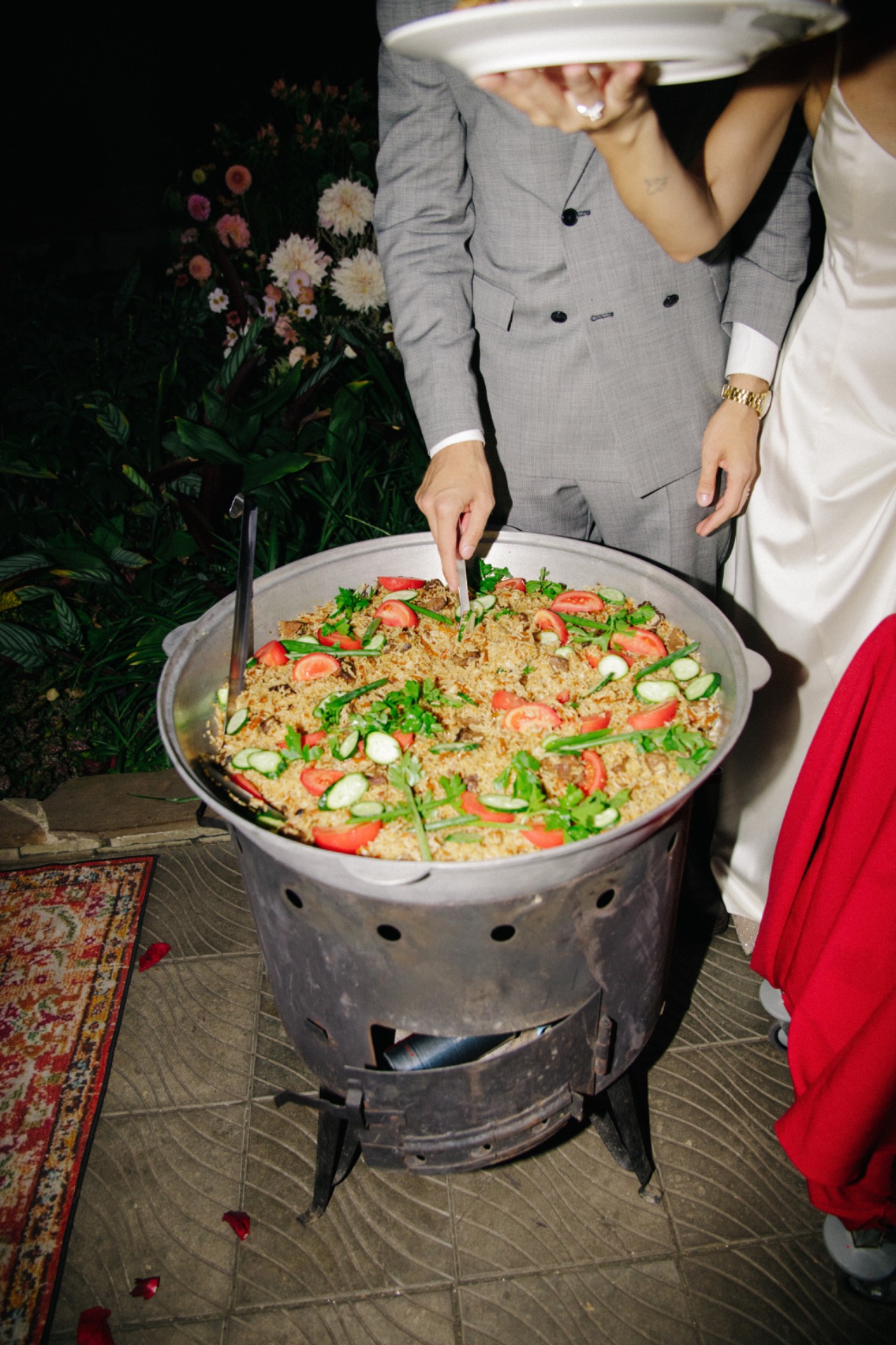 Из фишек — мы совместили национальные мотивы Узбекистана и красивый винтаж. Привезли старинную мягкую мебель, восточные ковры, столы накрыли традиционными тканями с принтами и вышивкой. В декоре было много зелени и фермерских цветов. На второе мы подали настоящий узбекский плов в огромном казане.