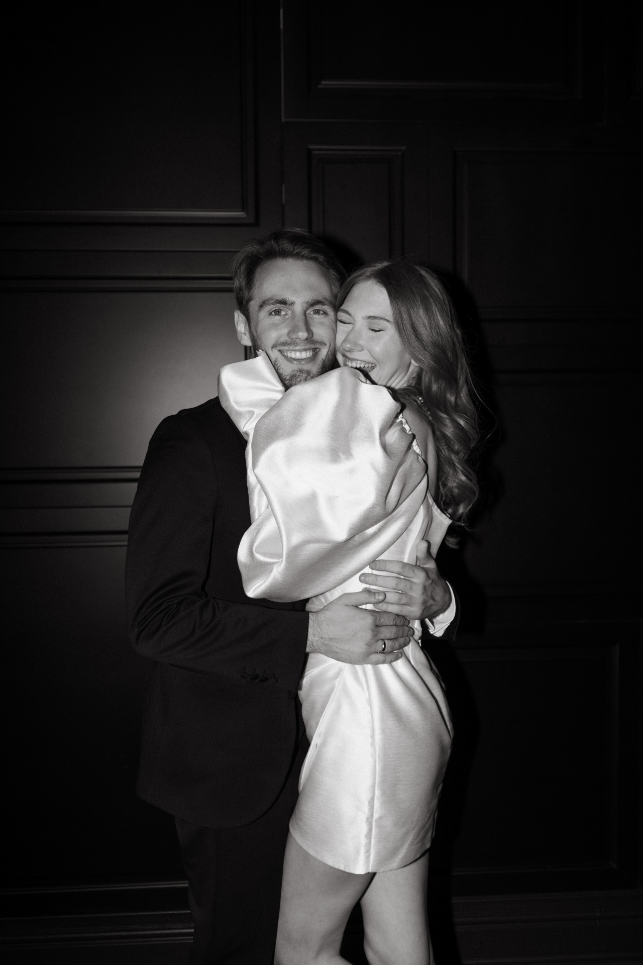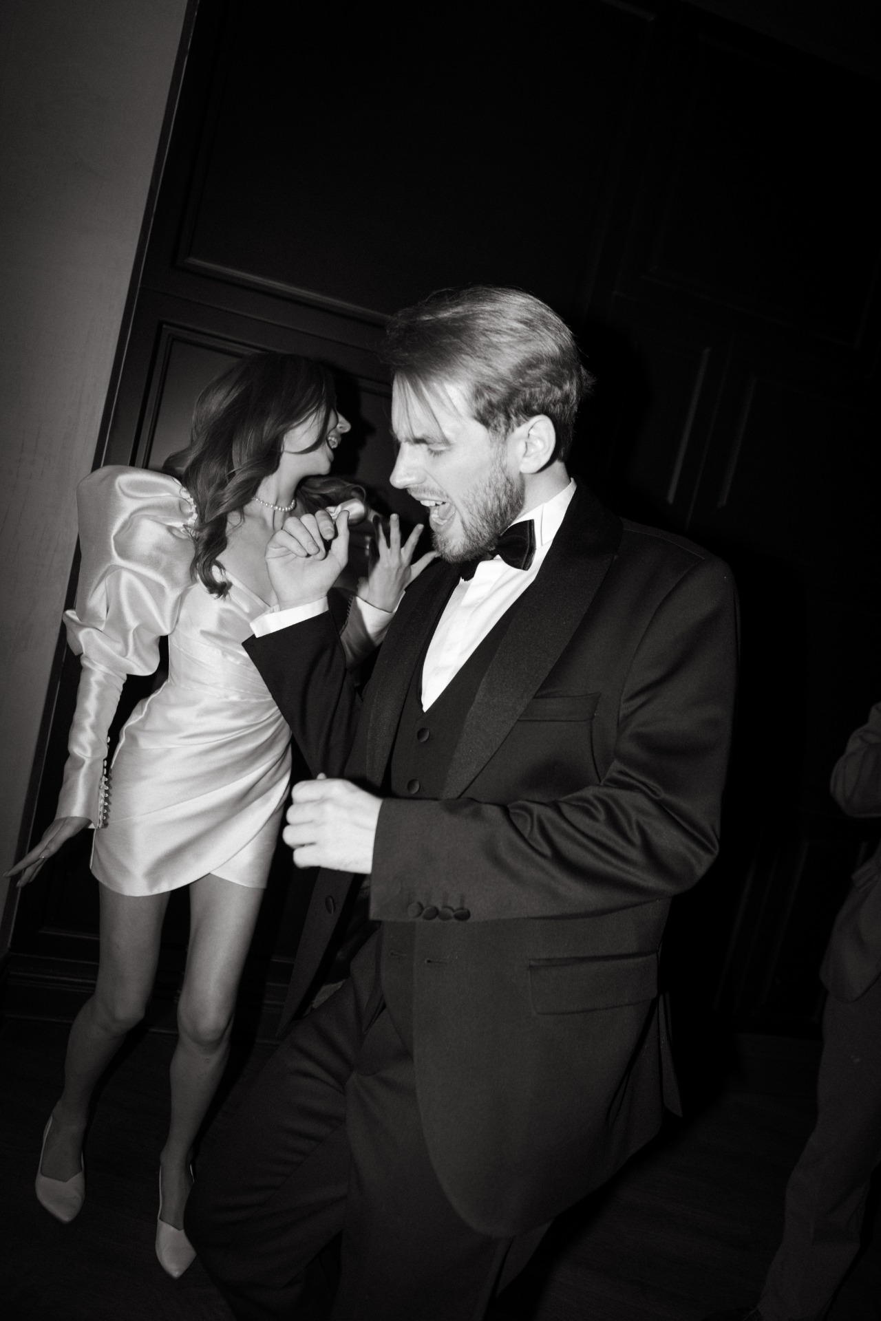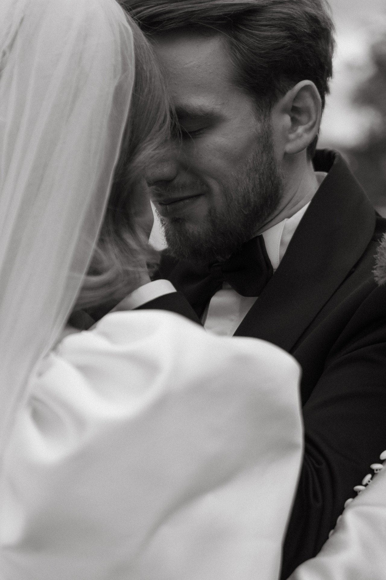 Для жениха мы выбрали классический чёрный смокинг, идеально подчёркивающий его фигуру.