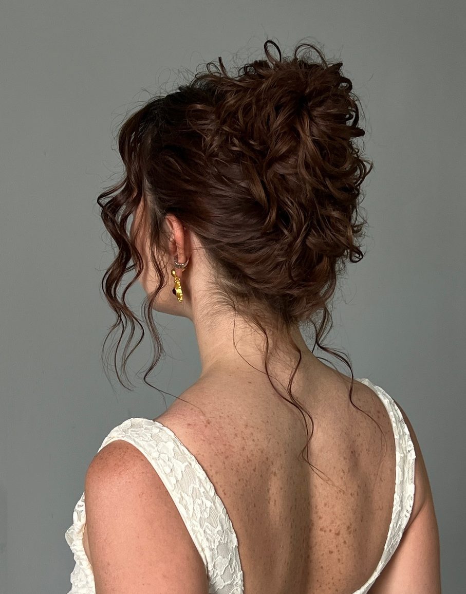 Утончённый пучок, собранный на макушке — красиво подчёркивает осанку и подходит для платьев с открытой спиной.