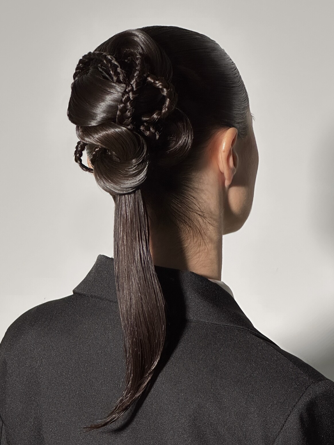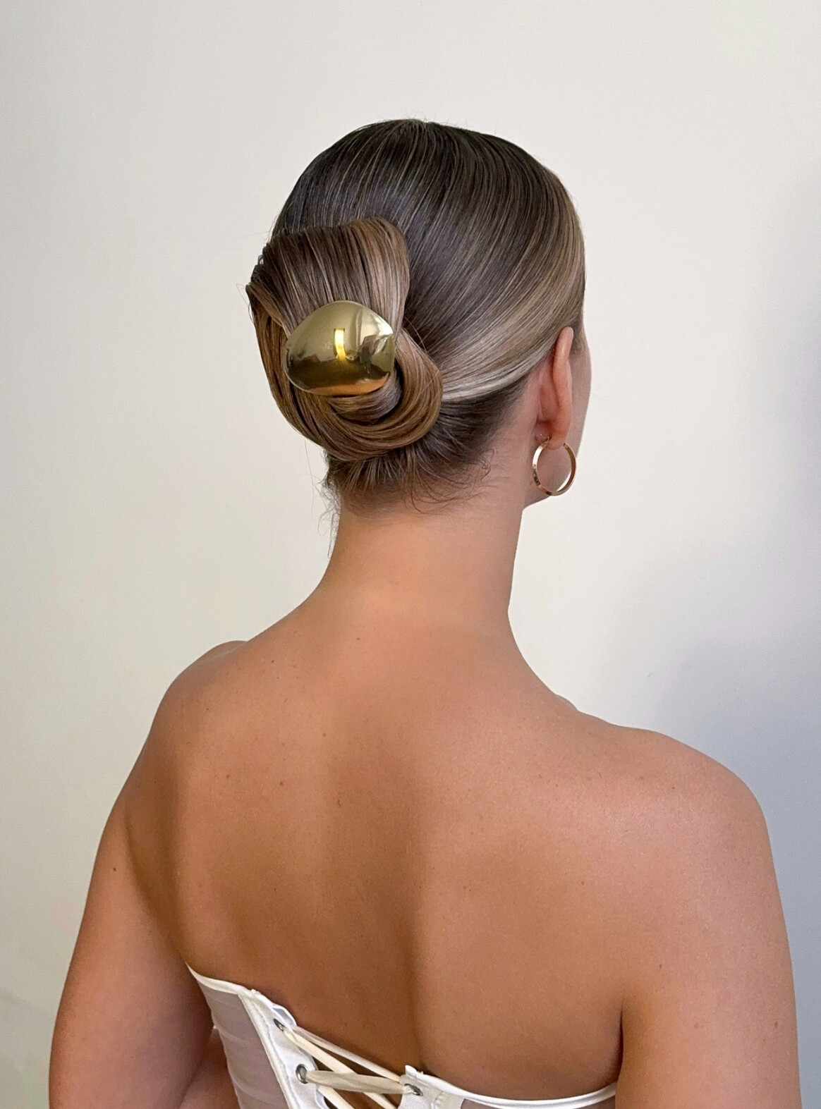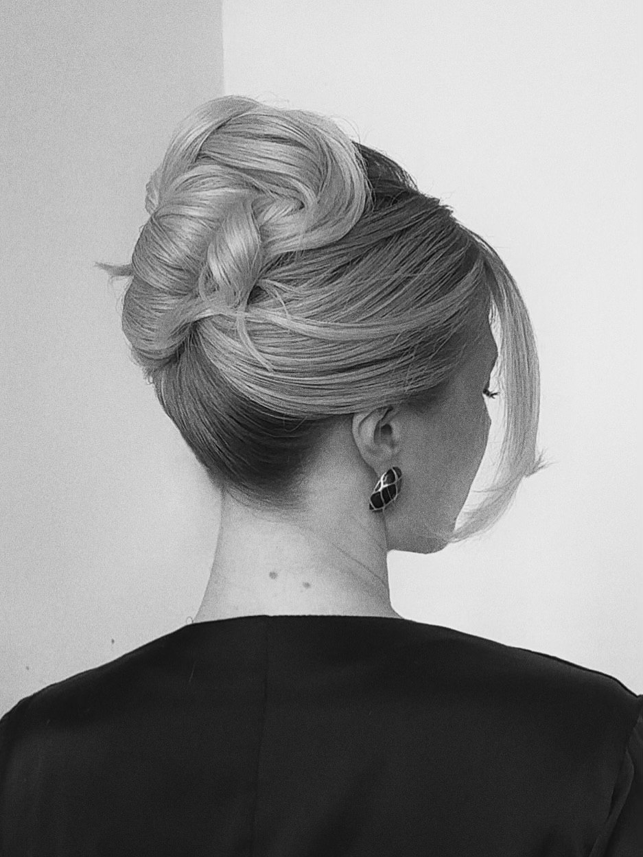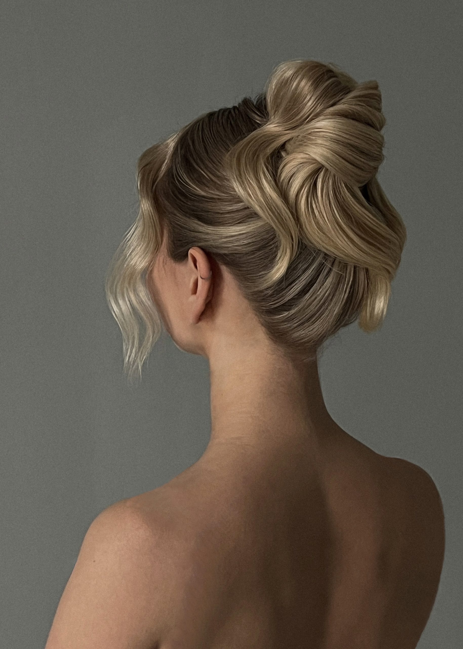 Этот пучок сложной, необычной формы — очень красиво смотрится с архитектурными платьями и смелыми образами.