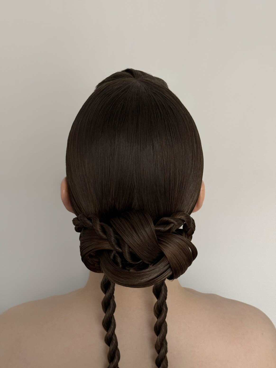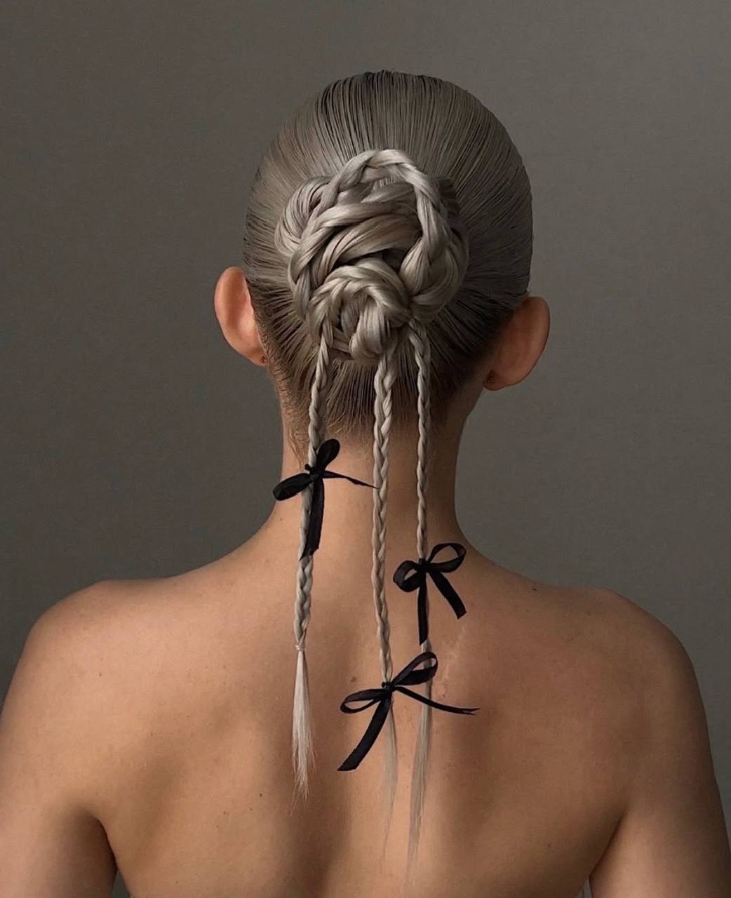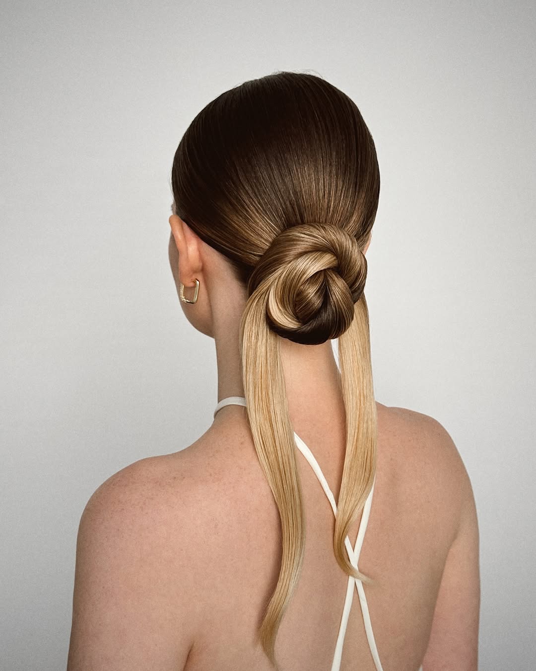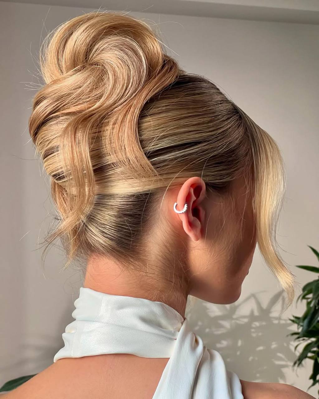 Этот пучок сложной, необычной формы — очень красиво смотрится с архитектурными платьями и смелыми образами.