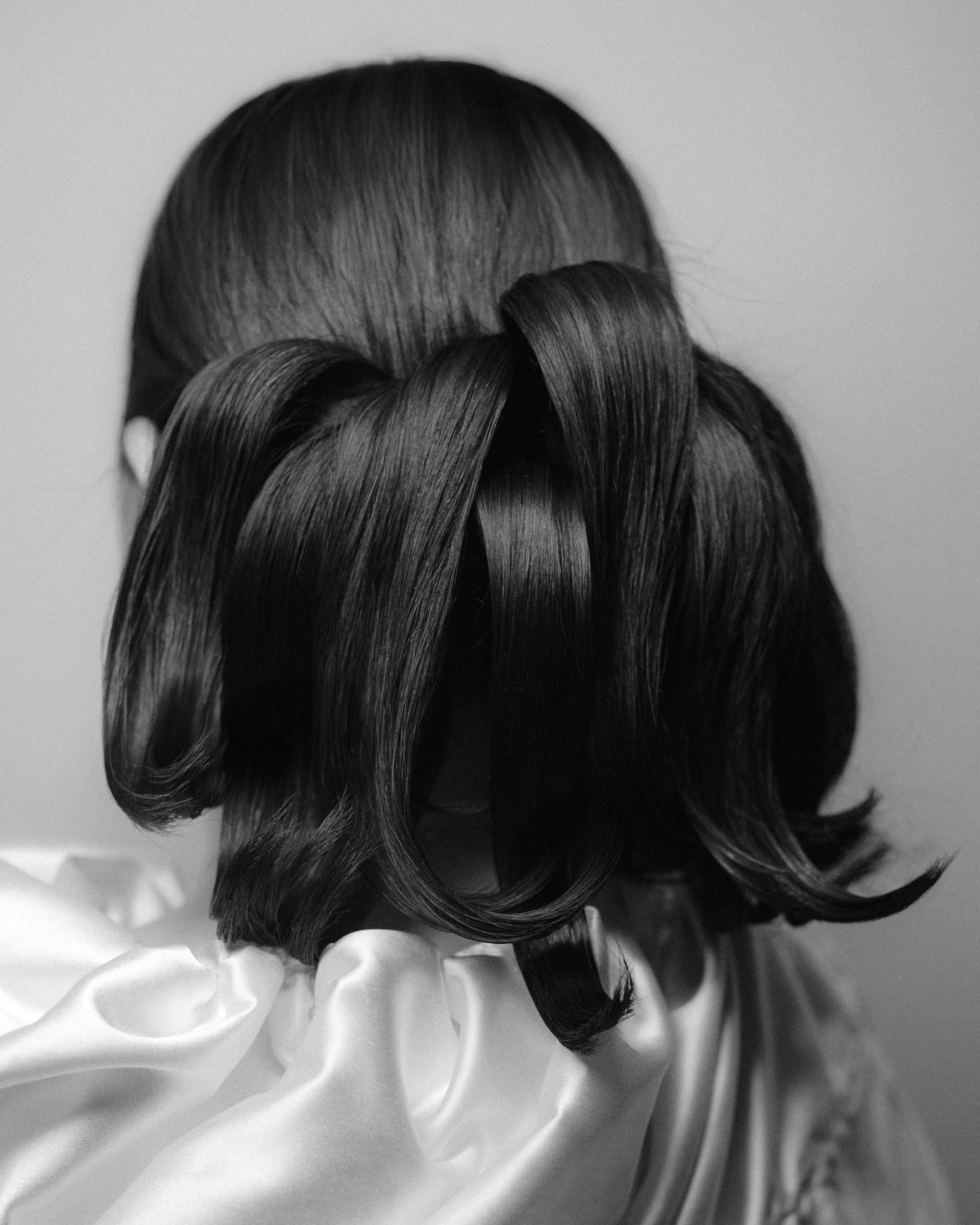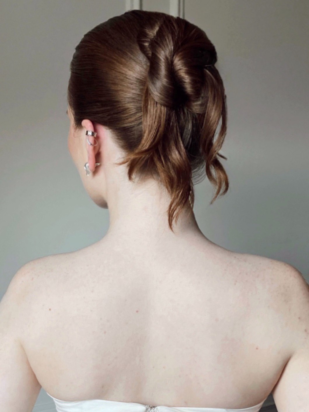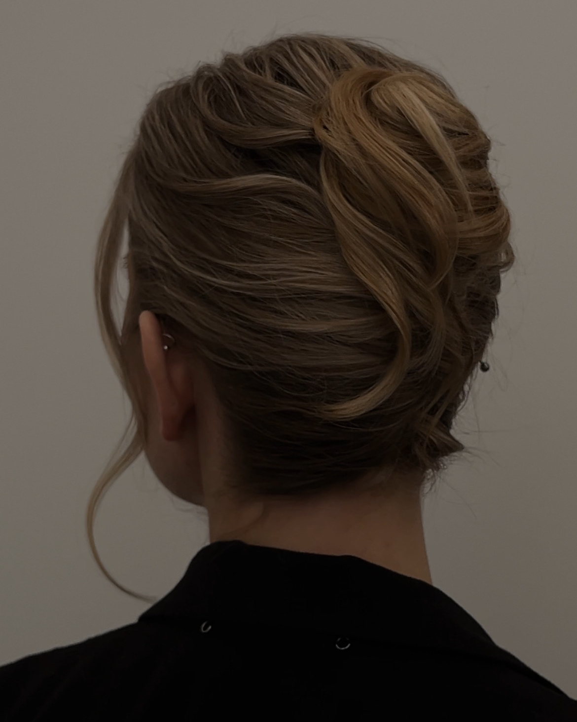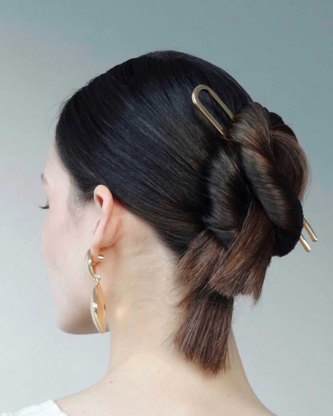Этот пучок сложной, необычной формы — очень красиво смотрится с архитектурными платьями и смелыми образами.