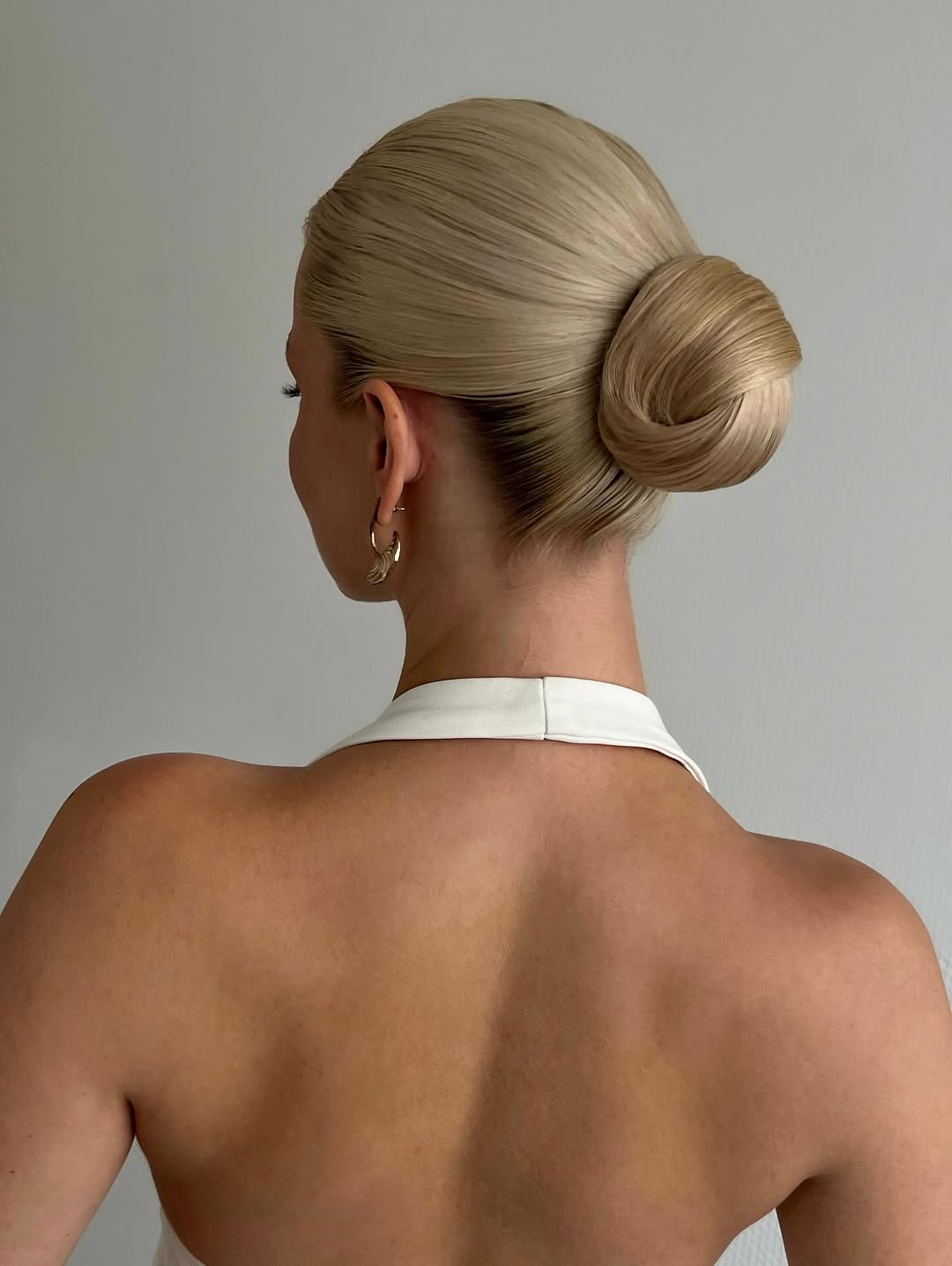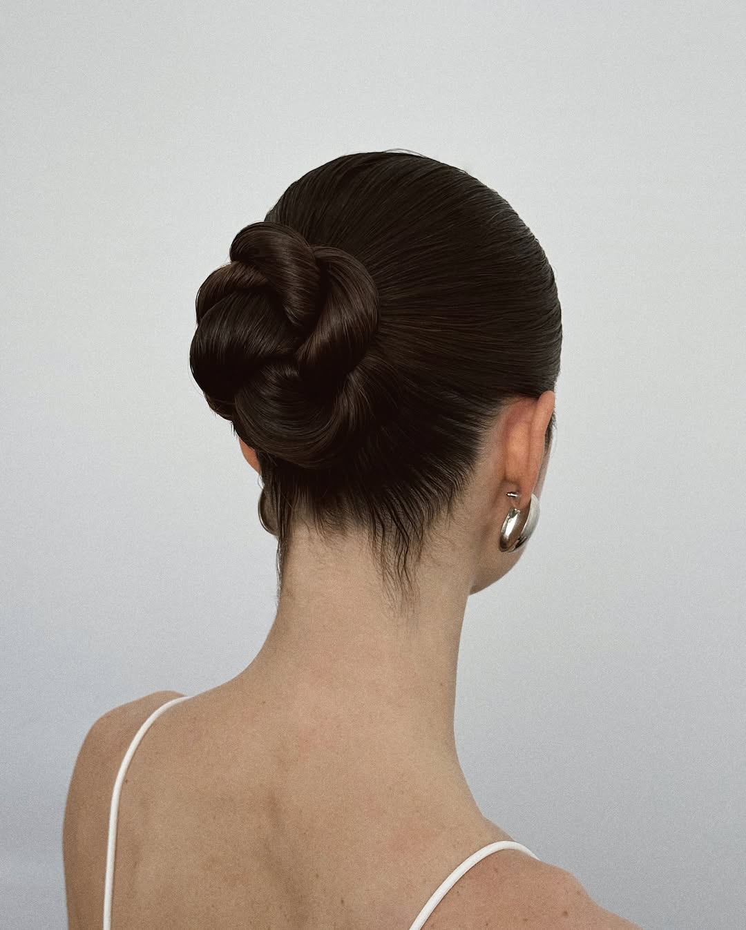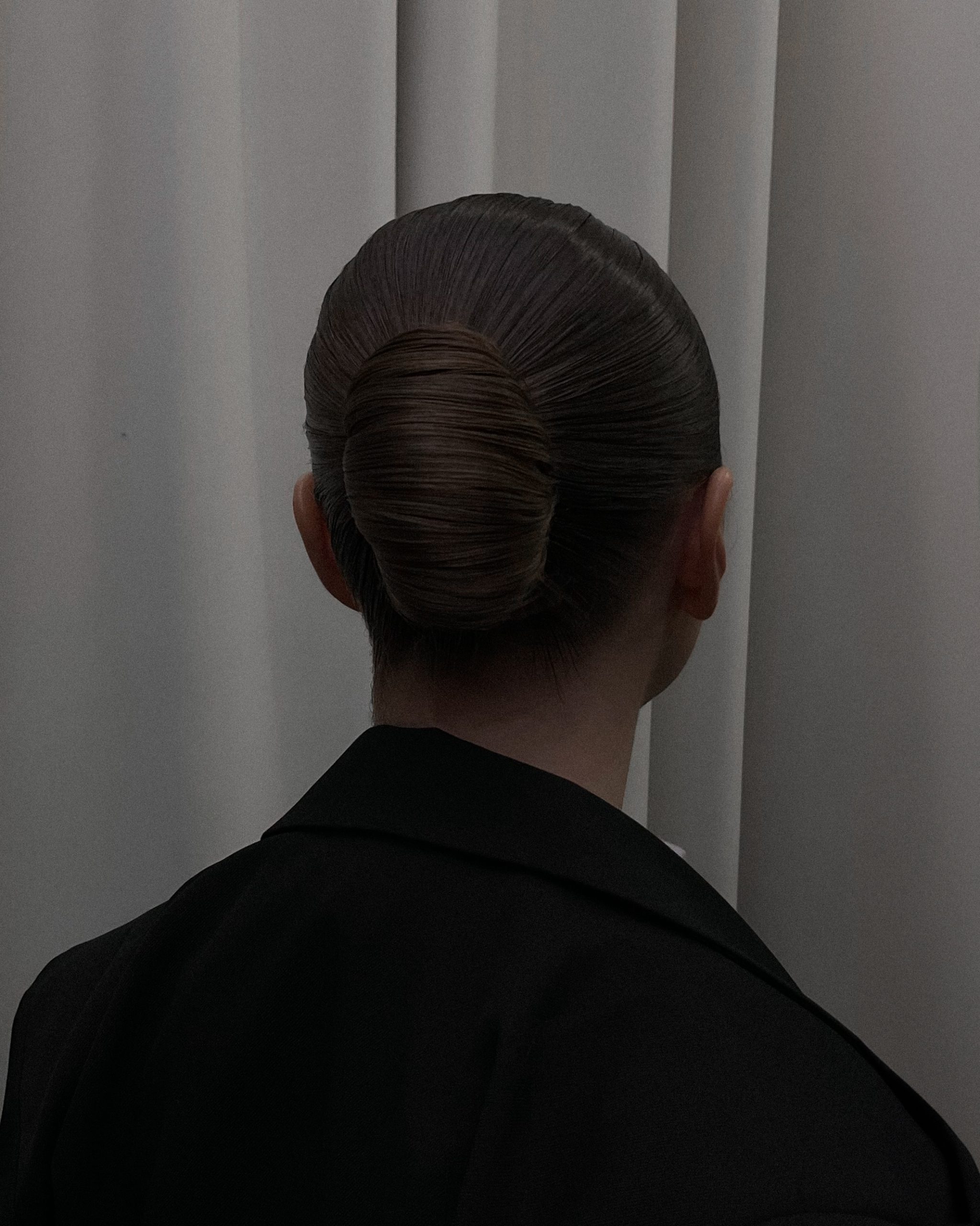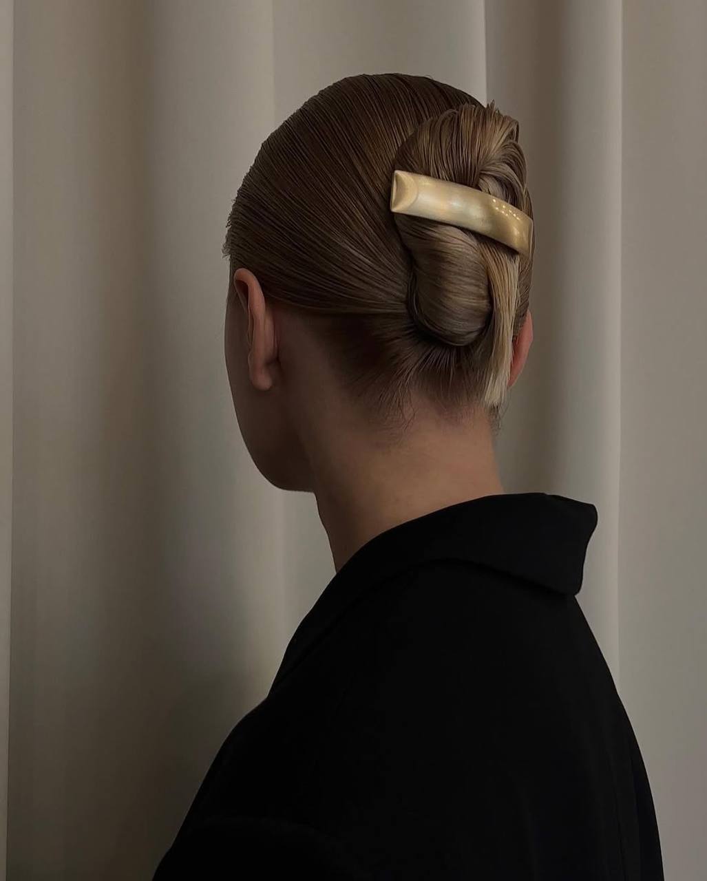 Такой пучок — вечная классика. Строгая и элегантная причёска, которая идеально подходит для минималистичных образов, струящихся силуэтов и прямых форм.