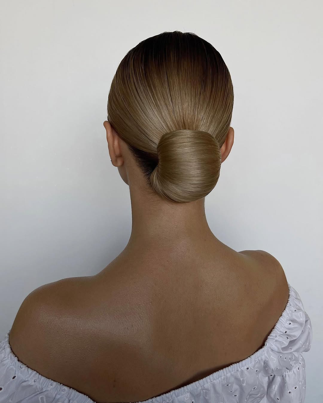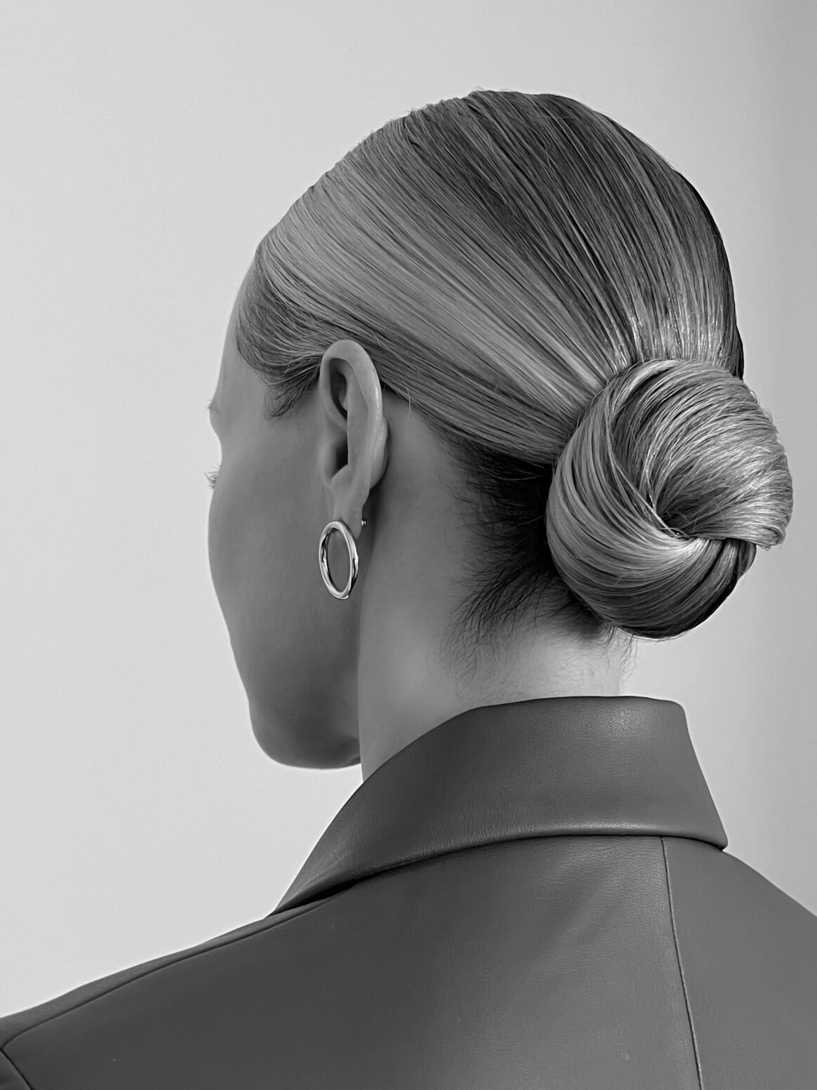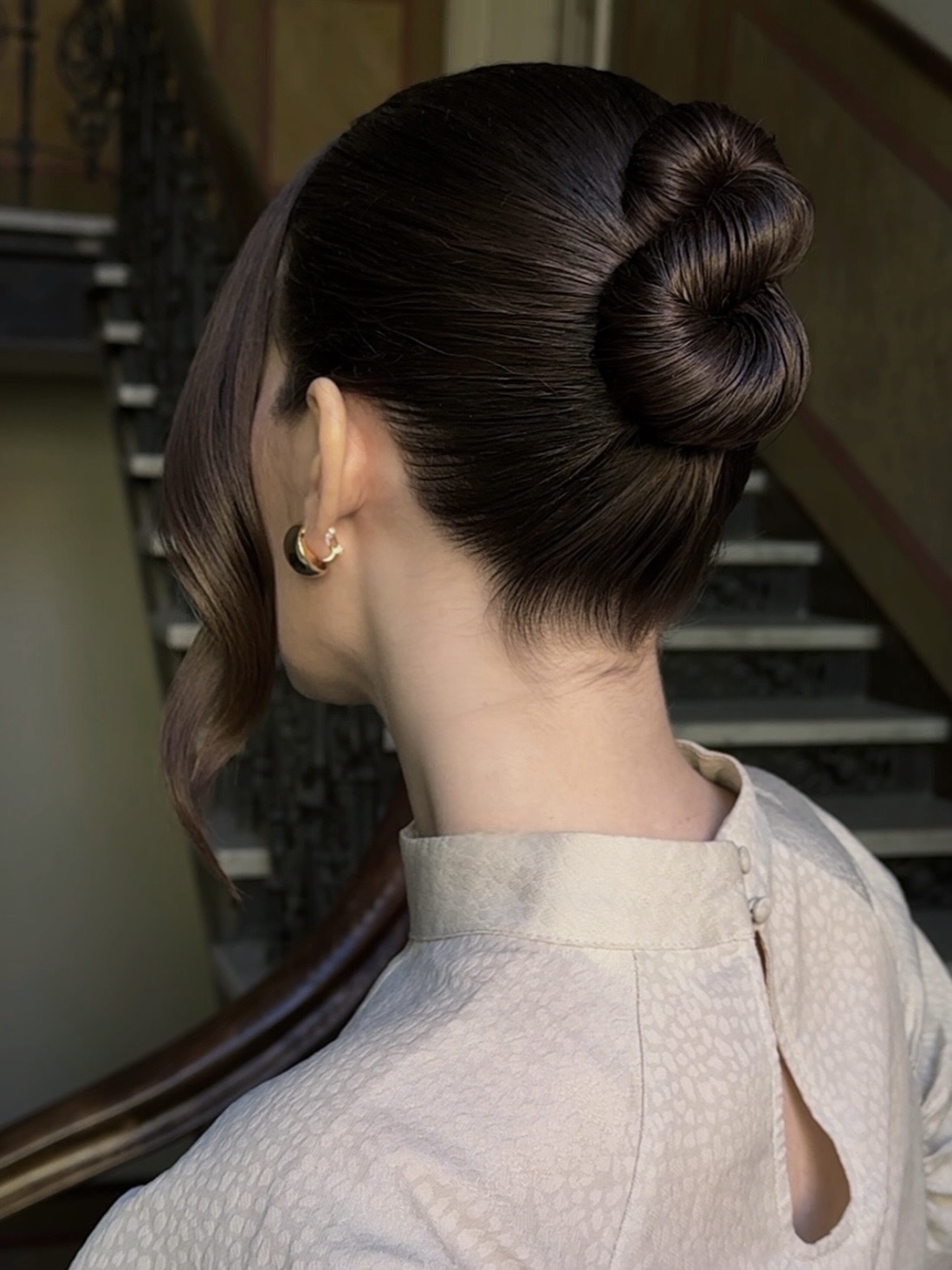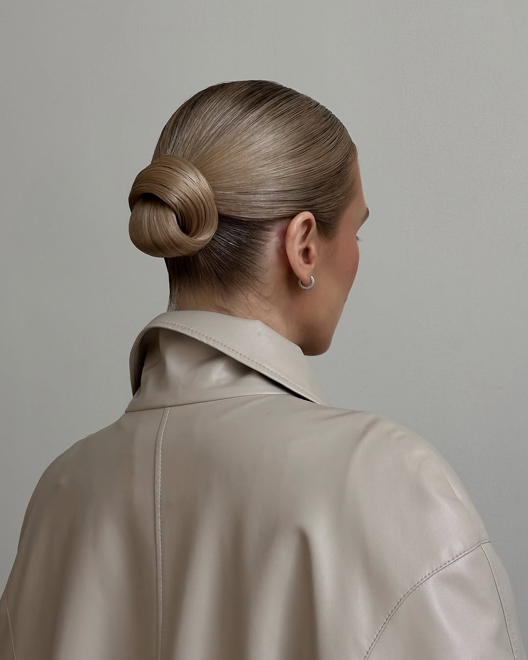 Такой пучок — вечная классика. Строгая и элегантная причёска, которая идеально подходит для минималистичных образов, струящихся силуэтов и прямых форм.