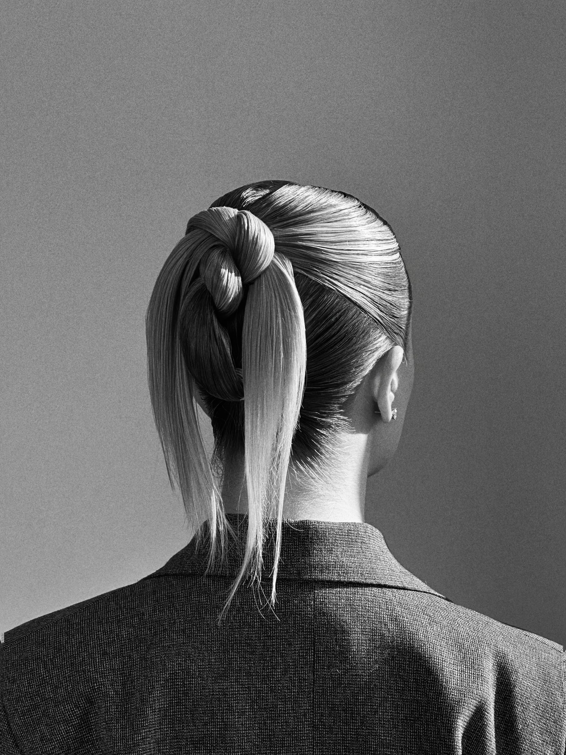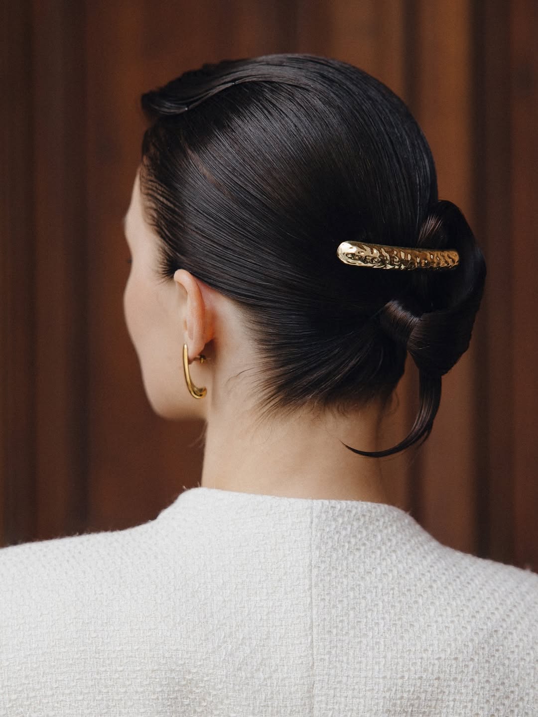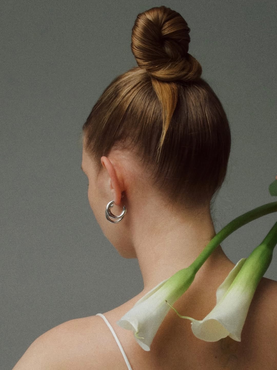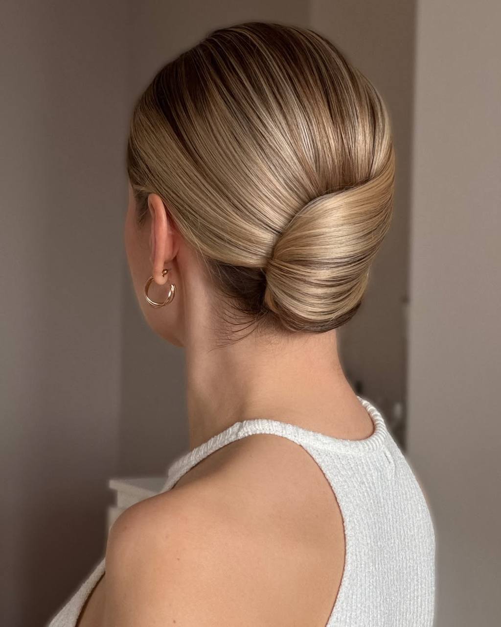 Такой пучок — вечная классика. Строгая и элегантная причёска, которая идеально подходит для минималистичных образов, струящихся силуэтов и прямых форм.