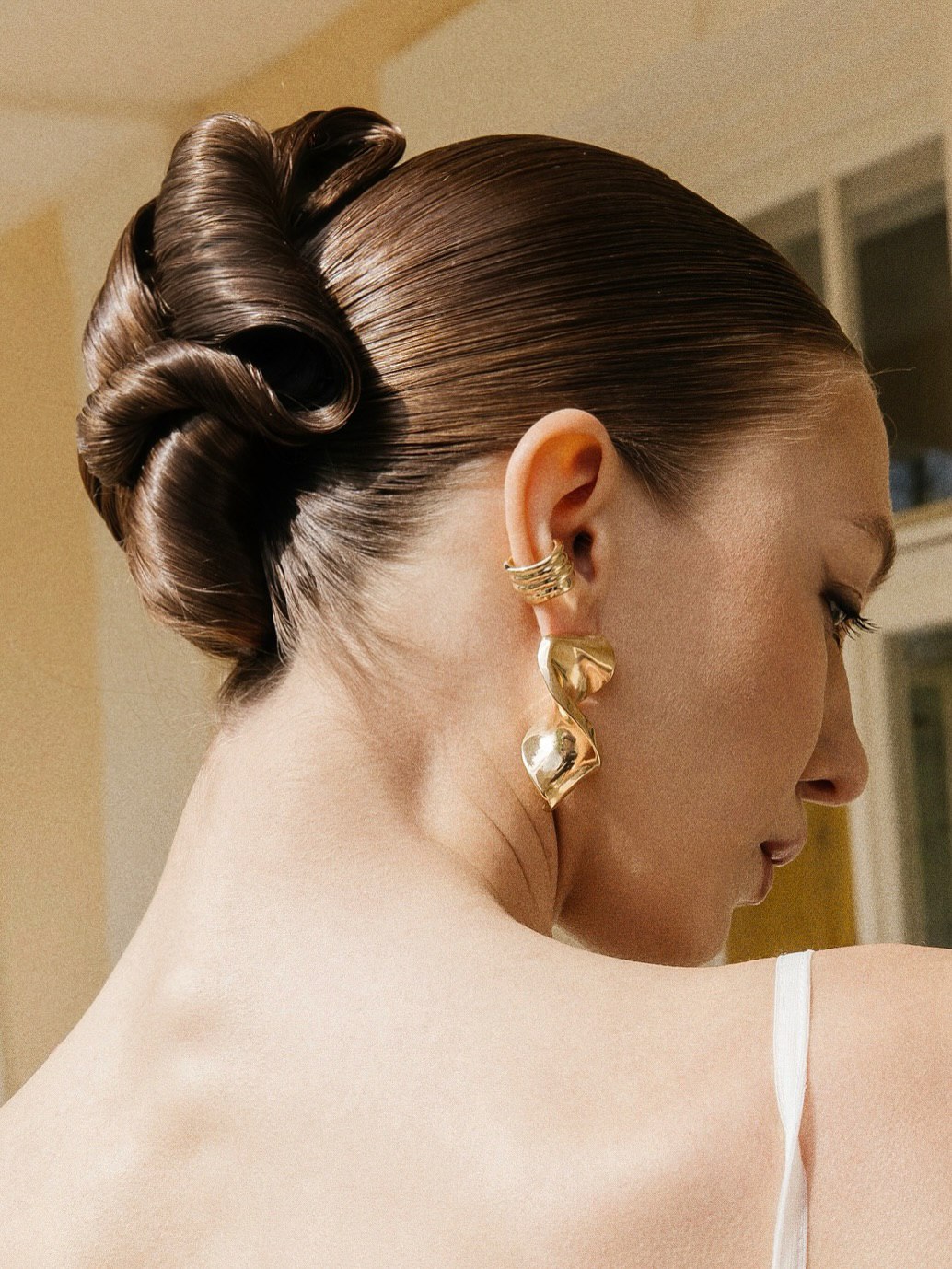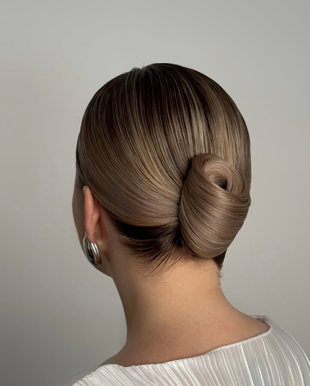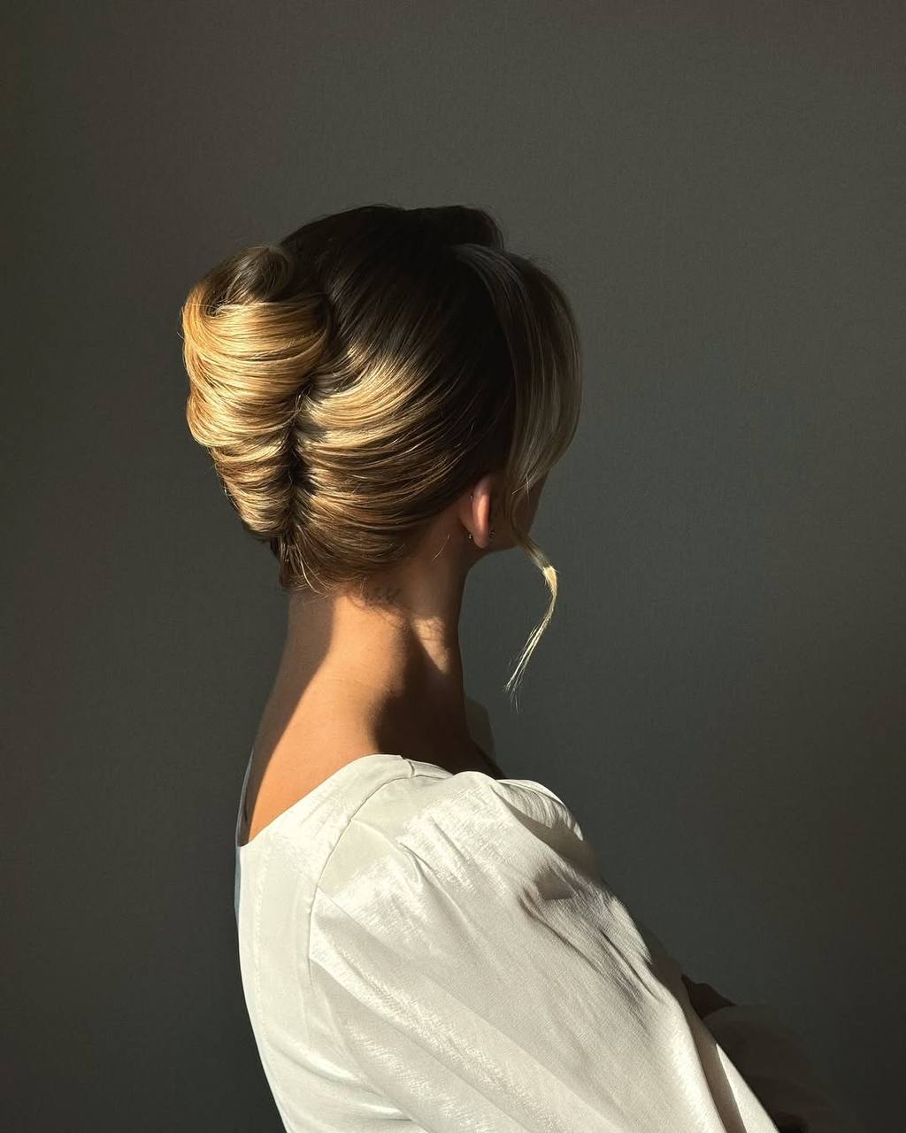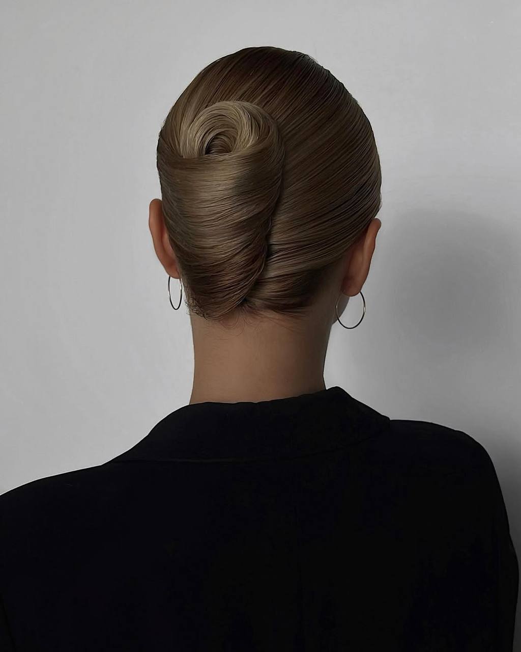 Аккуратно закрученные волосы формируют спиральный узел, напоминающий морскую раковину. Подходит для ретро-образов и платьев с элегантным кроем.