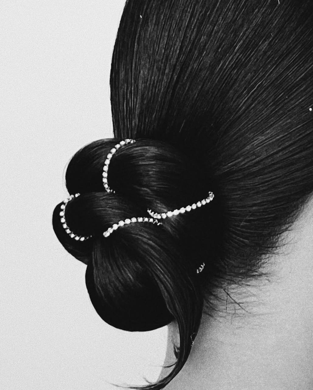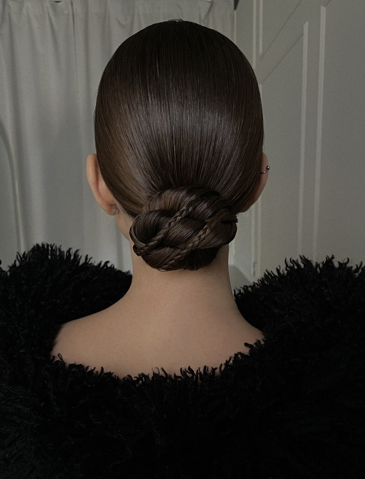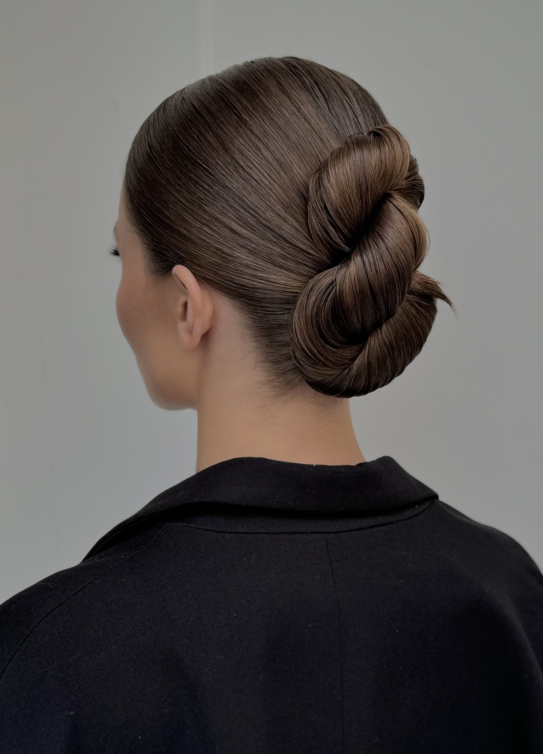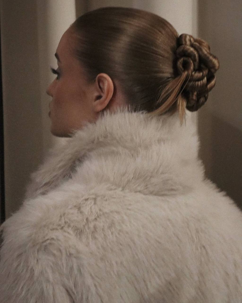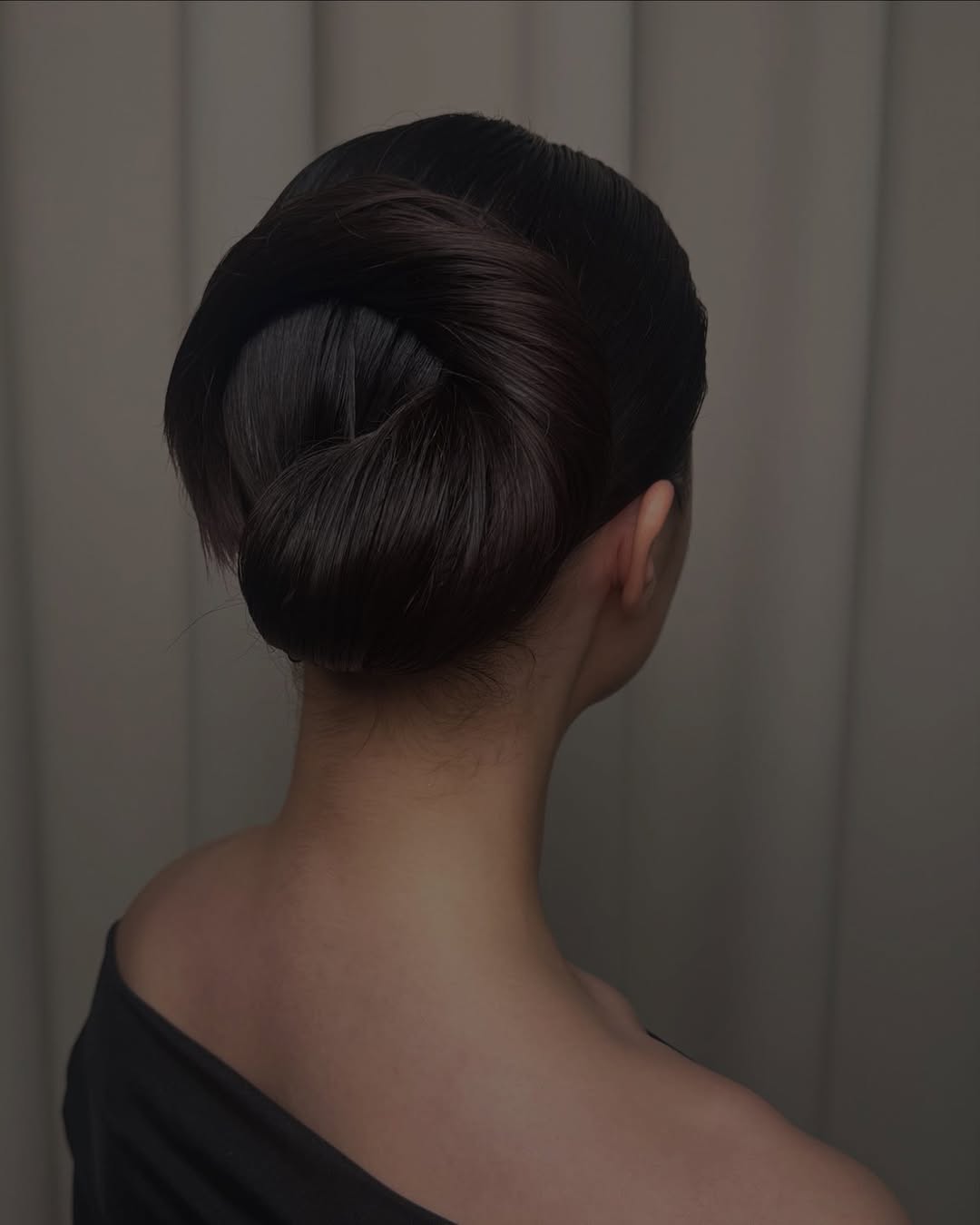 Такой пучок — это идеальный пример того, как минимализм встречается с кутюрной сложностью. Выпущенные пряди ломают строгость и добавляют динамики. Именно эта деталь делает образ не слишком «правильным», а стильным и смелым.