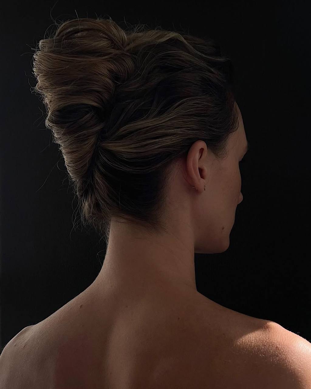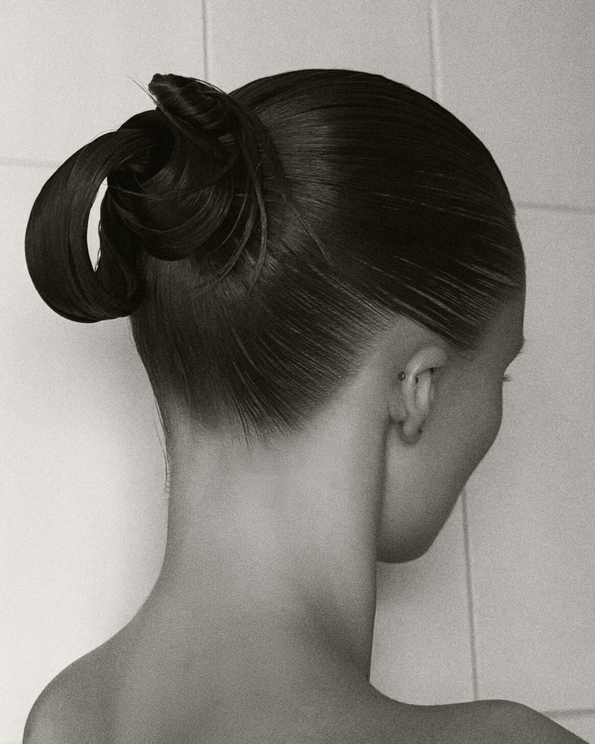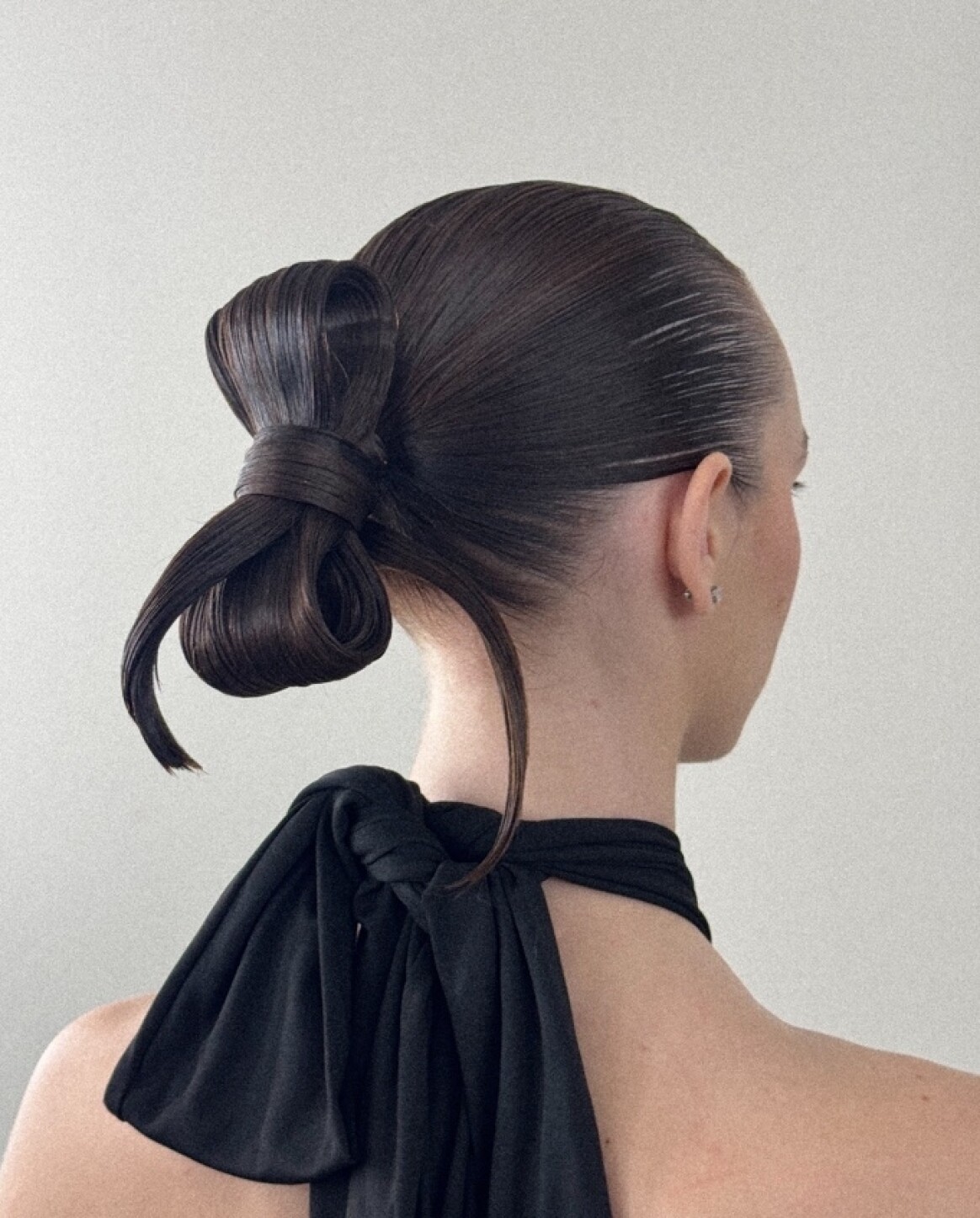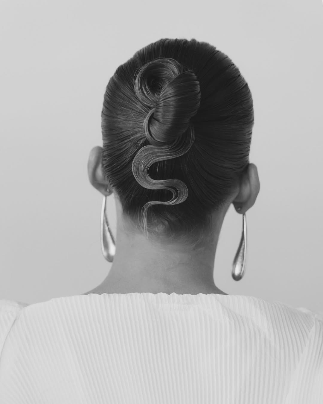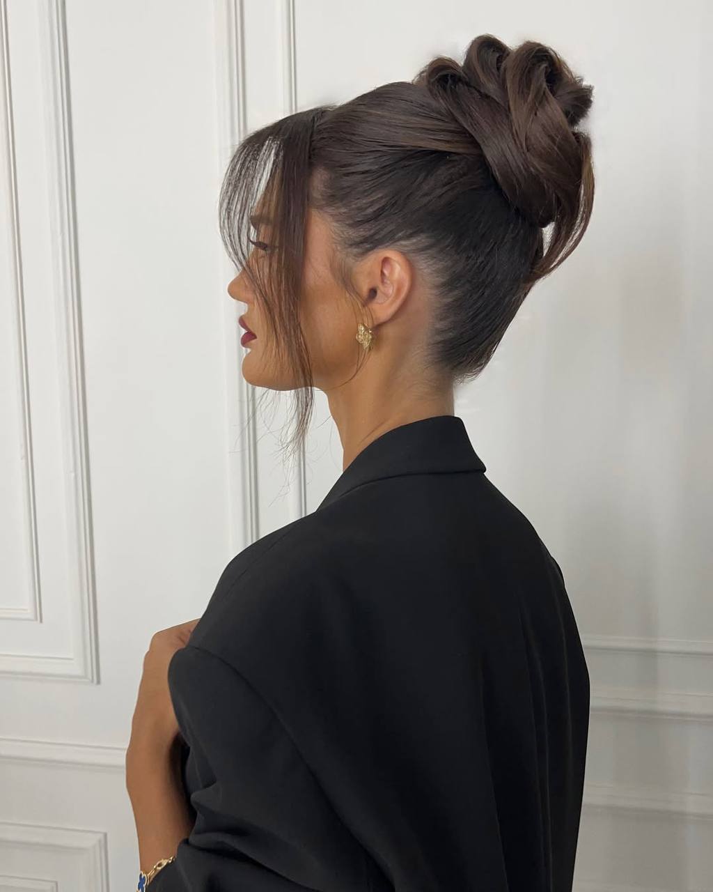 Такой пучок — это идеальный пример того, как минимализм встречается с кутюрной сложностью. Выпущенные пряди ломают строгость и добавляют динамики. Именно эта деталь делает образ не слишком «правильным», а стильным и смелым.