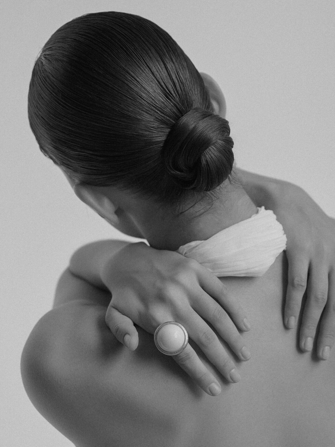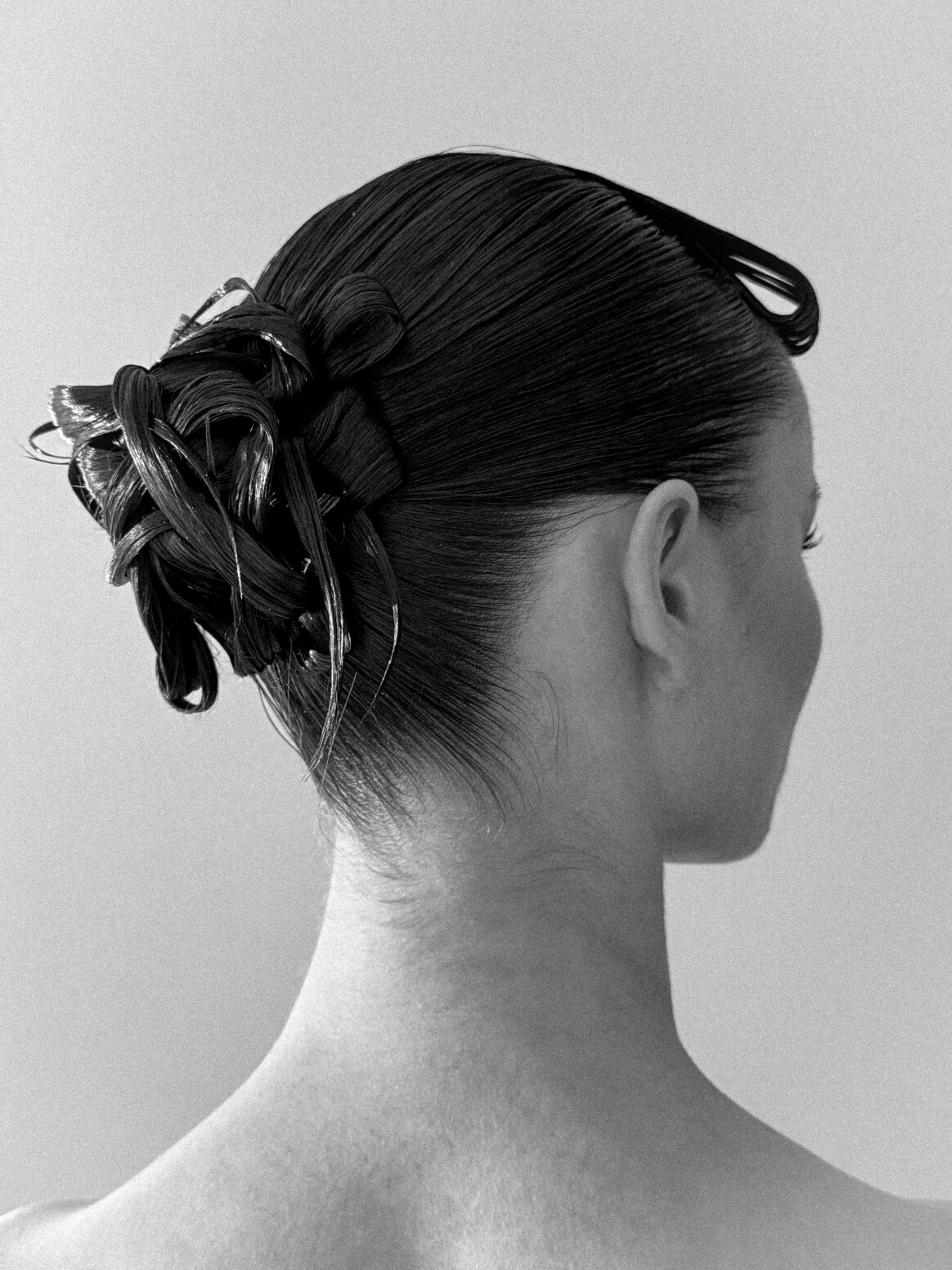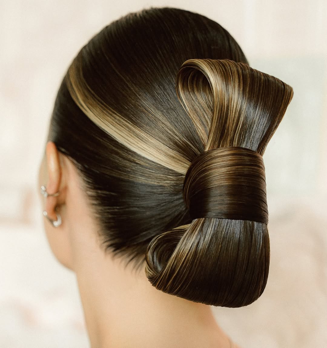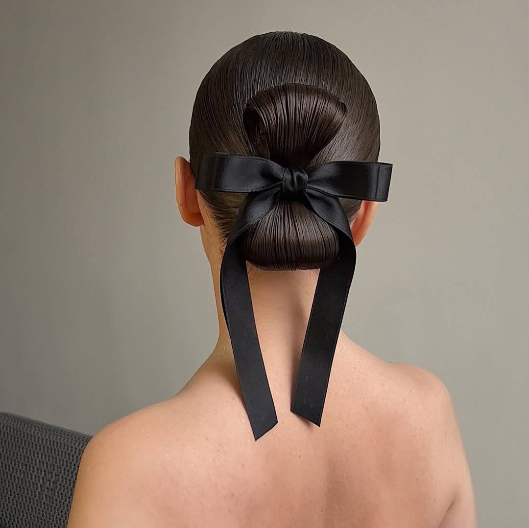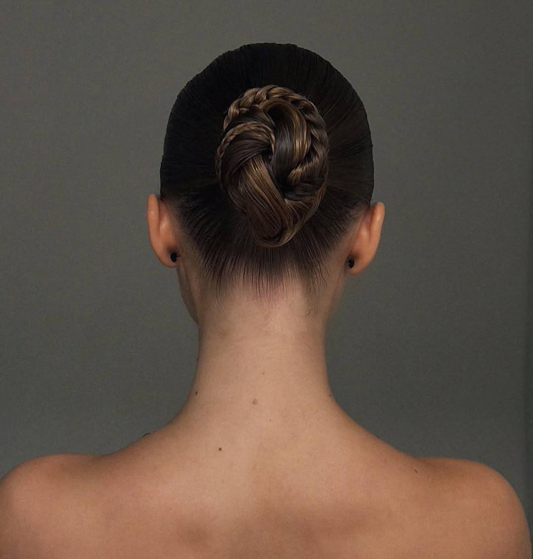 Такой пучок — это идеальный пример того, как минимализм встречается с кутюрной сложностью. Выпущенные пряди ломают строгость и добавляют динамики. Именно эта деталь делает образ не слишком «правильным», а стильным и смелым.