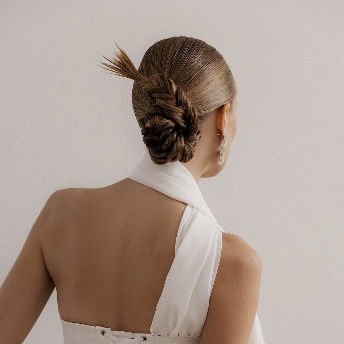 Коса или жгут, вплетённые в узел, создают мягкий орнамент и делают образ более живым. Такой вариант особенно гармоничен в бохо и рустикальной стилистике.