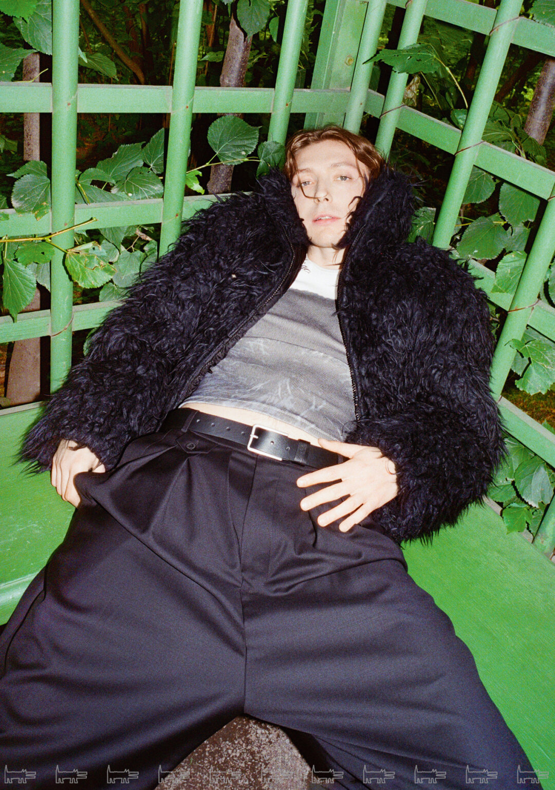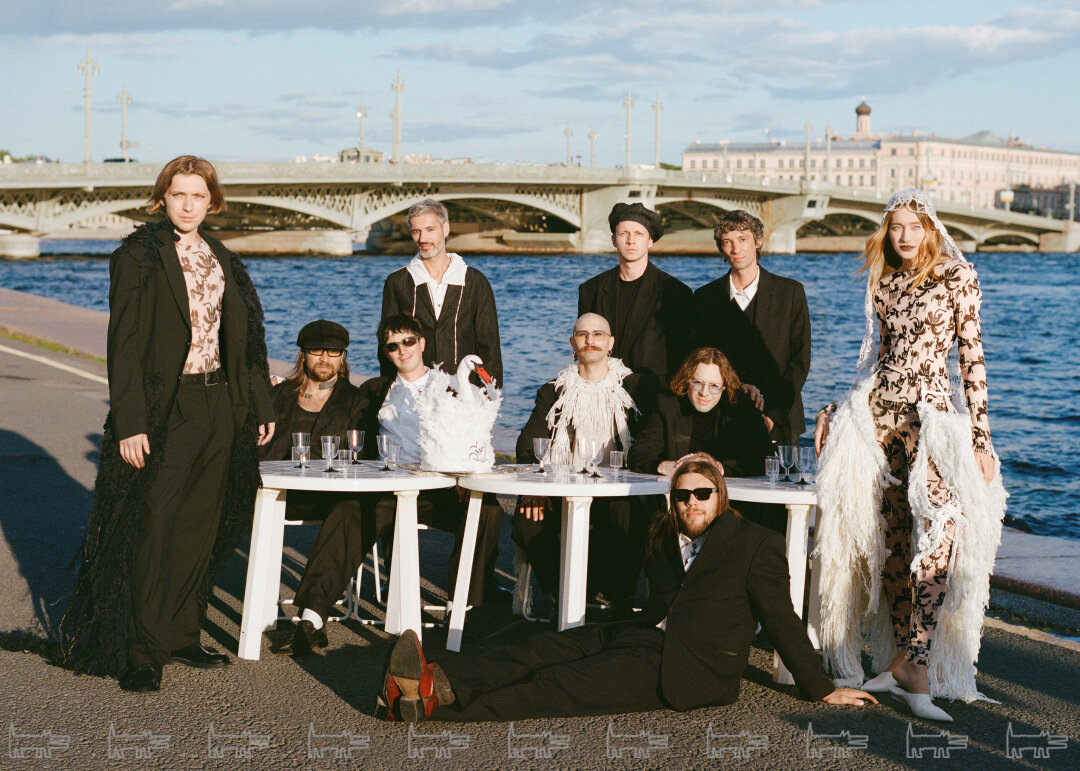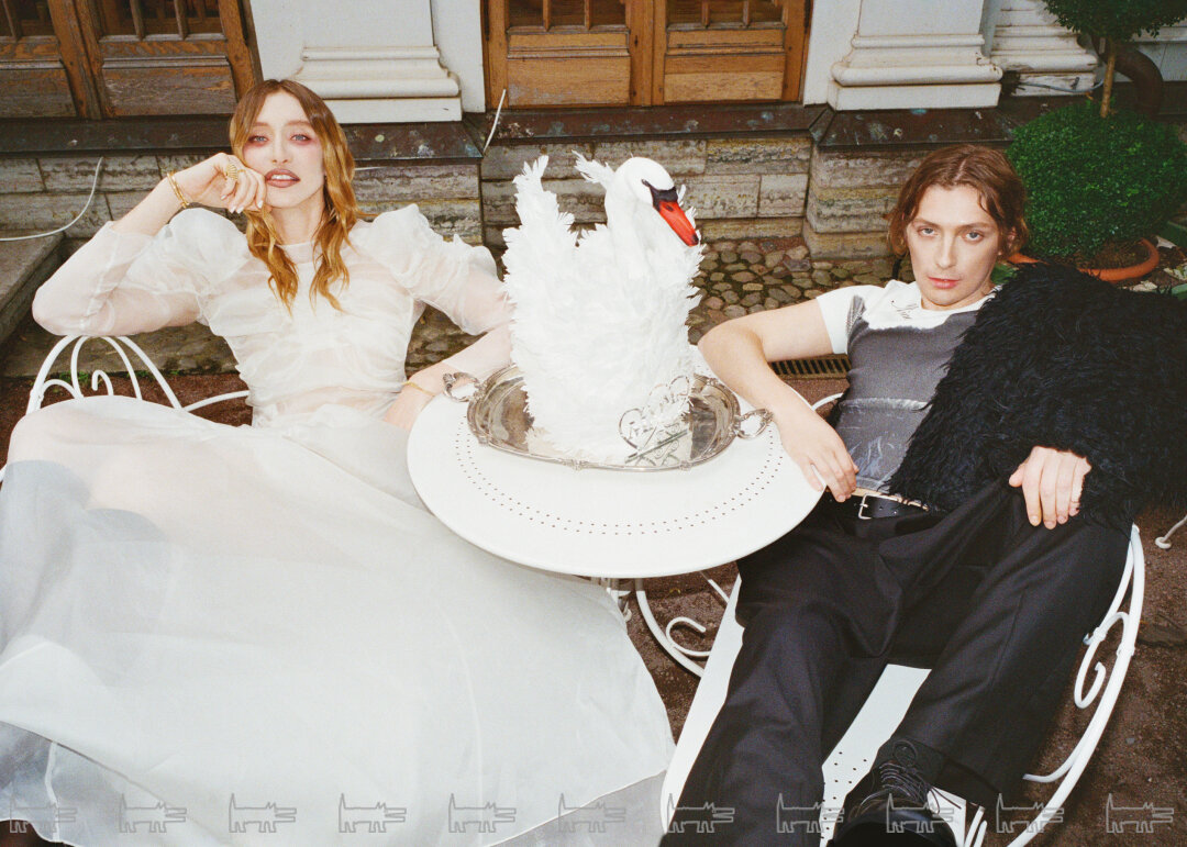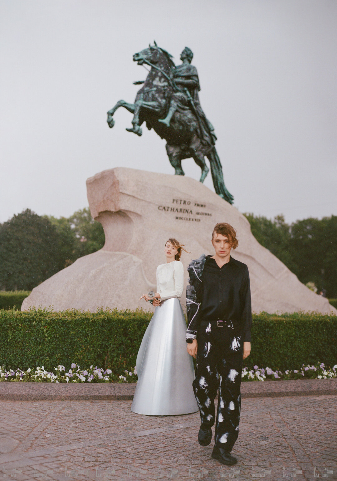 Фотосъёмка продолжилась в летнем саду, где ребята предстали в новых образах. На этот раз на Маше был барочный кокон Neegoosh, дермантиновый кринолин от Софии Медведевой, макабрическое платье-паутина Vereja и металлическая юбка от Сергея Косты. Саша переоделся в шубу BALENCIAGA, топ BLUMARINE, брюки и ремень от USHATAVA.