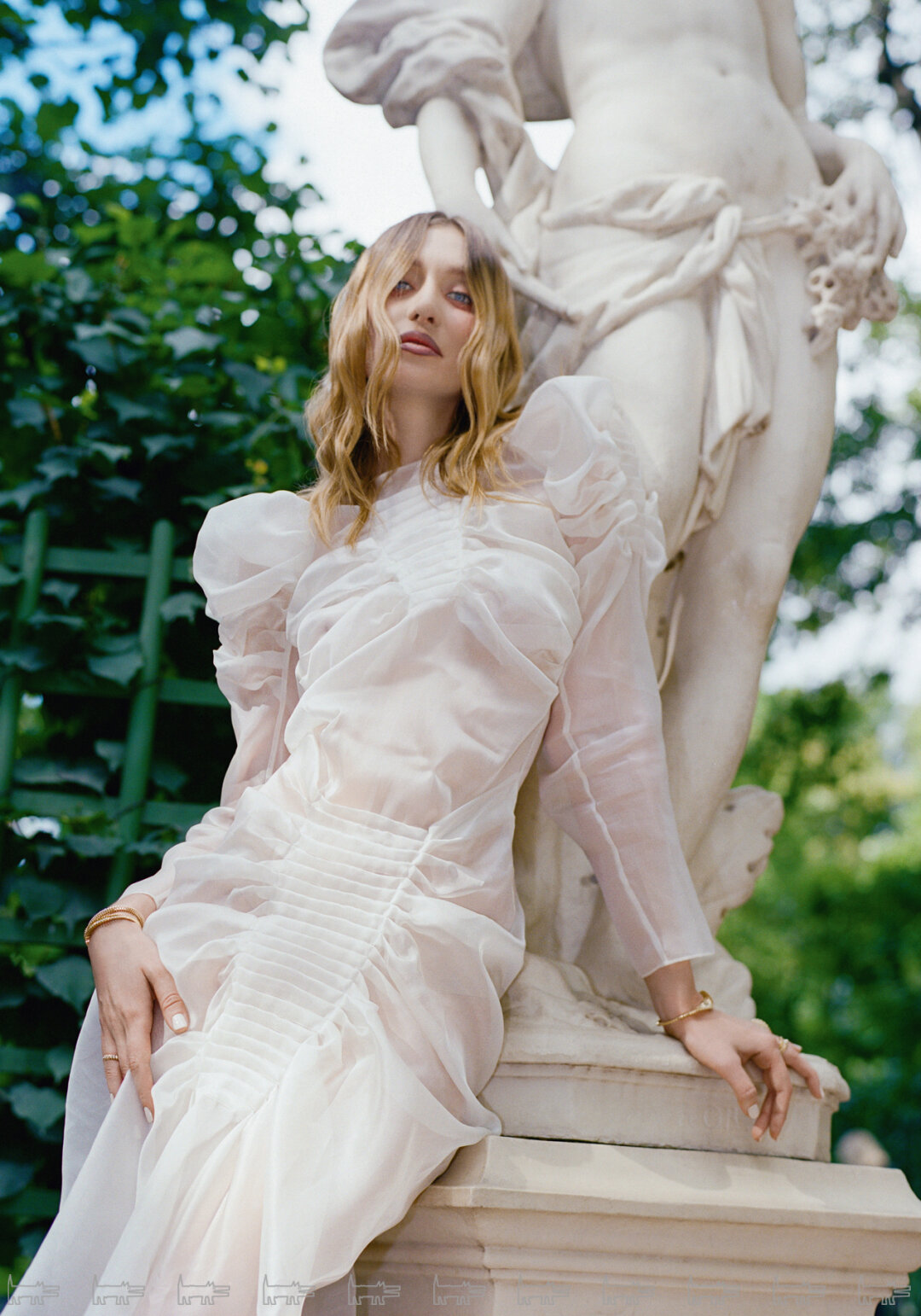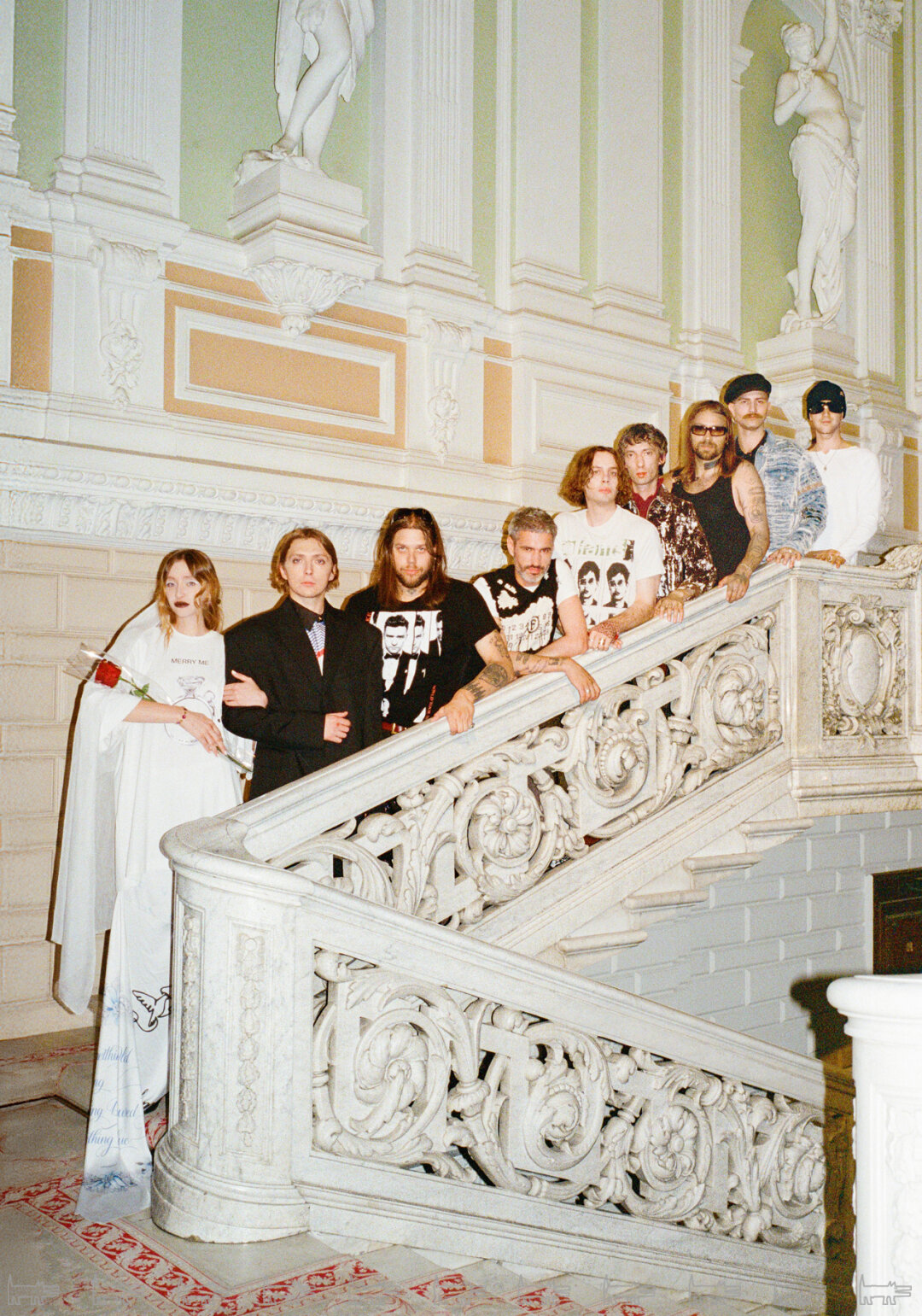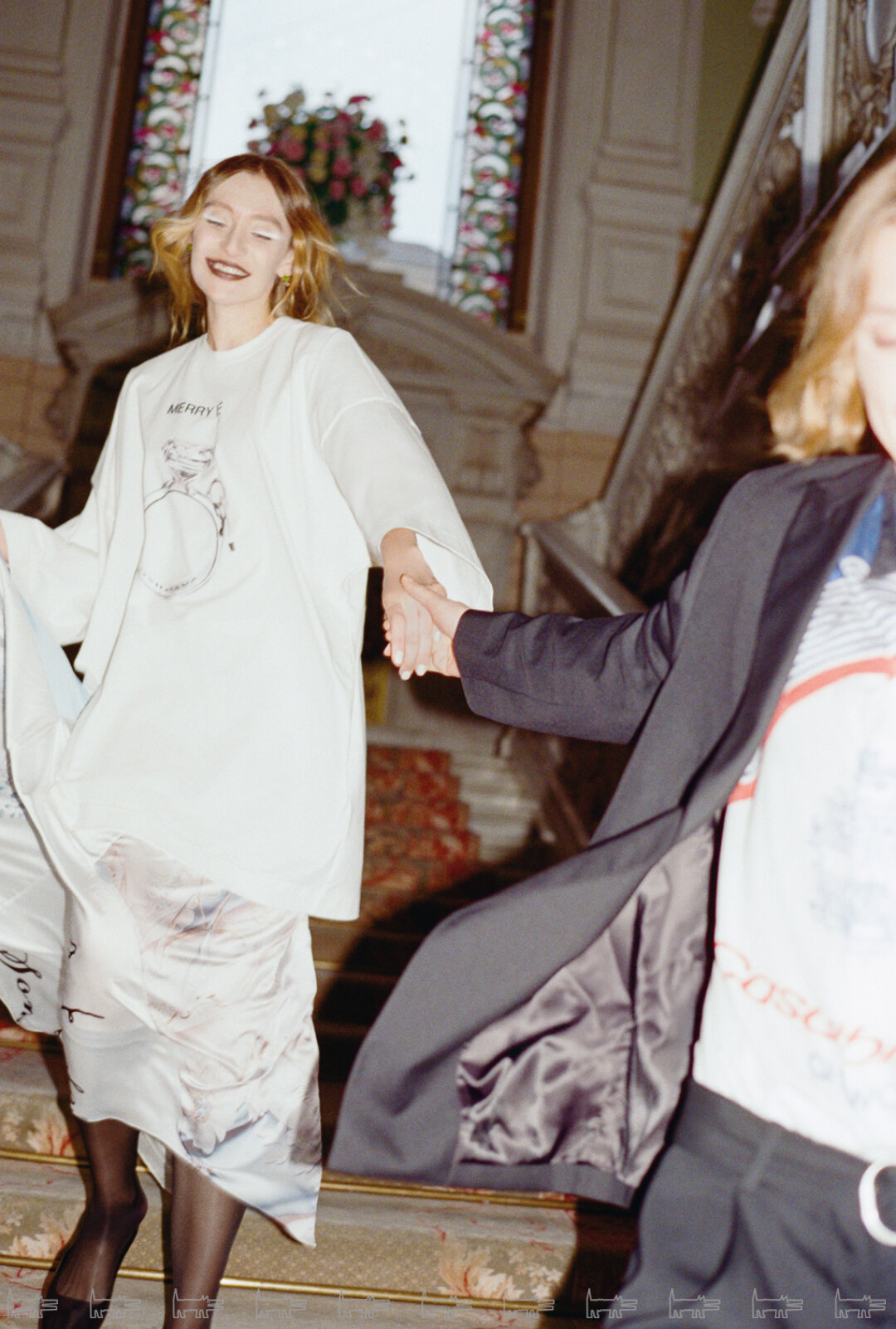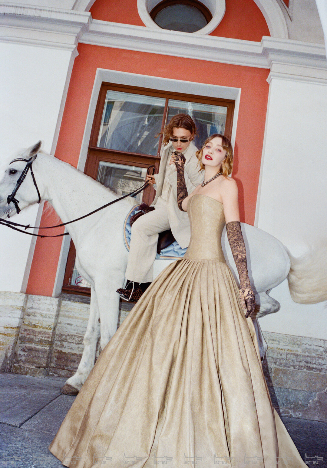 Фотосъёмка продолжилась в летнем саду, где ребята предстали в новых образах. На этот раз на Маше был барочный кокон Neegoosh, дермантиновый кринолин от Софии Медведевой, макабрическое платье-паутина Vereja и металлическая юбка от Сергея Косты. Саша переоделся в шубу BALENCIAGA, топ BLUMARINE, брюки и ремень от USHATAVA.